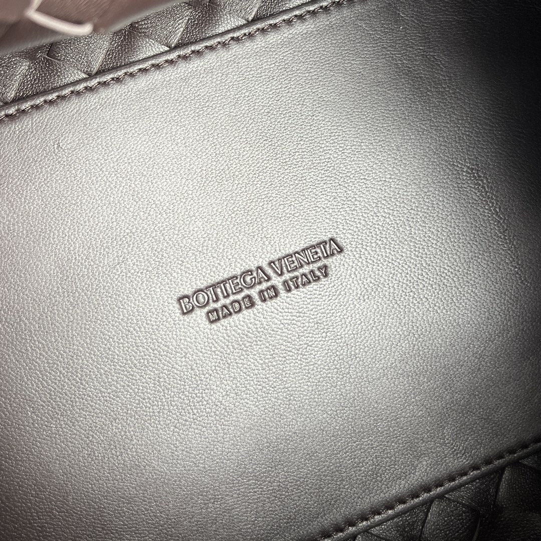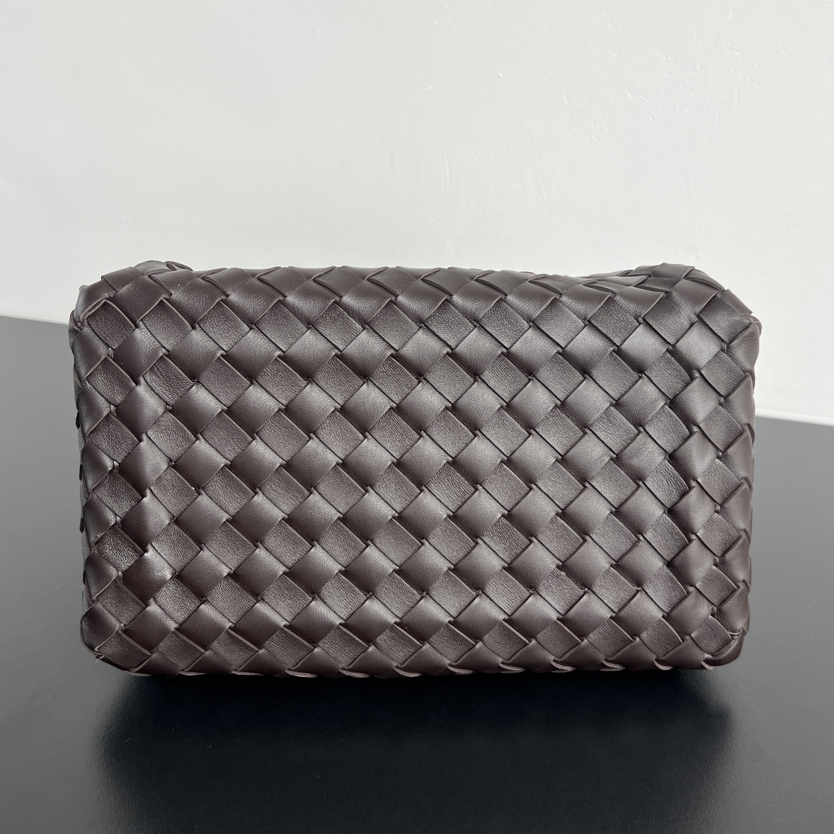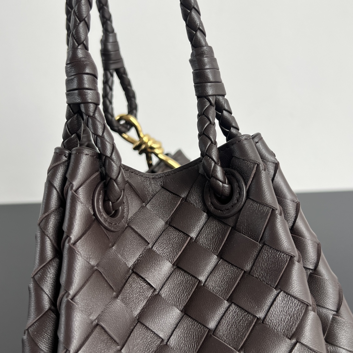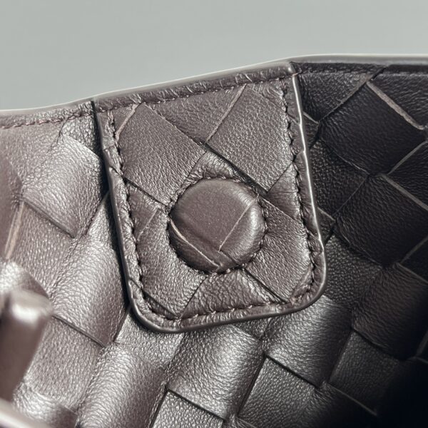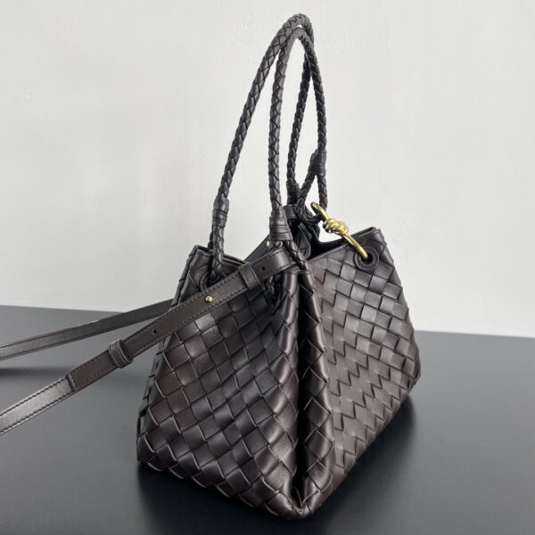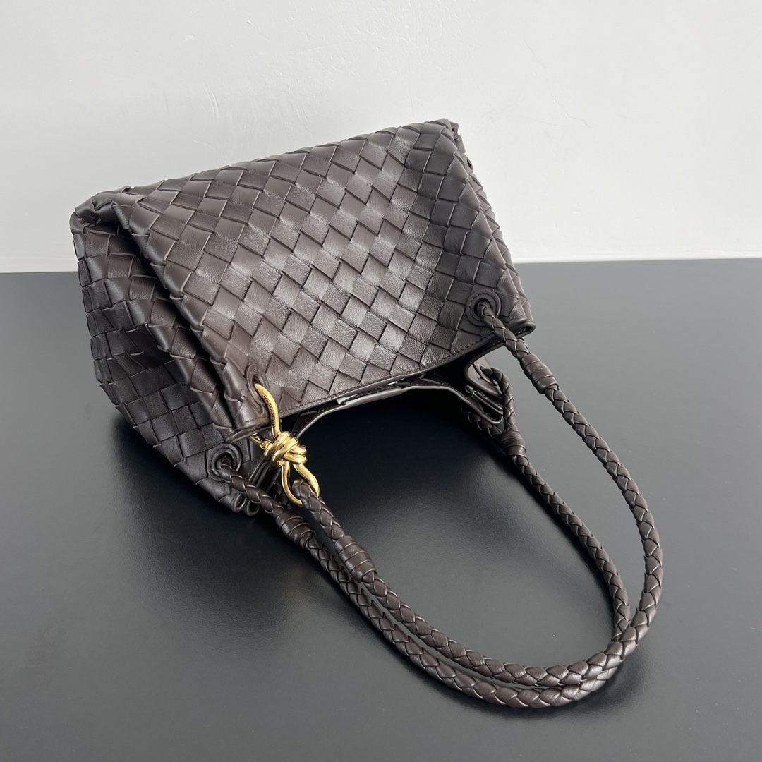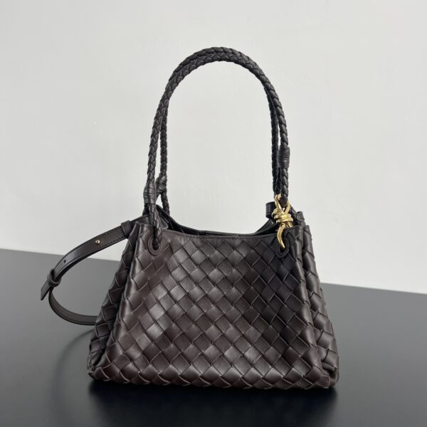 인트레치아토 편직 가죽으로 제작된 숄더백입니다. 고급스러운 브라운 색상과 독특한 디자인이 매력적입니다.