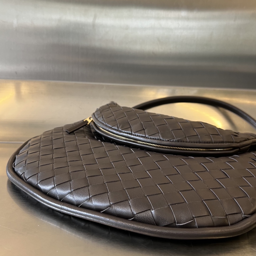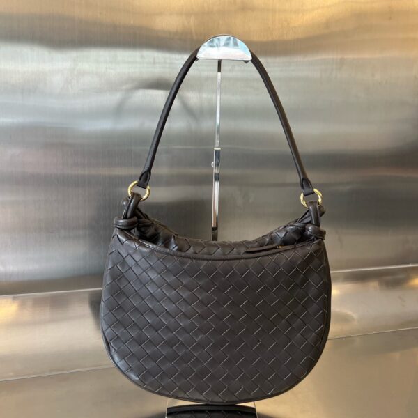 보테가의 젬멜리 더블백은 두 개의 반달형 가방이 조화를 이루는 독특한 디자인입니다.
