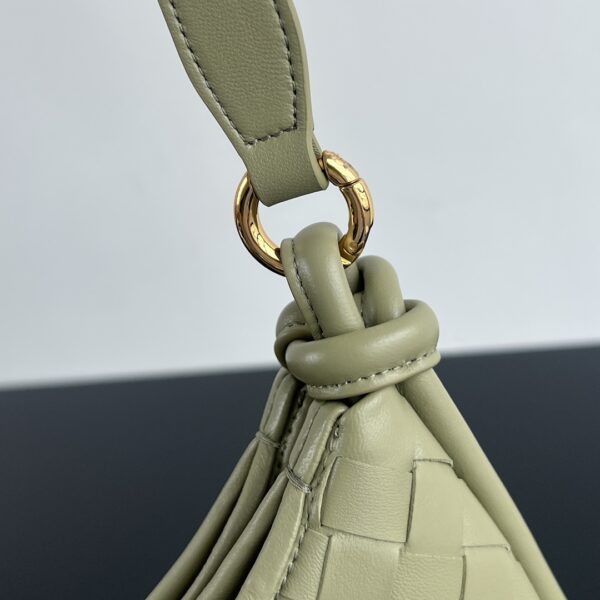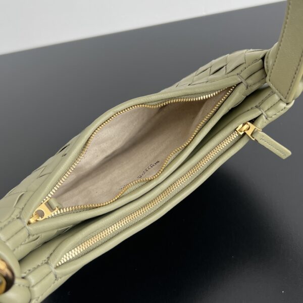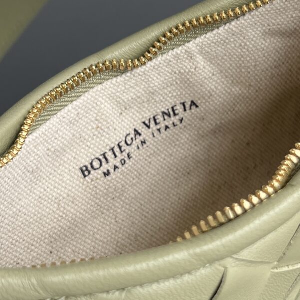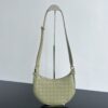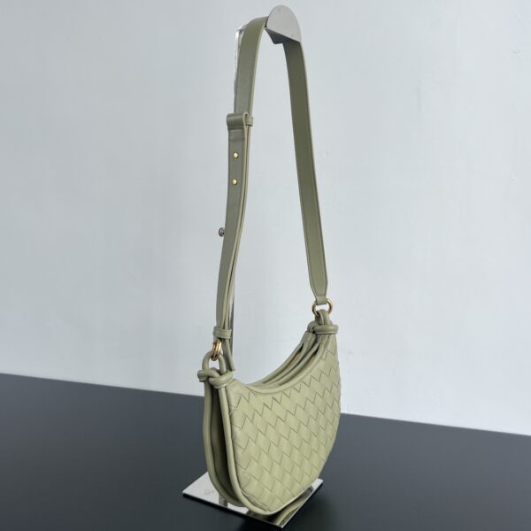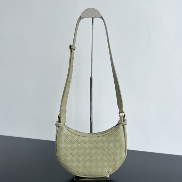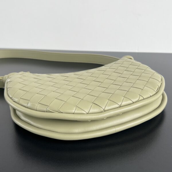 보테가의 젬멜리 반달형 숄더백은 두 개의 반달형 가방이 브랜드의 클래식한 끈으로 연결된 독특한 디자인이 특징입니다.