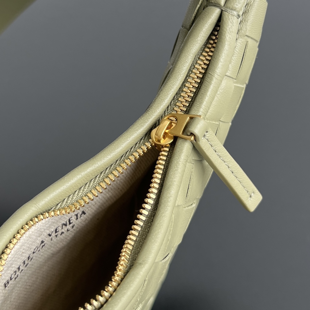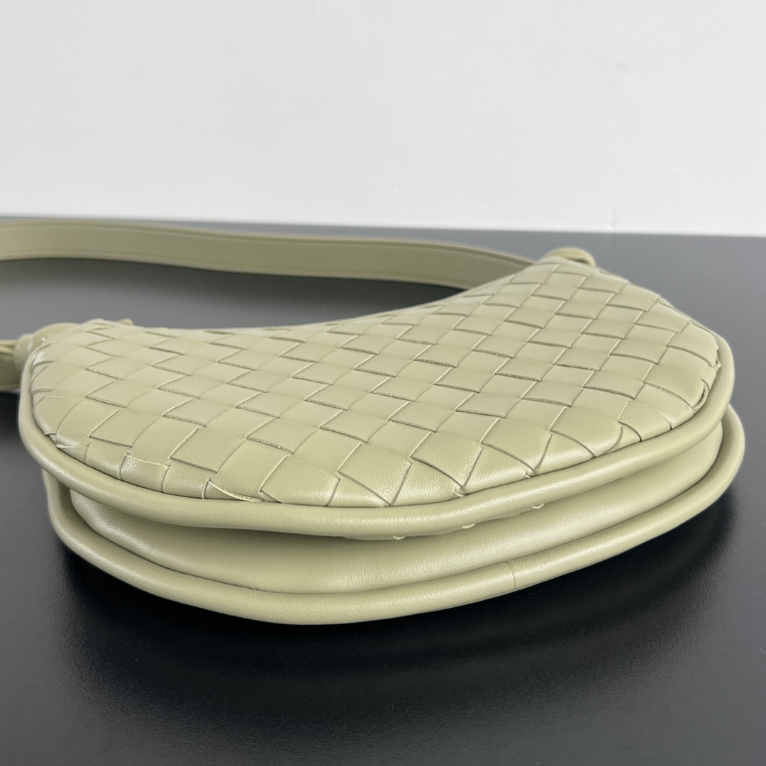 보테가의 젬멜리 반달형 숄더백은 두 개의 반달형 가방이 브랜드의 클래식한 끈으로 연결된 독특한 디자인이 특징입니다.