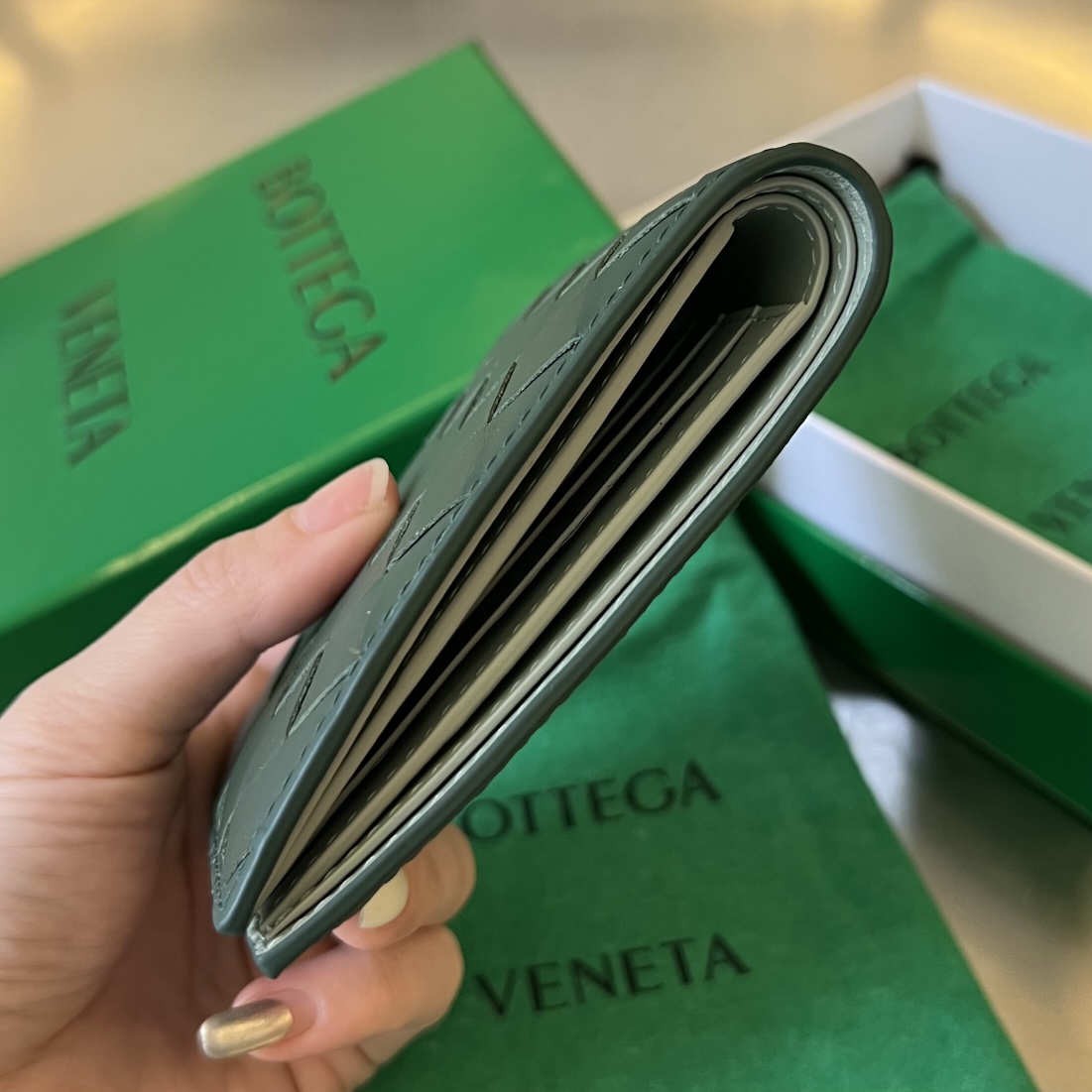 고급스러운 손길을 느낄 수 있는 보테가의 중간 너비 편직 단지갑입니다.