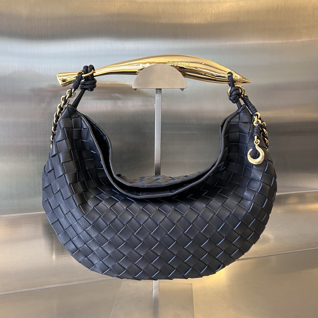 최고급 양가죽으로 제작된 반달형 가방은 부드러운 촉감을 자랑하며, 세부적인 디테일이 돋보이는 스타일입니다.