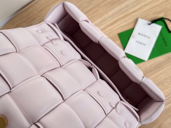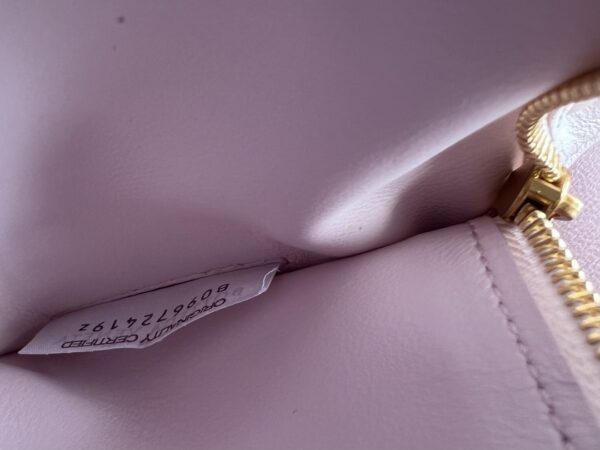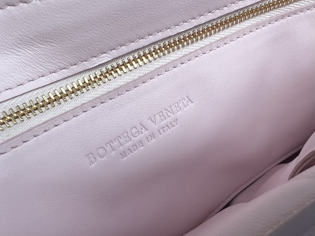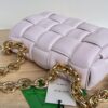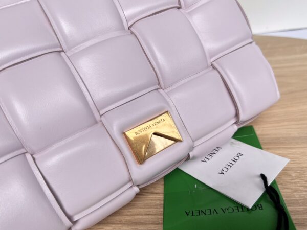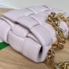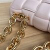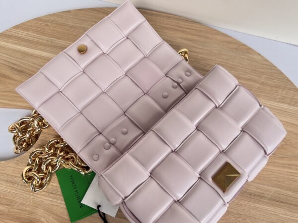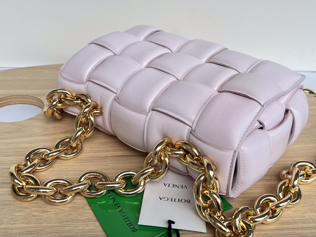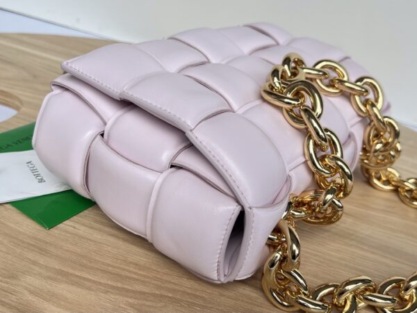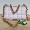 부드러운 핑크 컬러의 체인 숄더백으로, 세련된 디자인이 돋보입니다.