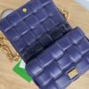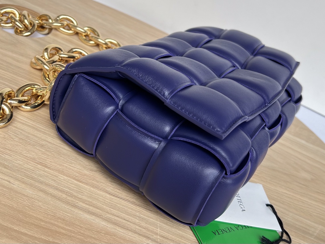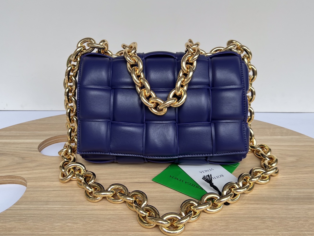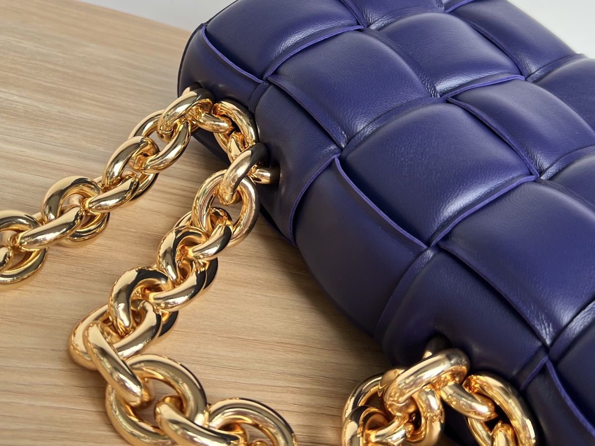 고급스러운 네이비 색상과 함께 금색 체인이 조화를 이루어 세련된 느낌을 줍니다.