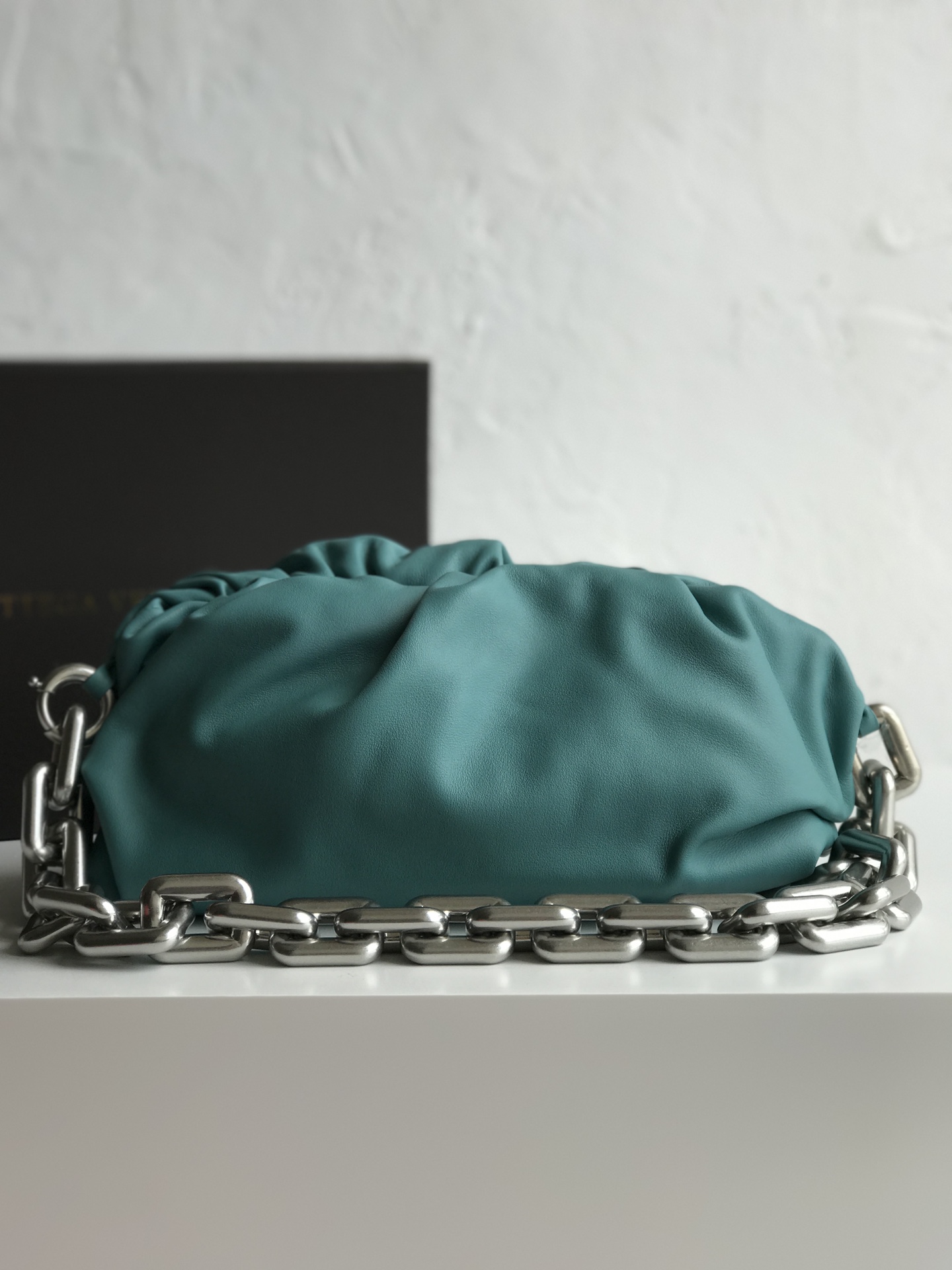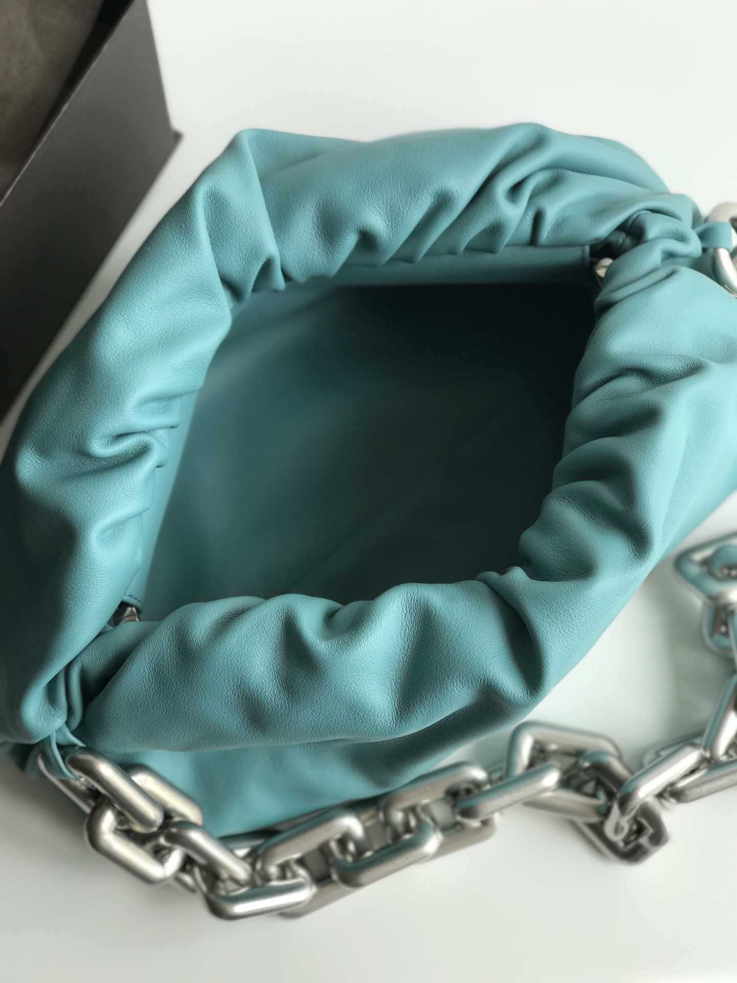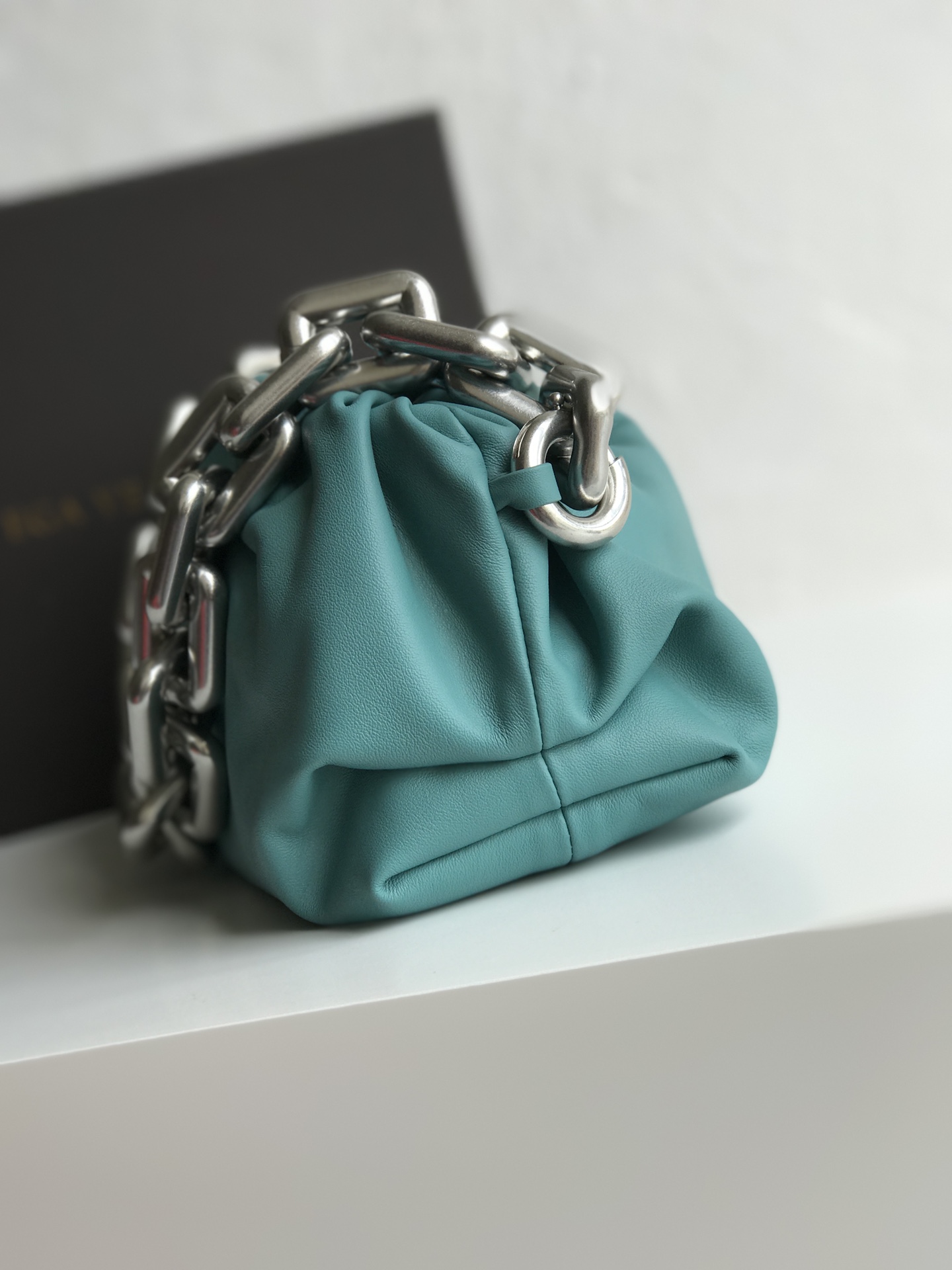 부드러운 패브릭 소재로 제작된 체인 파우치 클라우드 백은 고급스러운 그린 컬러가 매력적입니다.