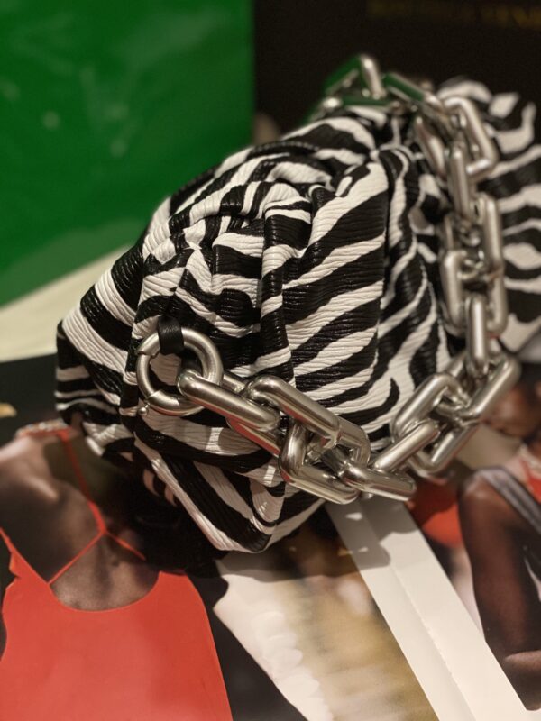 부드러운 패브릭과 고급스러운 금속 체인이 조화를 이루는 보테가의 체인 파우치 클라우드 백입니다.