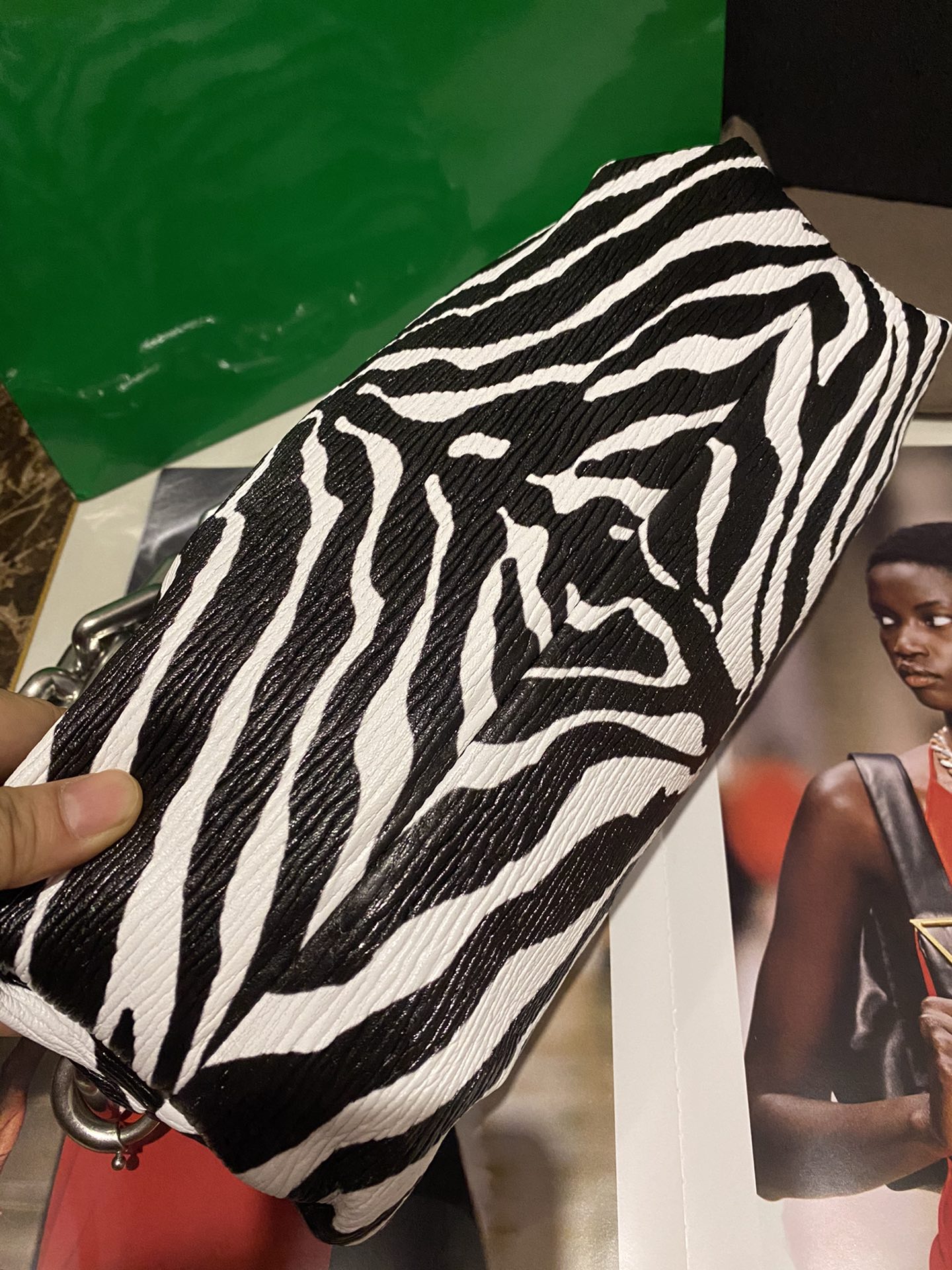 금색의 체인 스트랩은 어깨에 걸치거나 팔 아래에 클러치처럼 들 수 있어 다양한 활용이 가능합니다. 실용성과 스타일을 모두 갖춘 이 백은 데일리 룩에 포인트를 더해줄 아이템입니다.