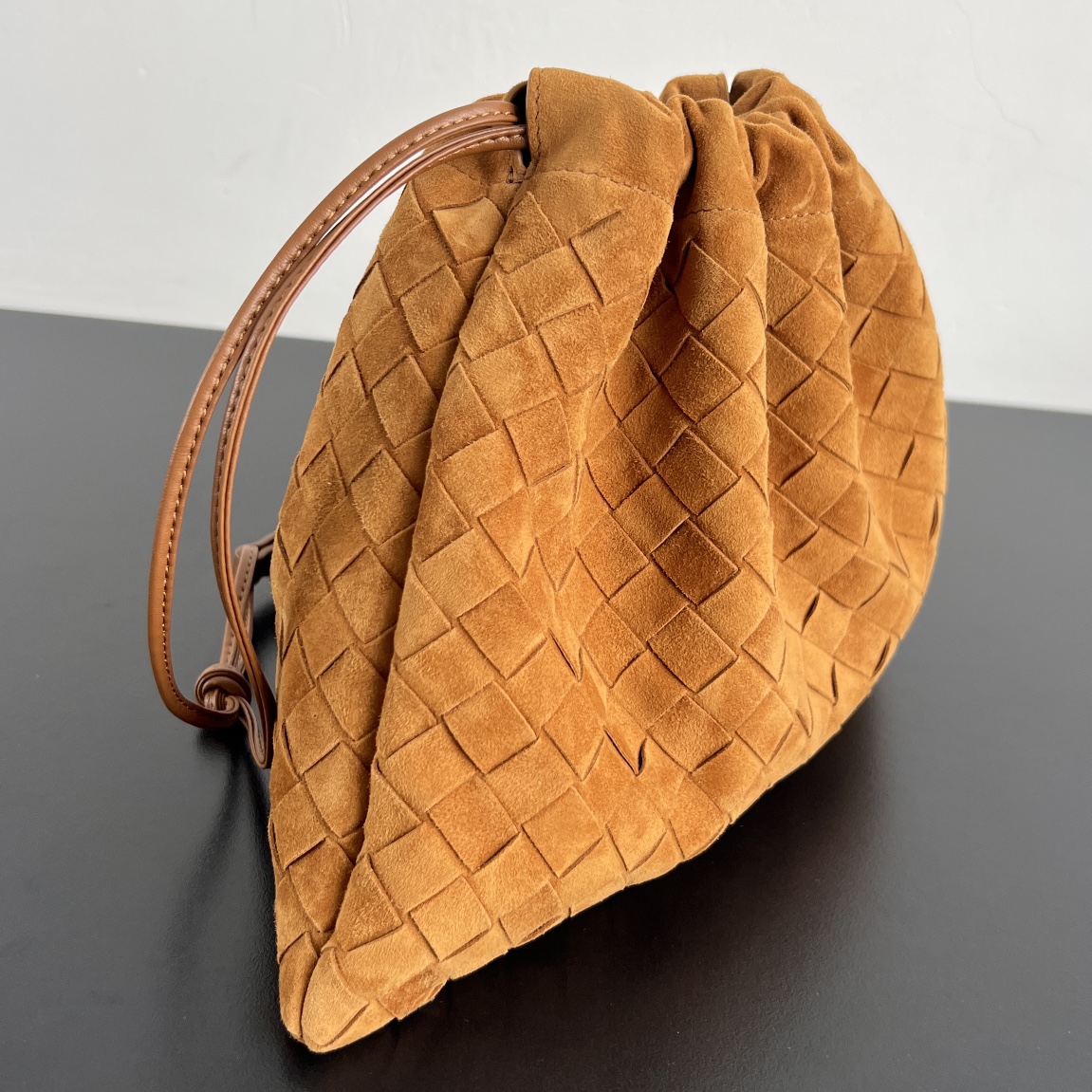 부드러운 소가죽으로 제작된 이 더스트백은 클래식한 편직 디자인이 돋보입니다.