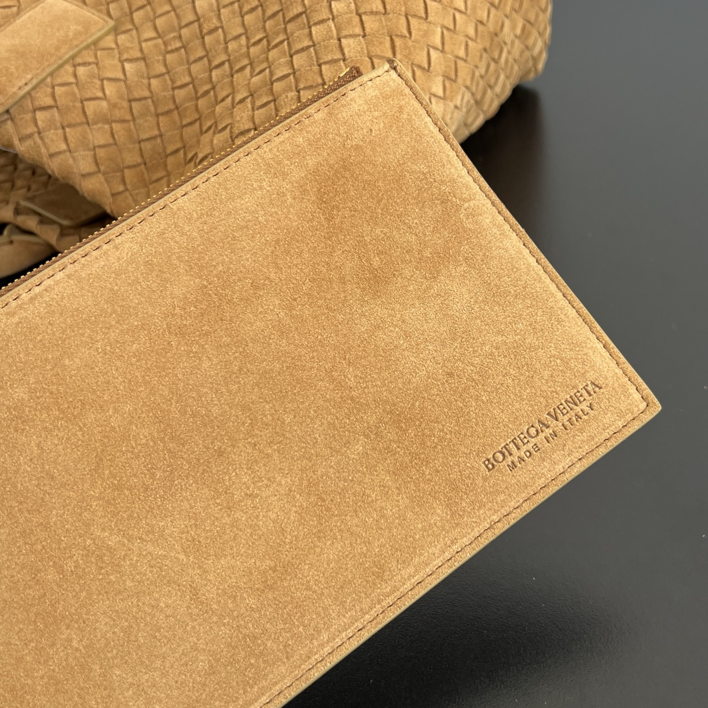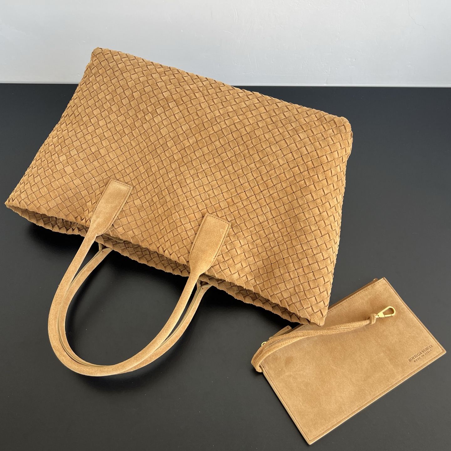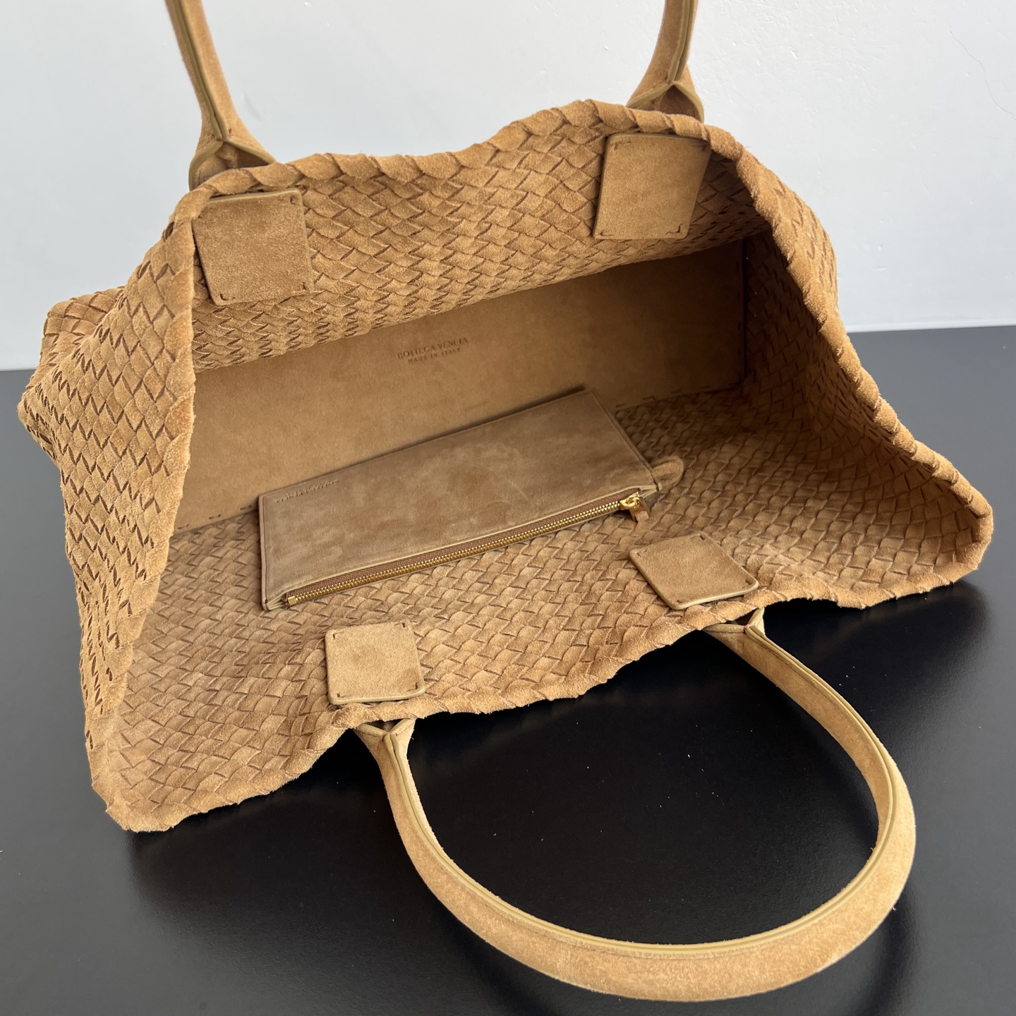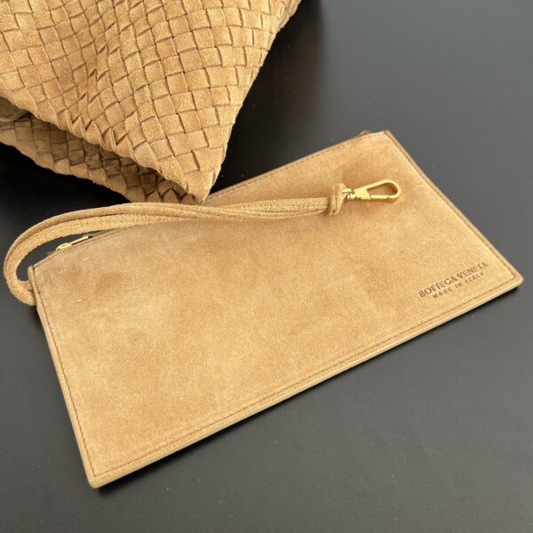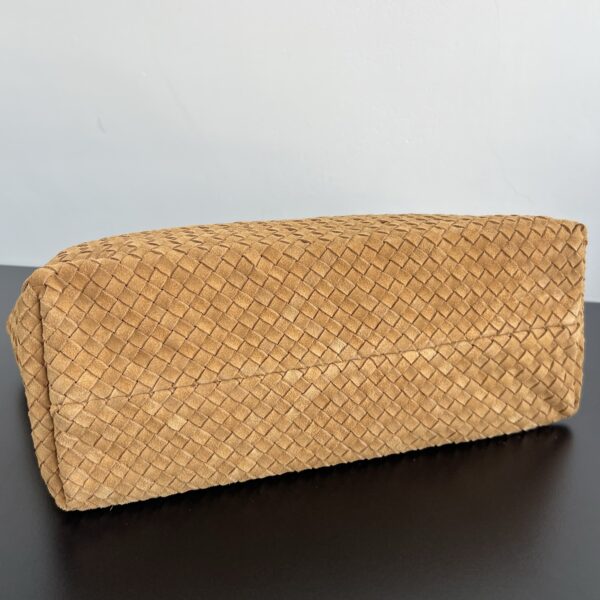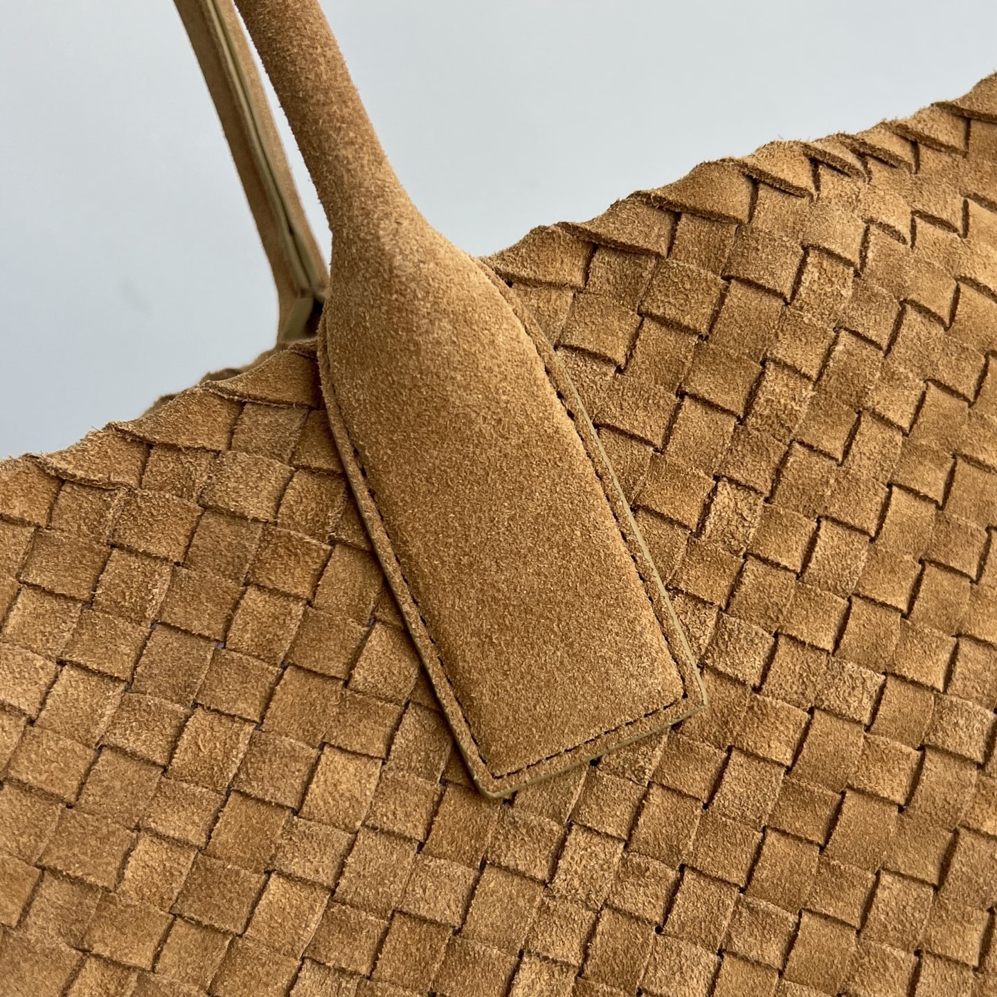부드러운 양가죽 소재로 제작된 카바트 쇼핑백입니다. 전통적인 엮음 방식으로 완성된 이 가방은 고급스러운 질감을 자랑합니다.