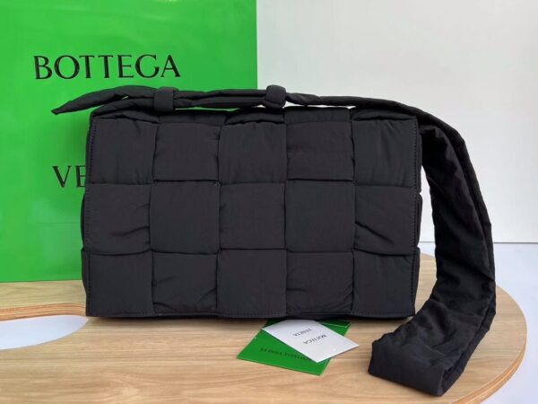 보테가의 카세트 백은 귀여운 외관과 뛰어난 실용성을 자랑합니다. 넉넉한 수납 공간으로 일상적인 사용에 적합하며, 부드러운 나일론 소재가 고급스러움을 더합니다.