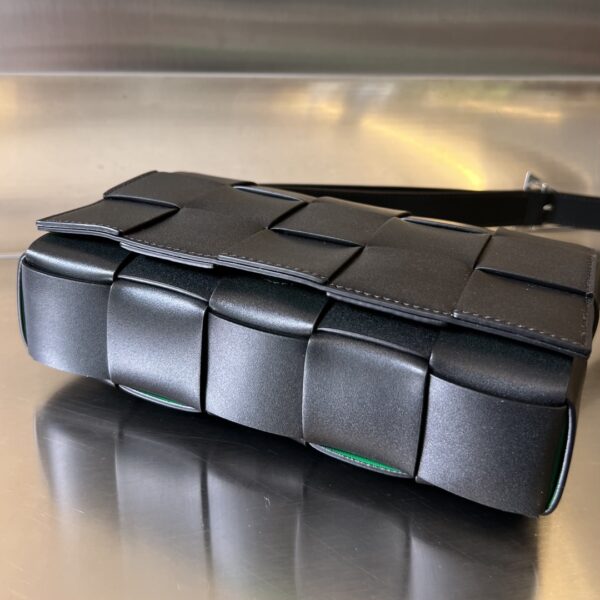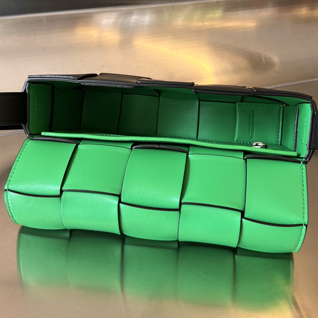 보테가의 카세트 백은 독특한 파로트 그린 색상으로 시선을 사로잡습니다.