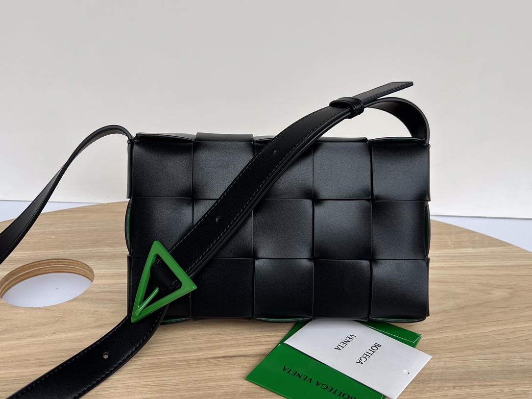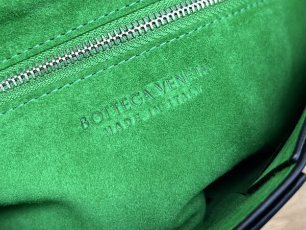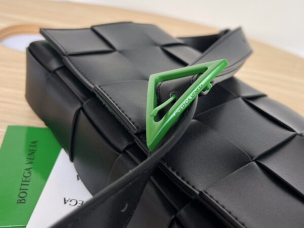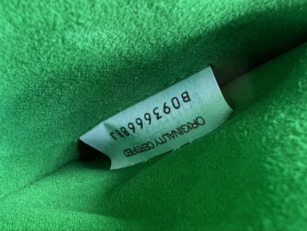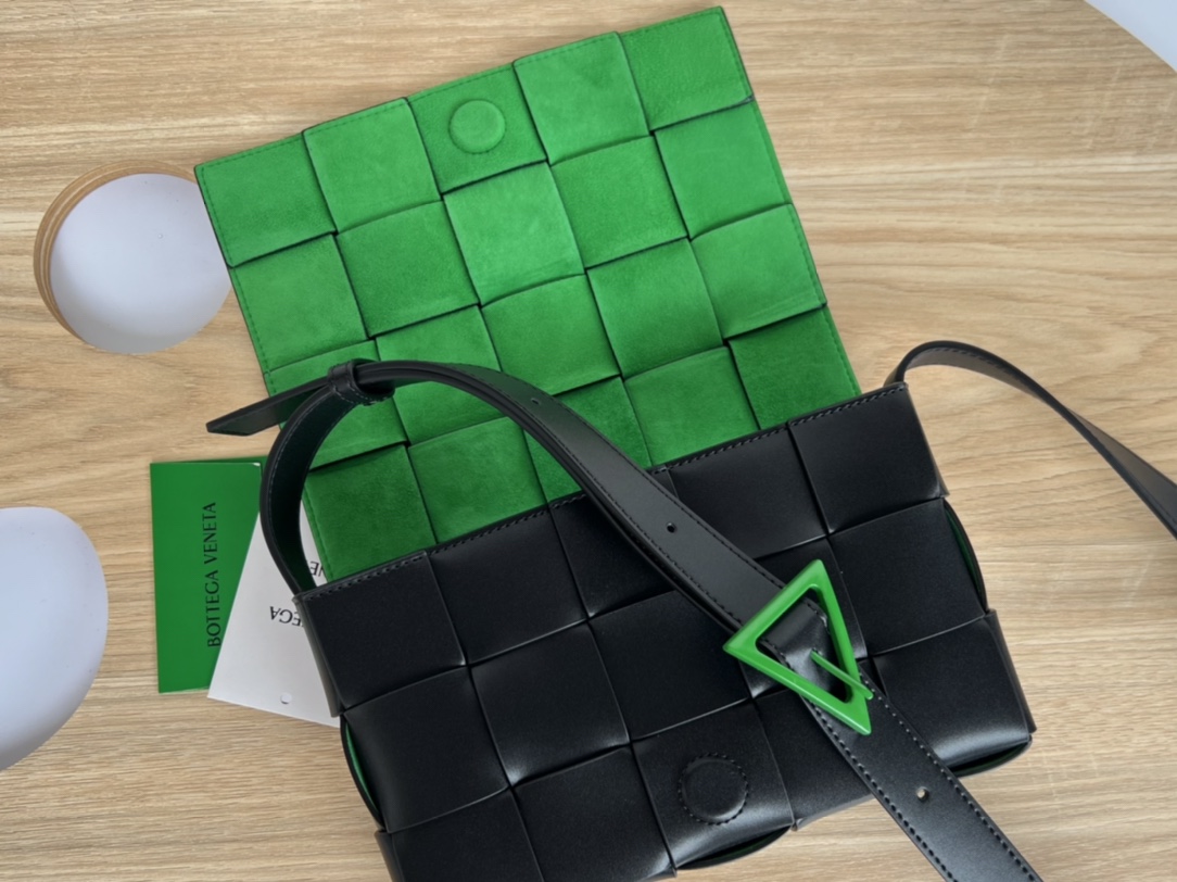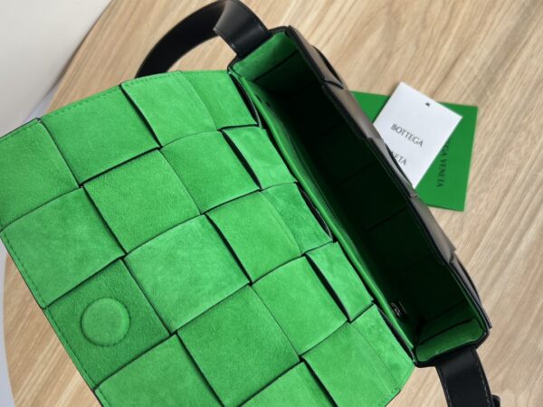 보테가의 카세트 숄더백은 독특한 파라다이스 그린 색상으로 시선을 사로잡습니다.
