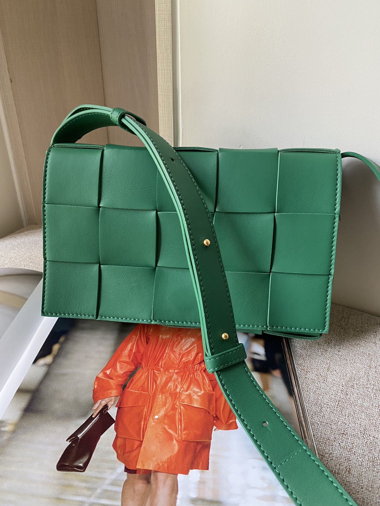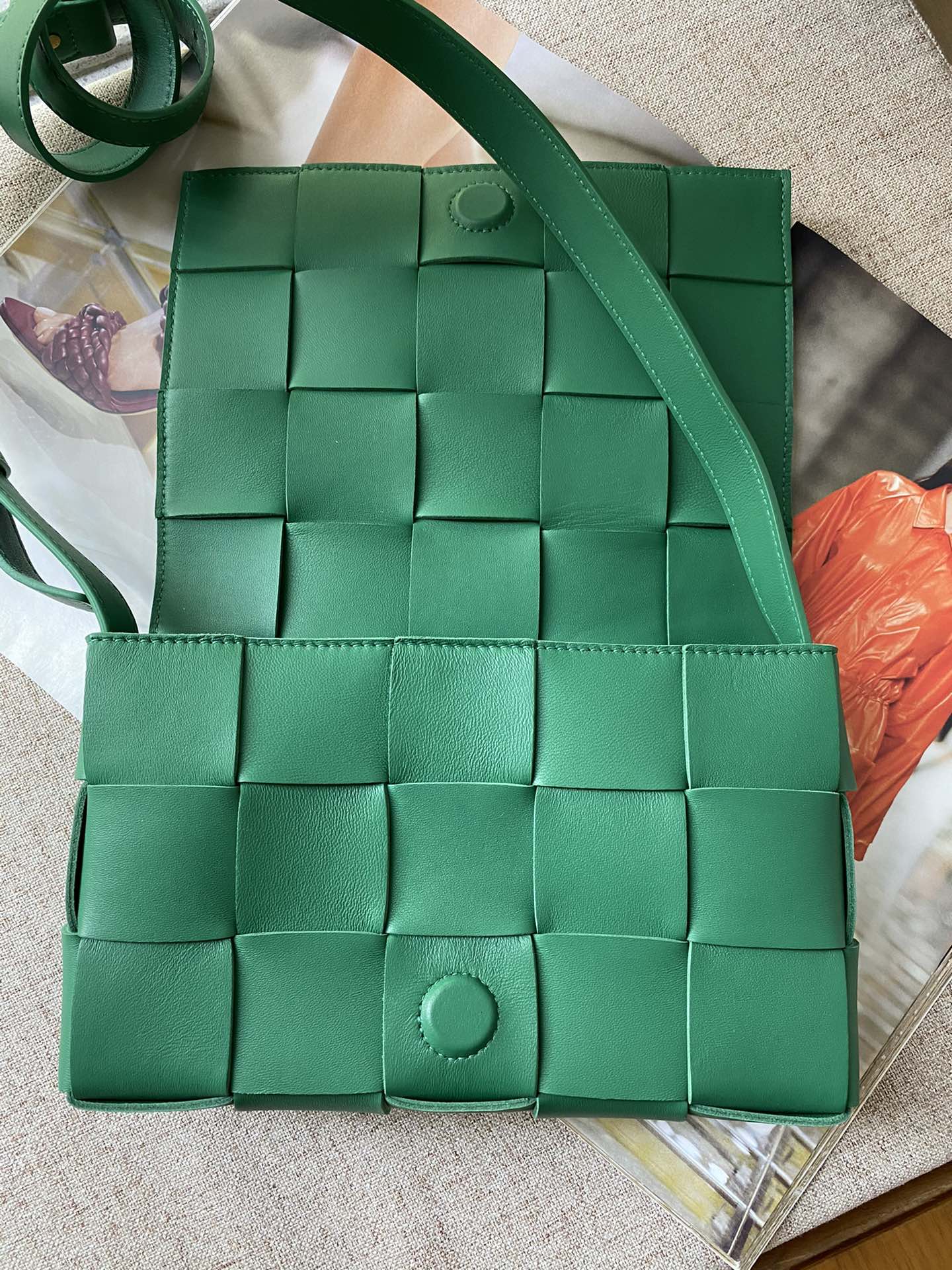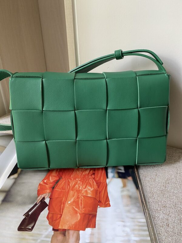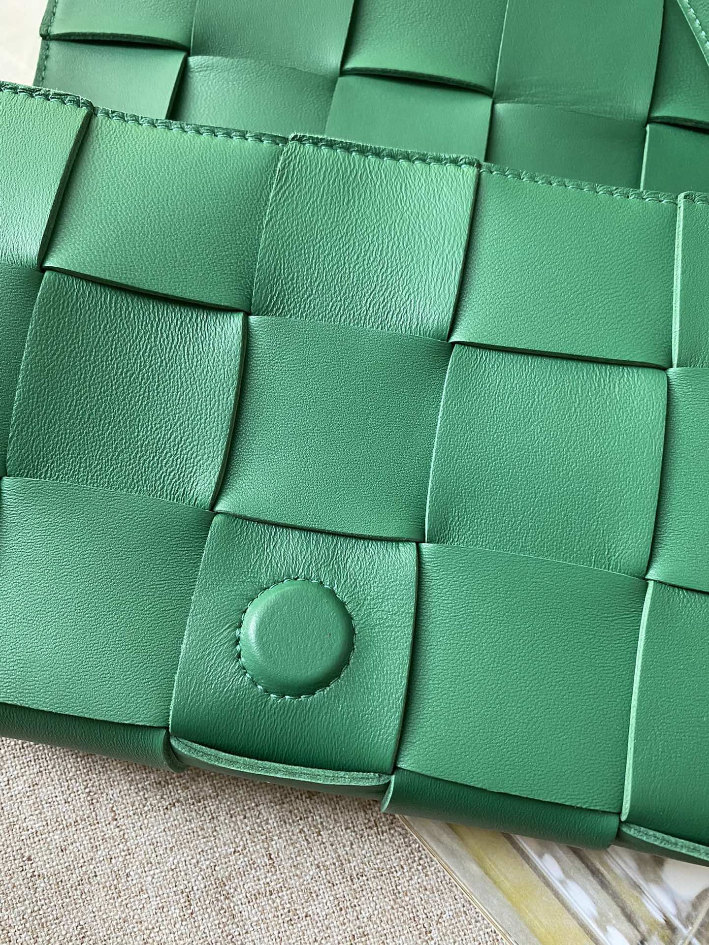 부드러운 양가죽 소재로 제작된 카세트 위빙 파우치는 고급스러운 느낌을 줍니다.