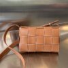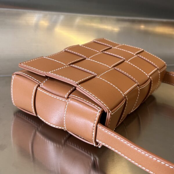 보테가의 카세트 크로스백은 클래식한 편직 디자인과 화이트 스티치가 조화를 이루어 동적인 공예미와 재미있는 스타일을 강조합니다.