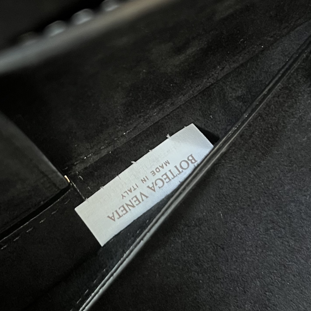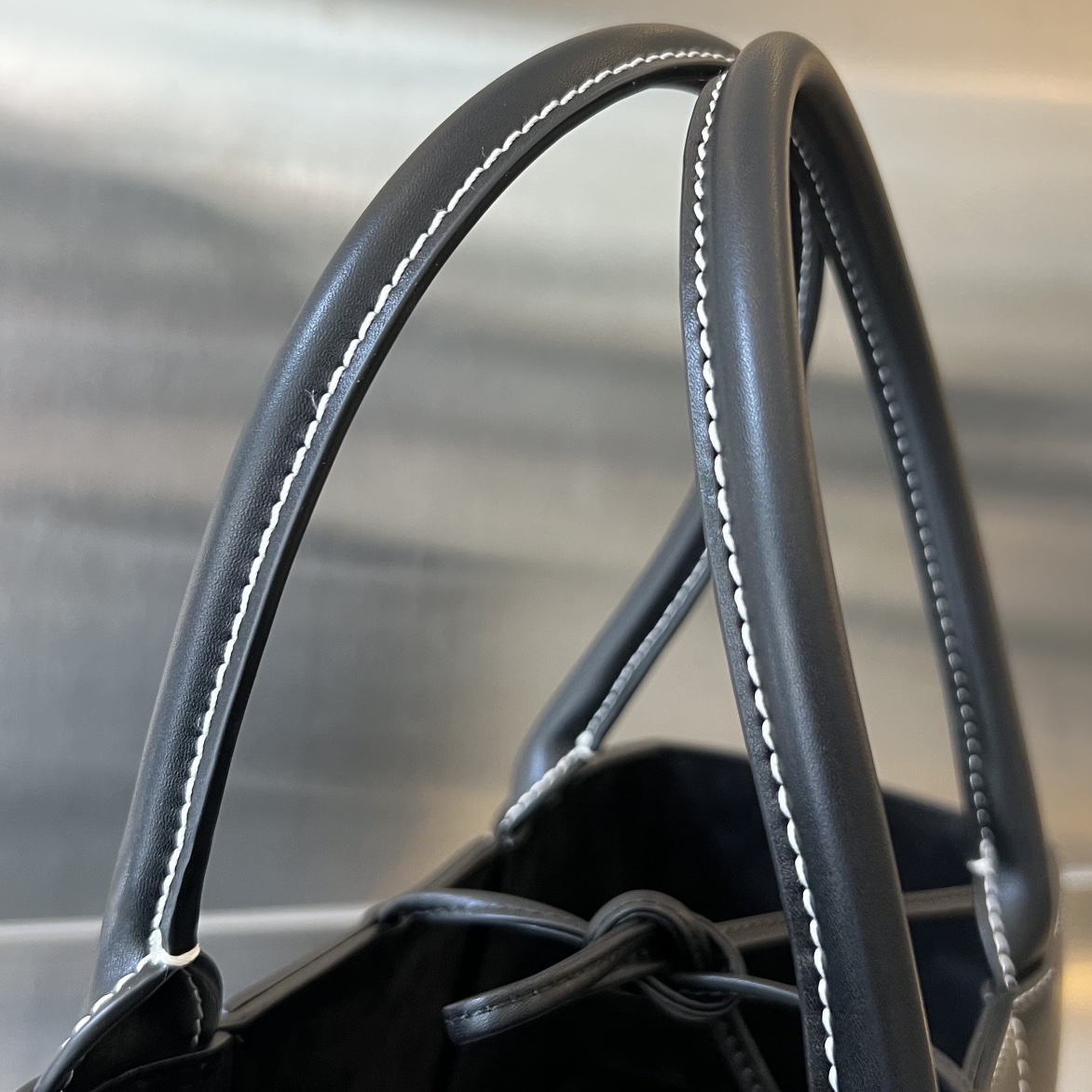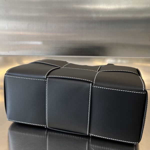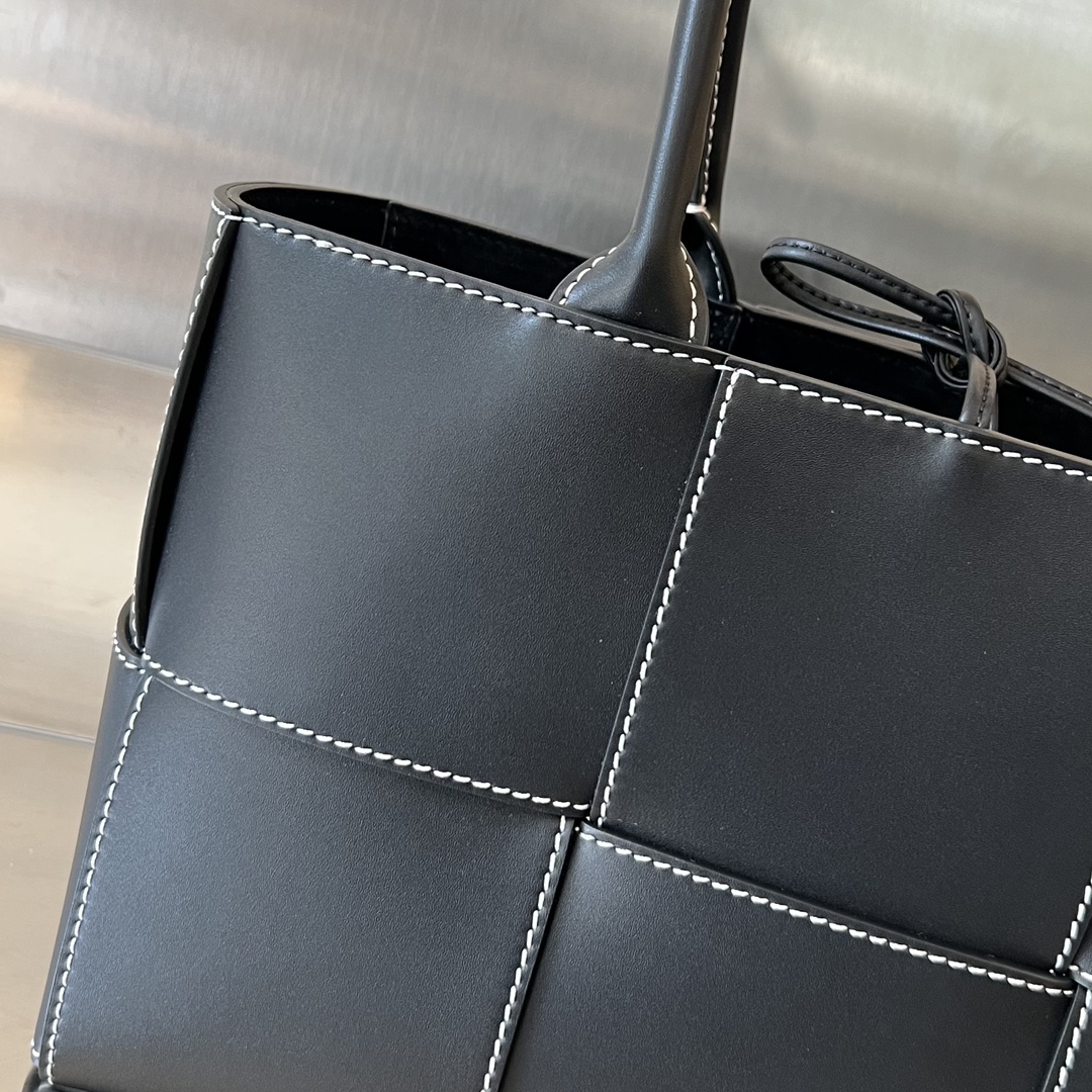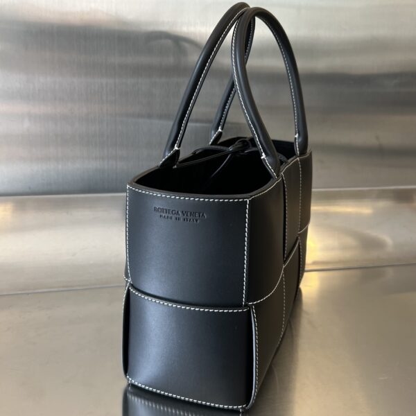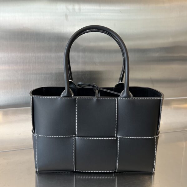 보테가의 카세트 토트백은 클래식한 대편格 디자인과 화이트 스티치가 조화를 이루어 동적인 공예와 재미있는 스타일을 강조합니다.