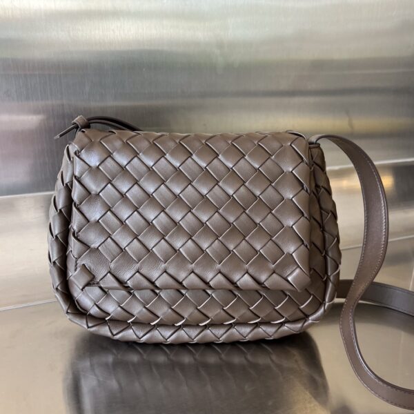 부드러운 양가죽과 보테가의 상징적인 인트레치아토(직조) 가죽으로 제작된 클래식 플랩백입니다.