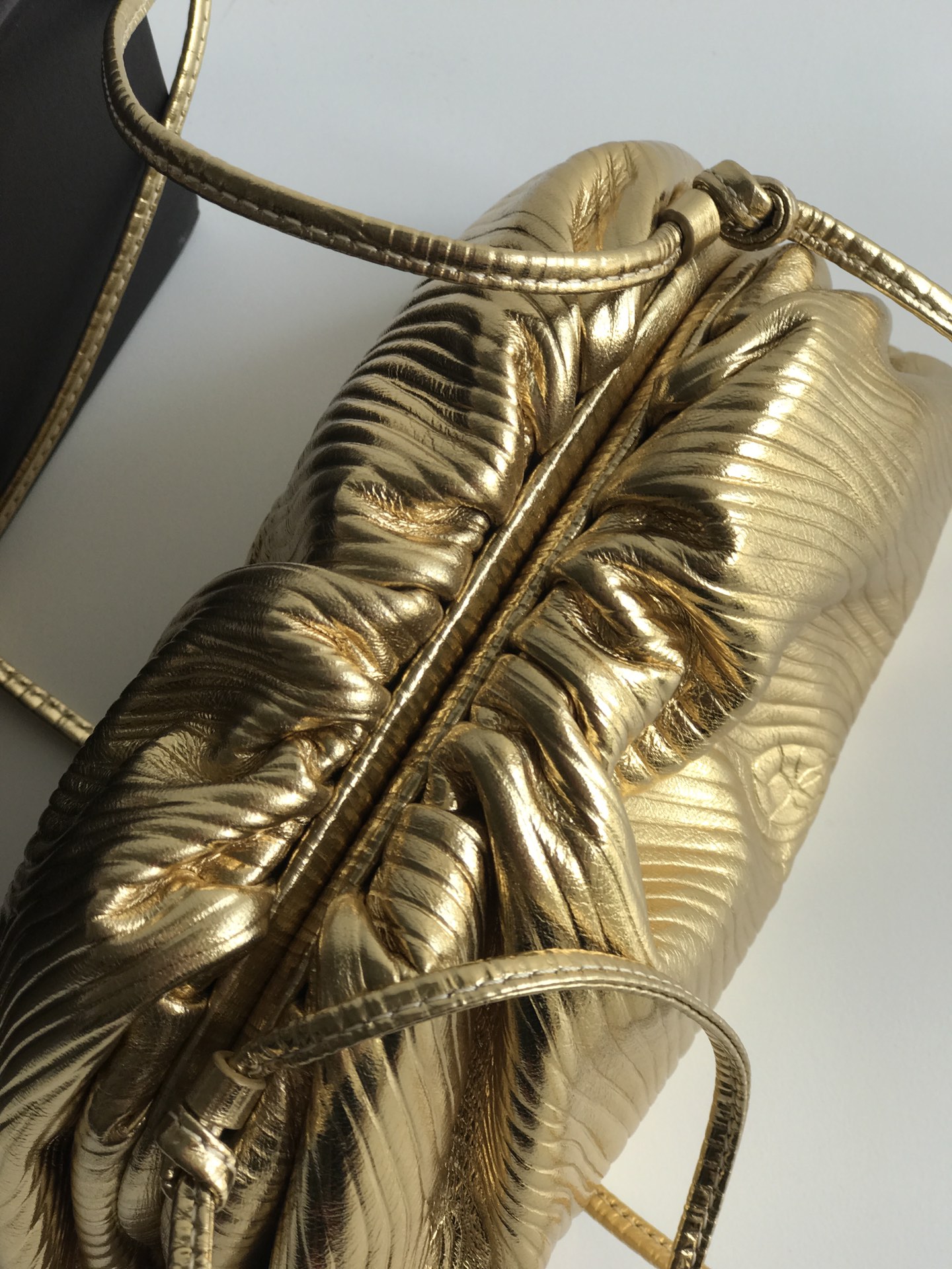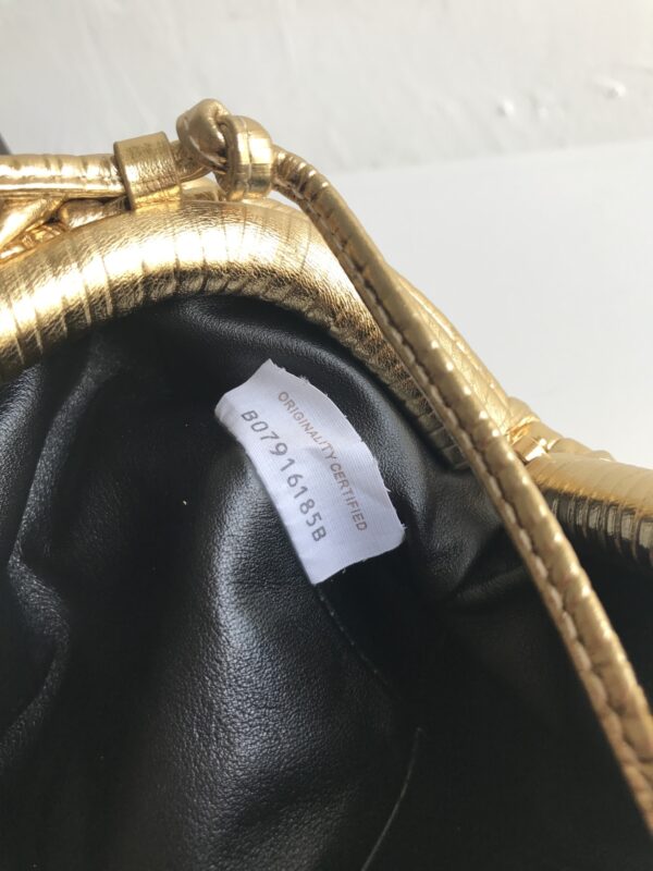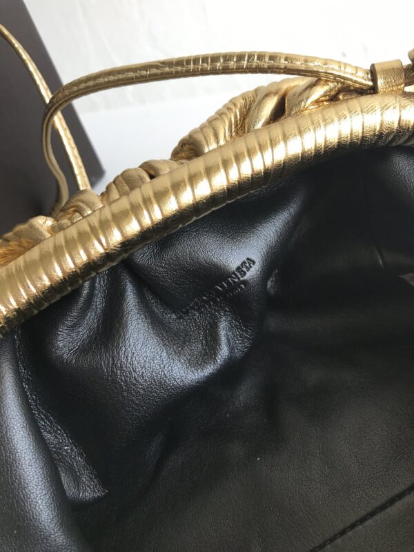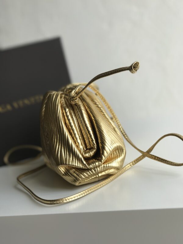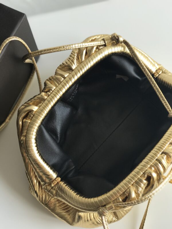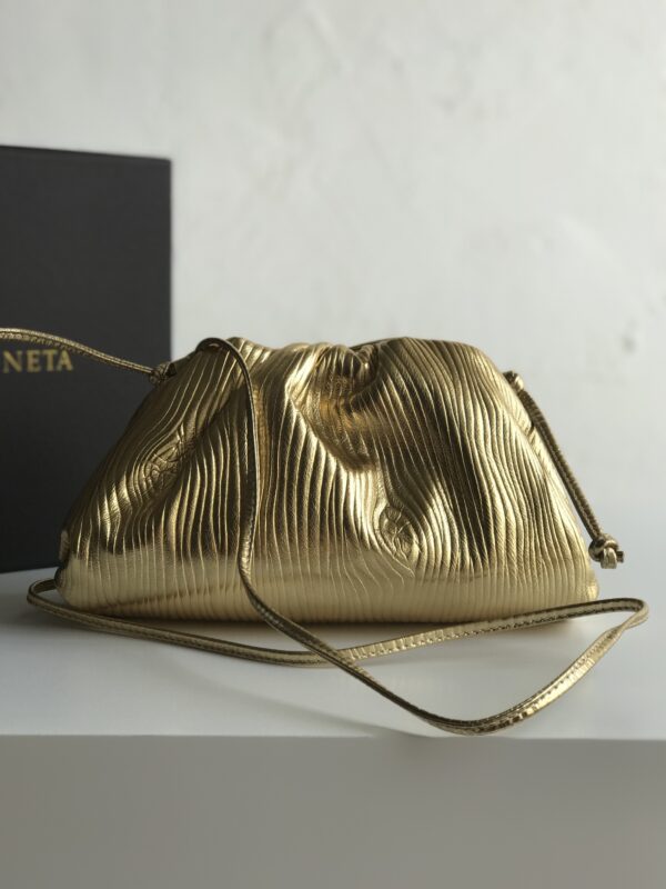 파도 무늬의 독특한 디자인이 돋보이는 클라우드 파우치입니다. 금속색의 반짝임이 매력적이며, 어떤 룩에도 잘 어울립니다.