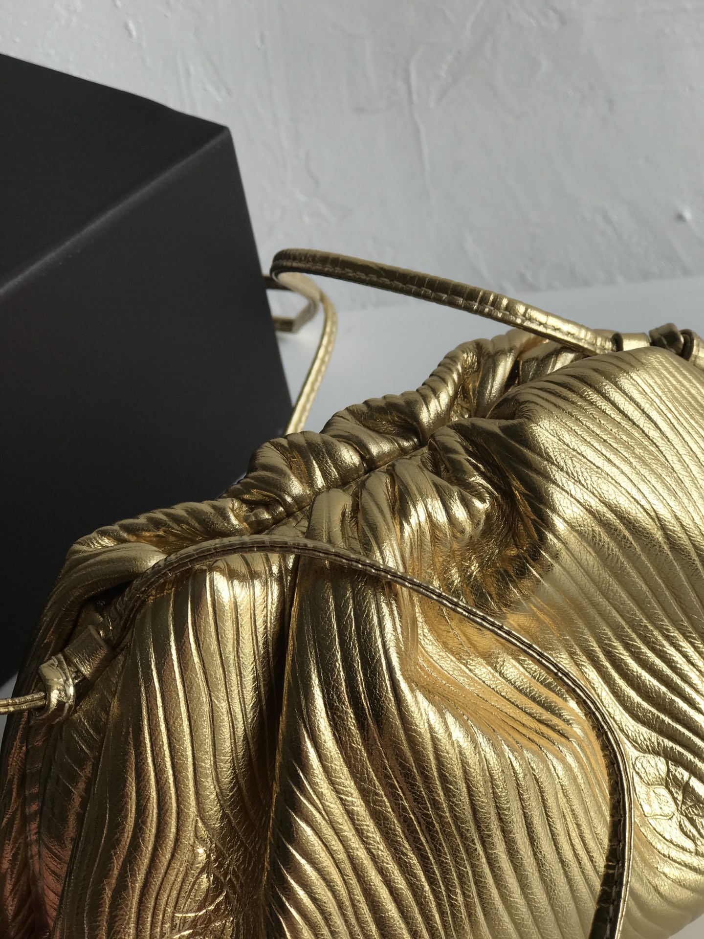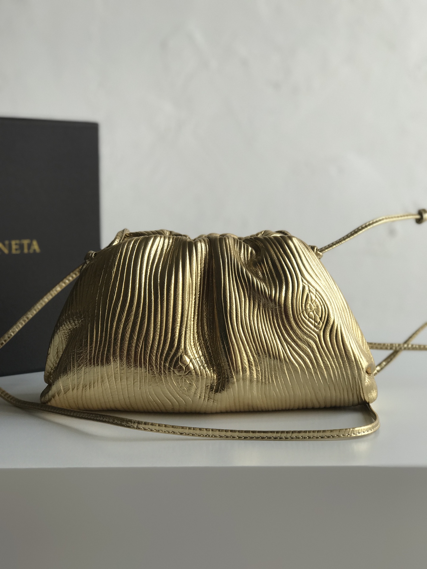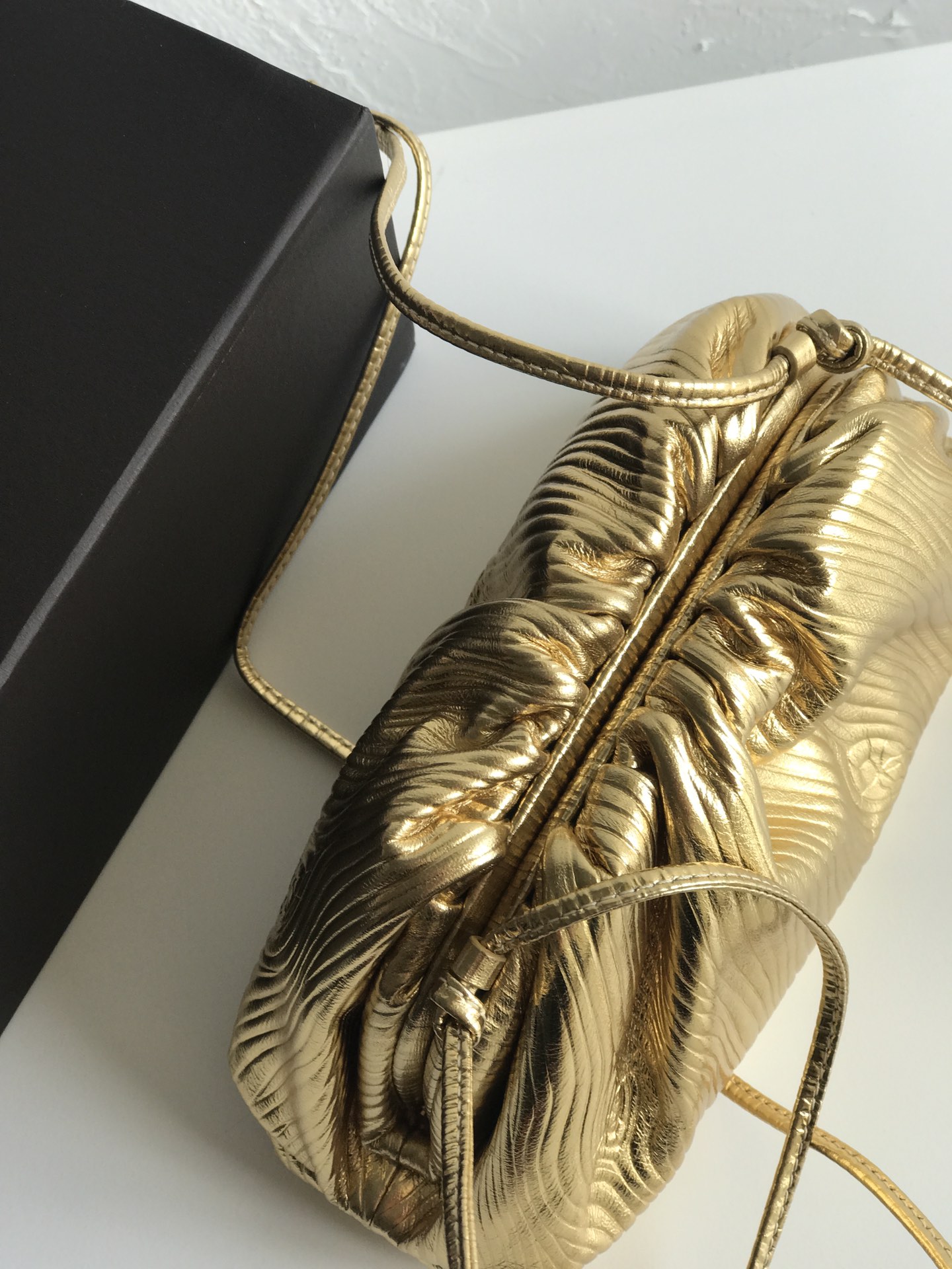 파도 무늬의 독특한 디자인이 돋보이는 클라우드 파우치입니다. 금속색의 반짝임이 매력적이며, 어떤 룩에도 잘 어울립니다.