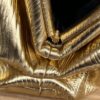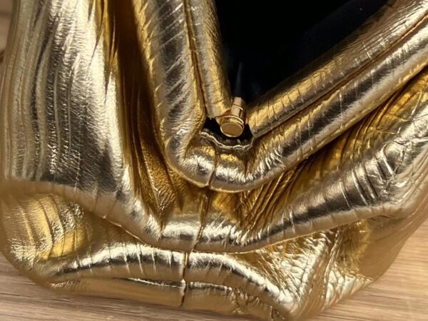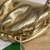 부드러운 곡선이 매력적인 클라우드 파우치입니다. 메탈릭 골드 색상으로 화려함을 더해주며, 파우치의 독특한 파도 모양 텍스처가 시선을 사로잡습니다.