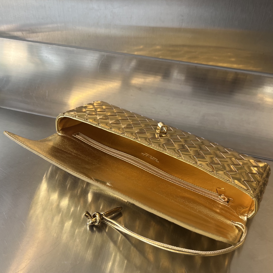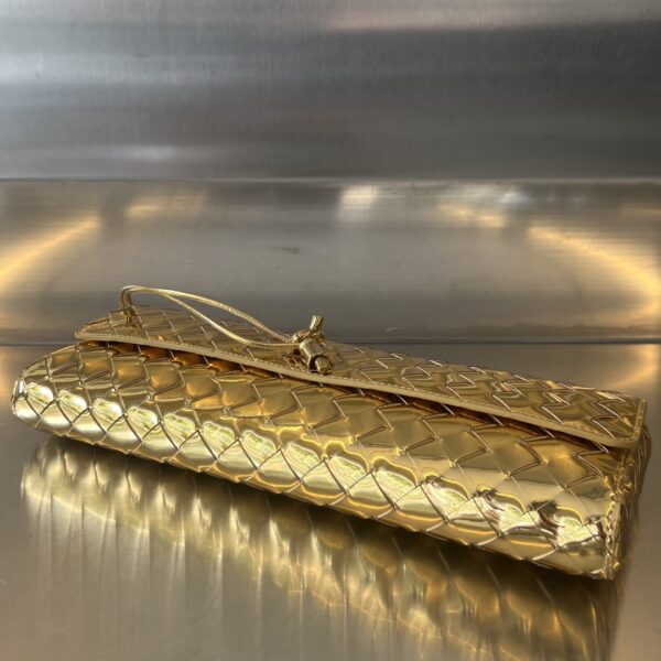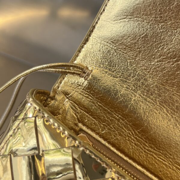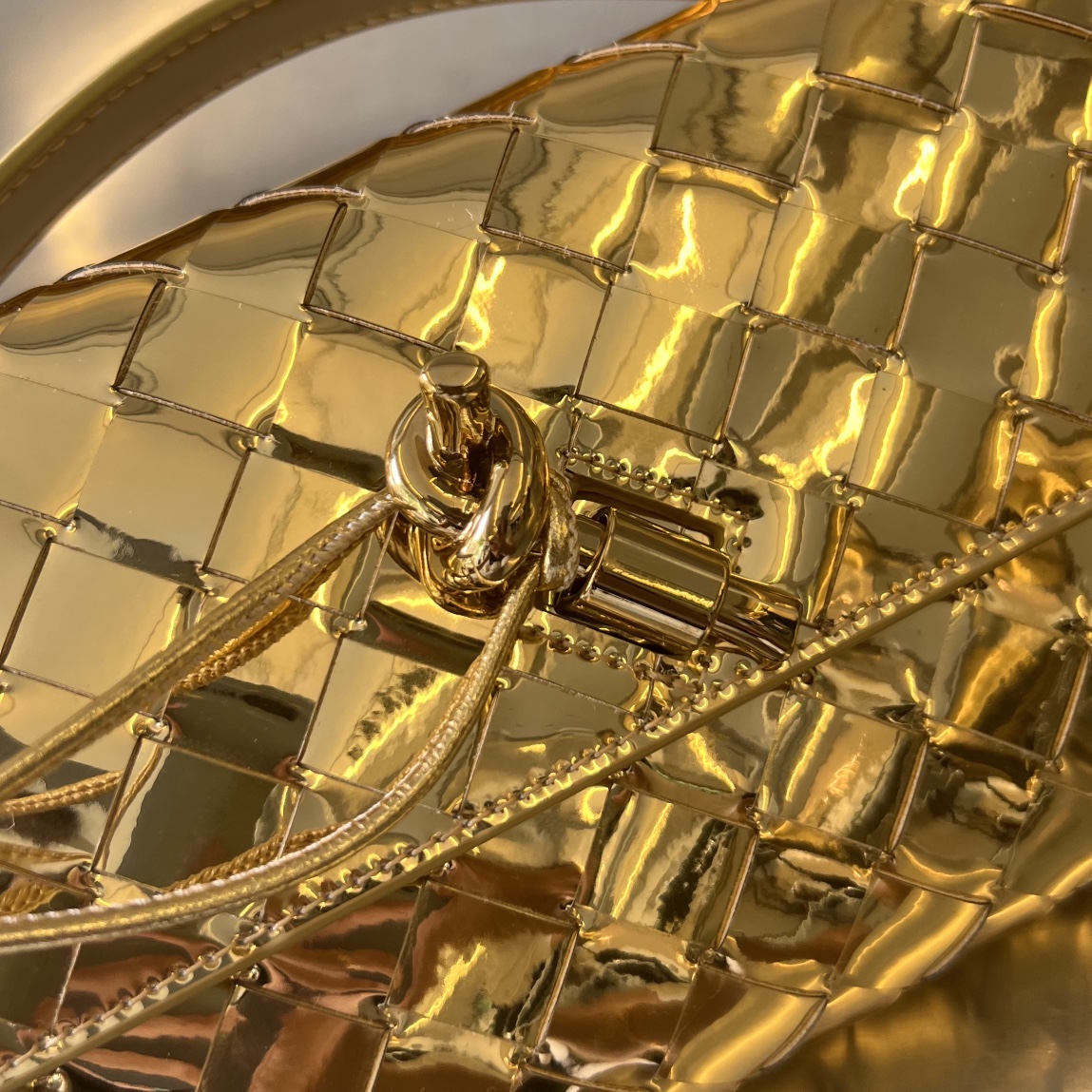 고급스러운 골드 컬러가 매력적이며, 손잡이가 있어 손에 들거나 클러치 형태로 착용할 수 있습니다.