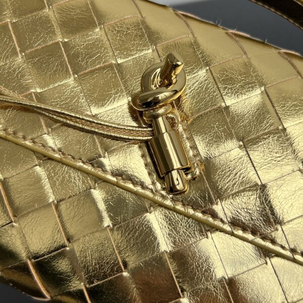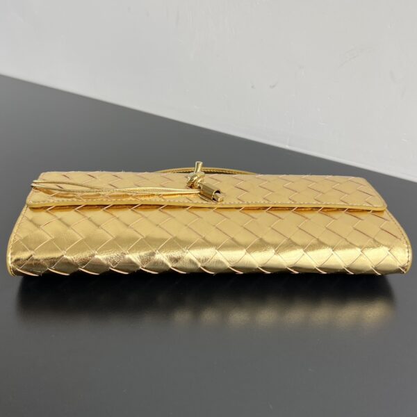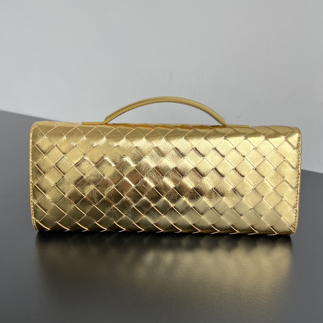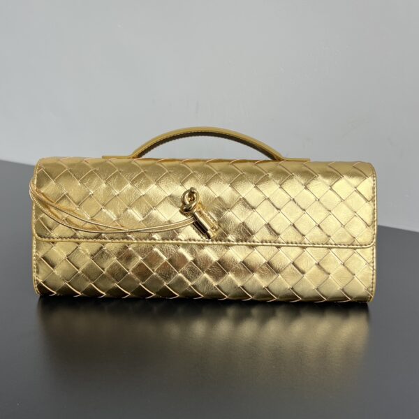 고급스러운 골드 컬러가 돋보이며, 손잡이가 있어 손에 들거나 클러치 형태로 사용할 수 있습니다.