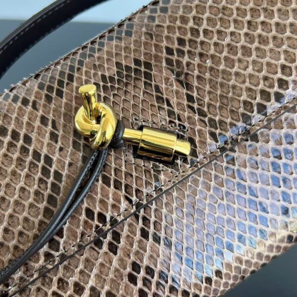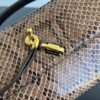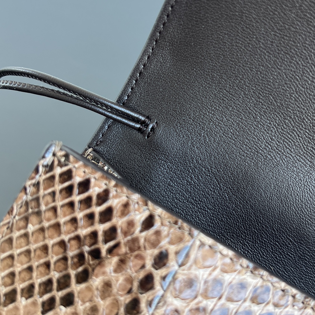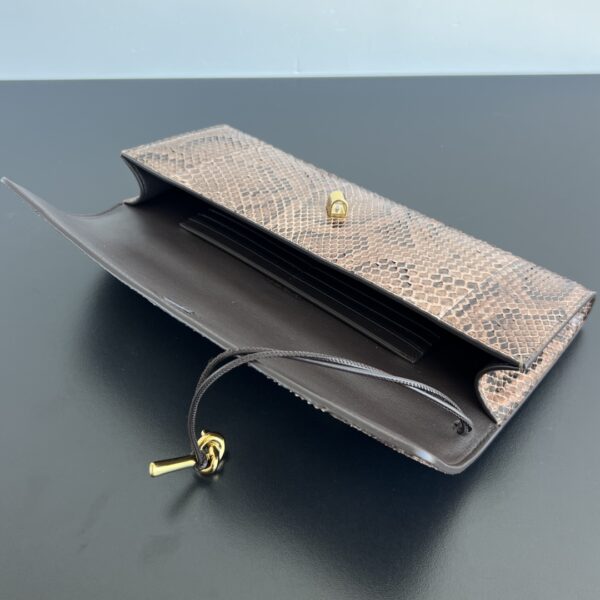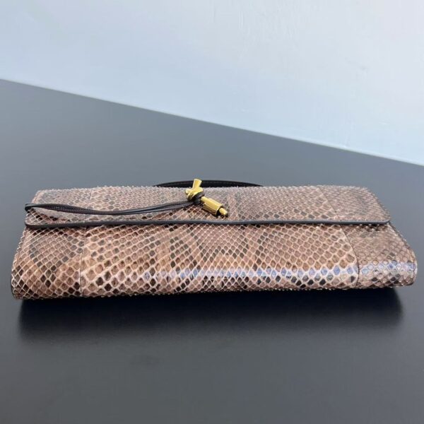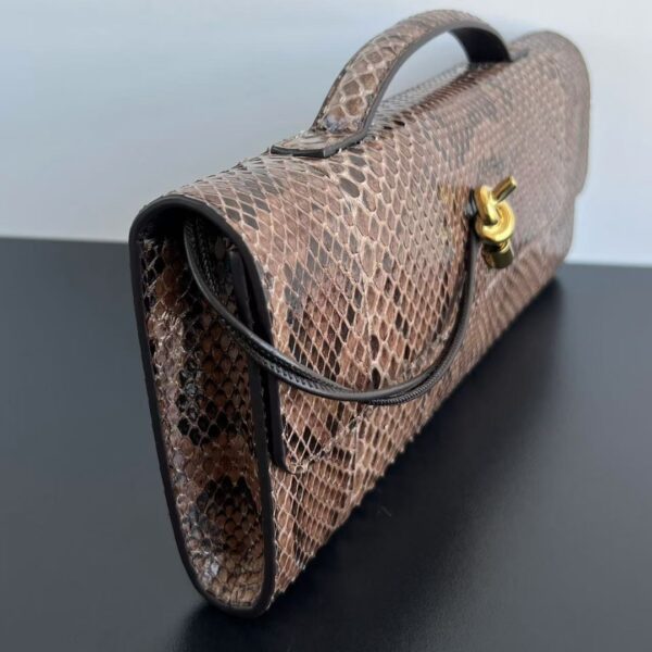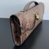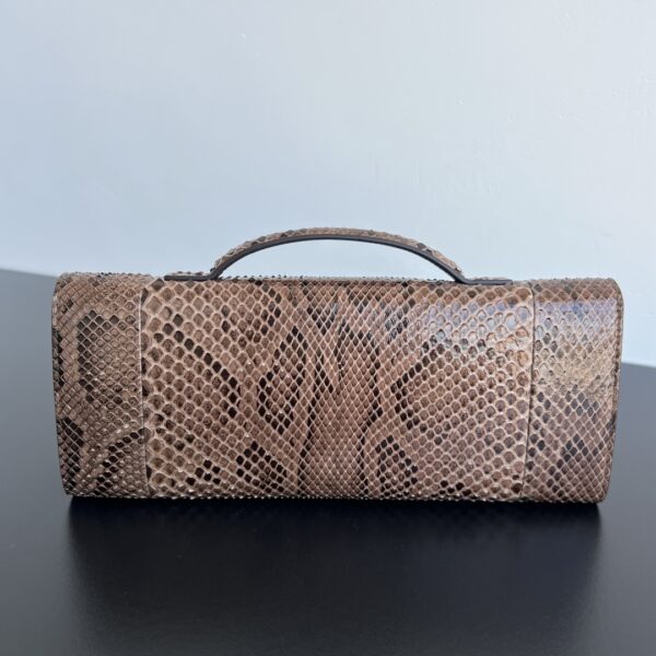 뱀피 소재로 제작된 클러치 백입니다. 독특한 뱀무늬가 매력적이며, 고급스러운 느낌을 줍니다.