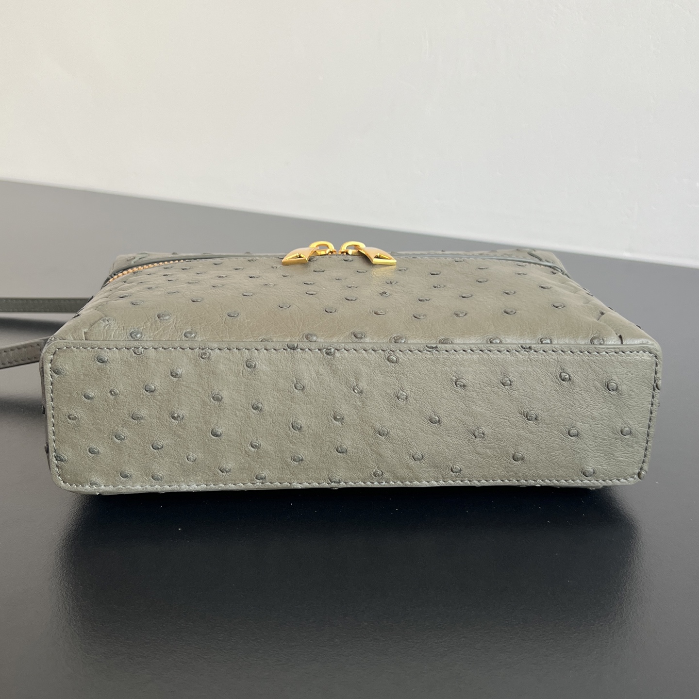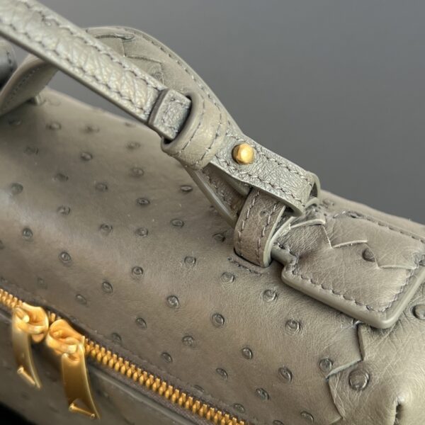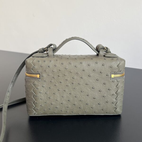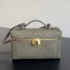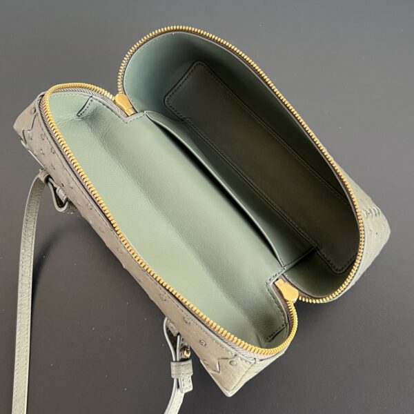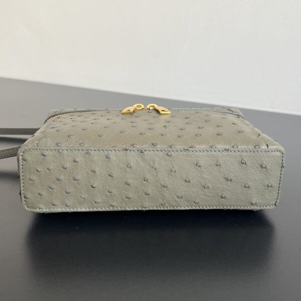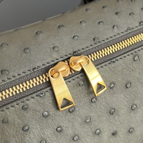 부드러운 타조가죽으로 제작된 화장품 파우치입니다. 자연스러운 질감이 돋보이며, 각기 다른 크기의 구멍들이 독특한 매력을 더합니다.