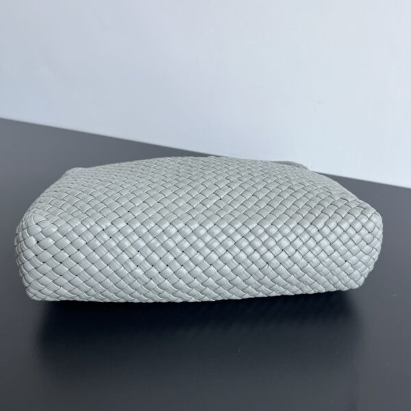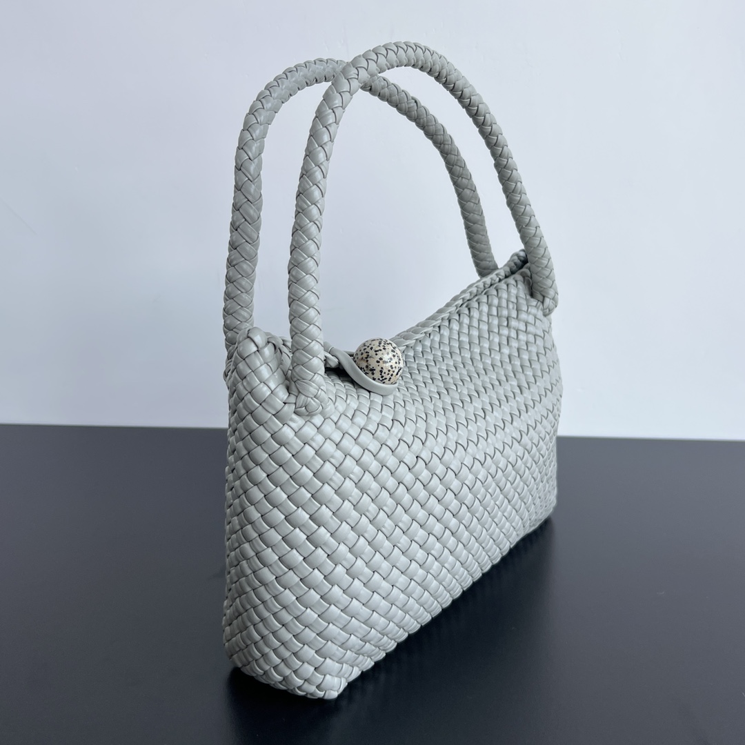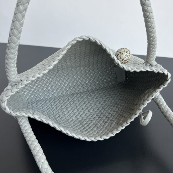 고급스러운 그레이 컬러와 독특한 편직 기법이 조화를 이루며, 전체적으로 클래식한 카바트 디자인이 특징입니다. 손잡이 부분은 전부 가죽으로 세심하게 편직되어 있어 고급스러움을 더합니다.