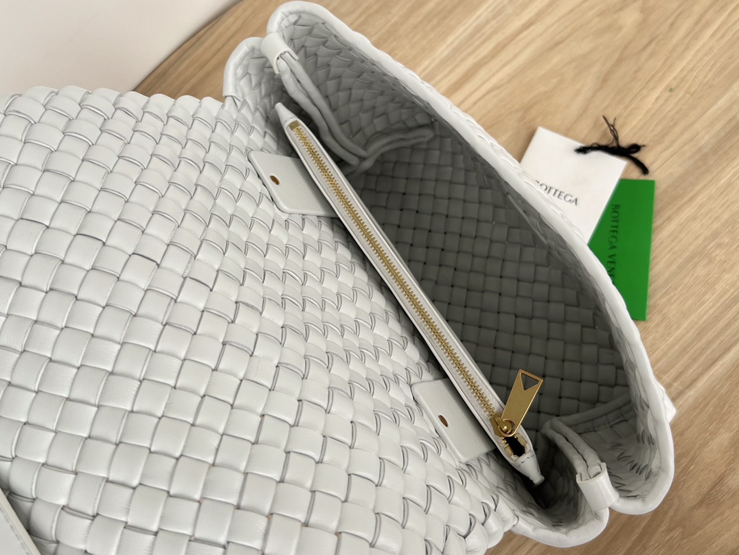 보테가의 패티 위빙 손잡이백은 고유의 인트레치아토 위빙 가죽 공법과 부드러운 양가죽으로 제작되었습니다.