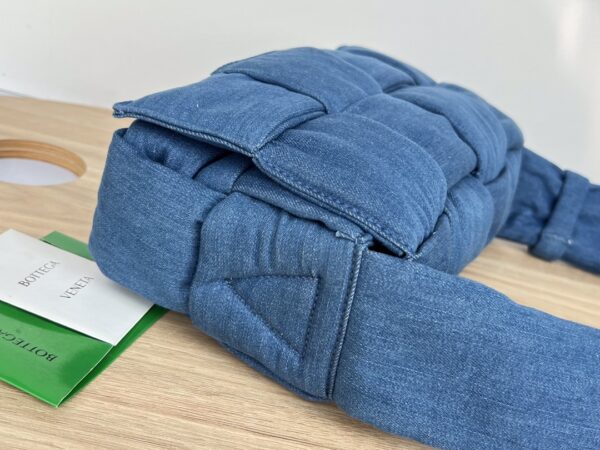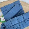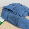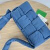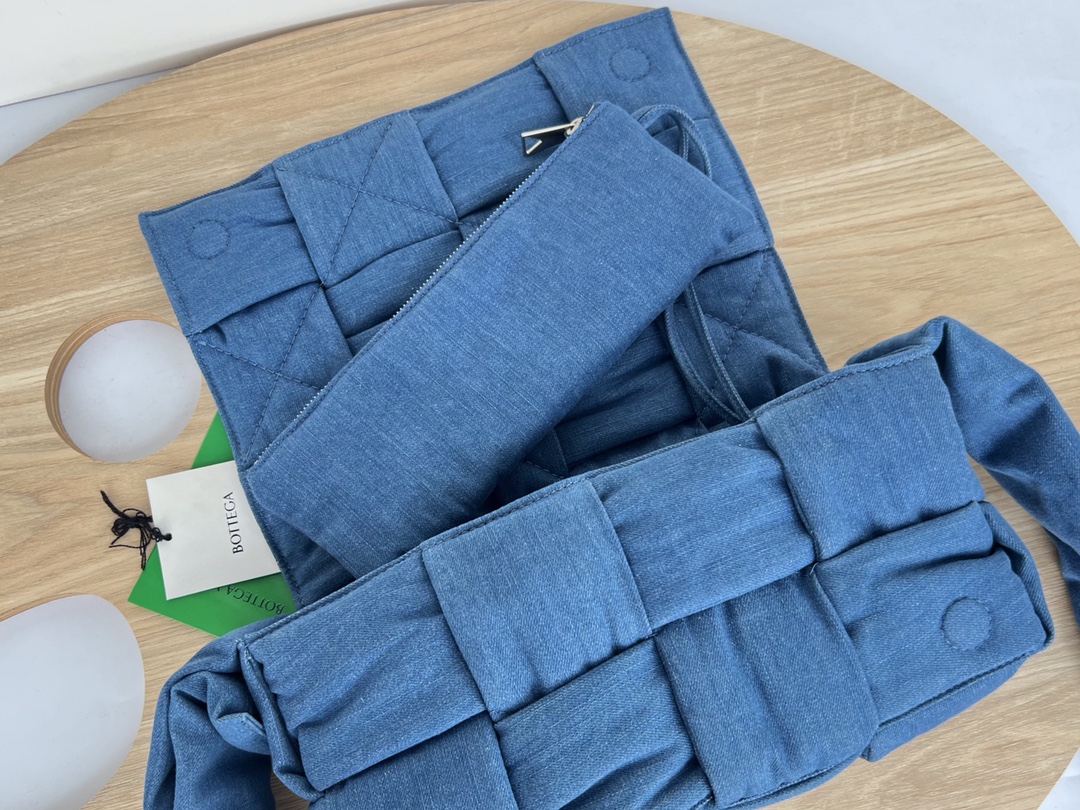 부드럽고 내구성이 뛰어난 데님 소재로 제작된 편직 숄더백입니다.