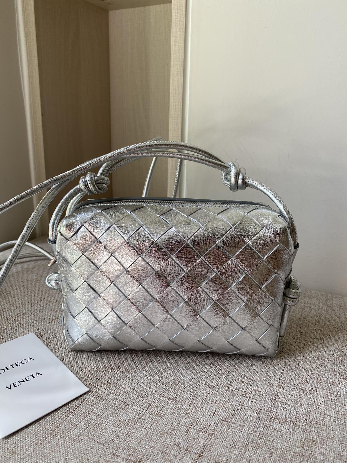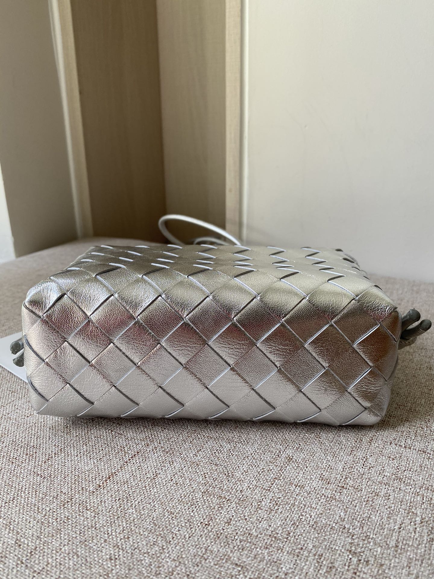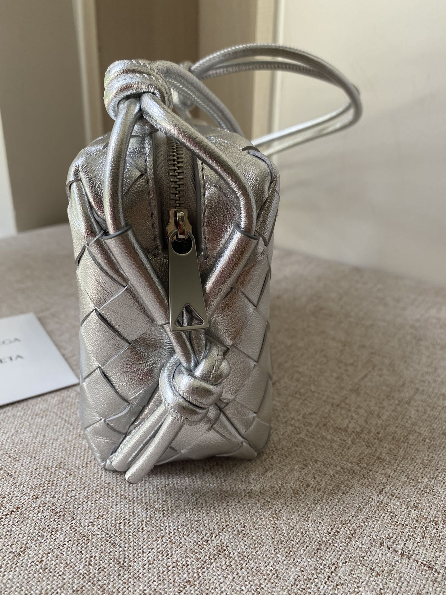 부드러운 양가죽으로 제작된 편직 미니 라운드 백입니다.