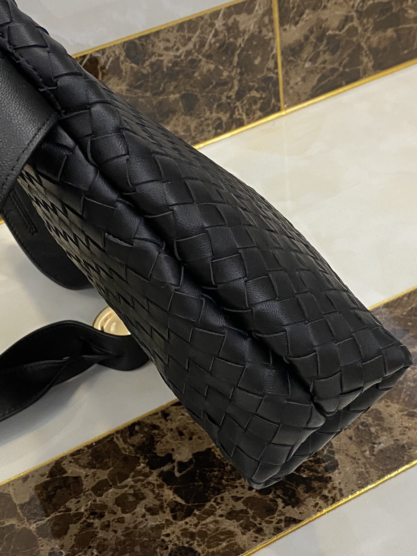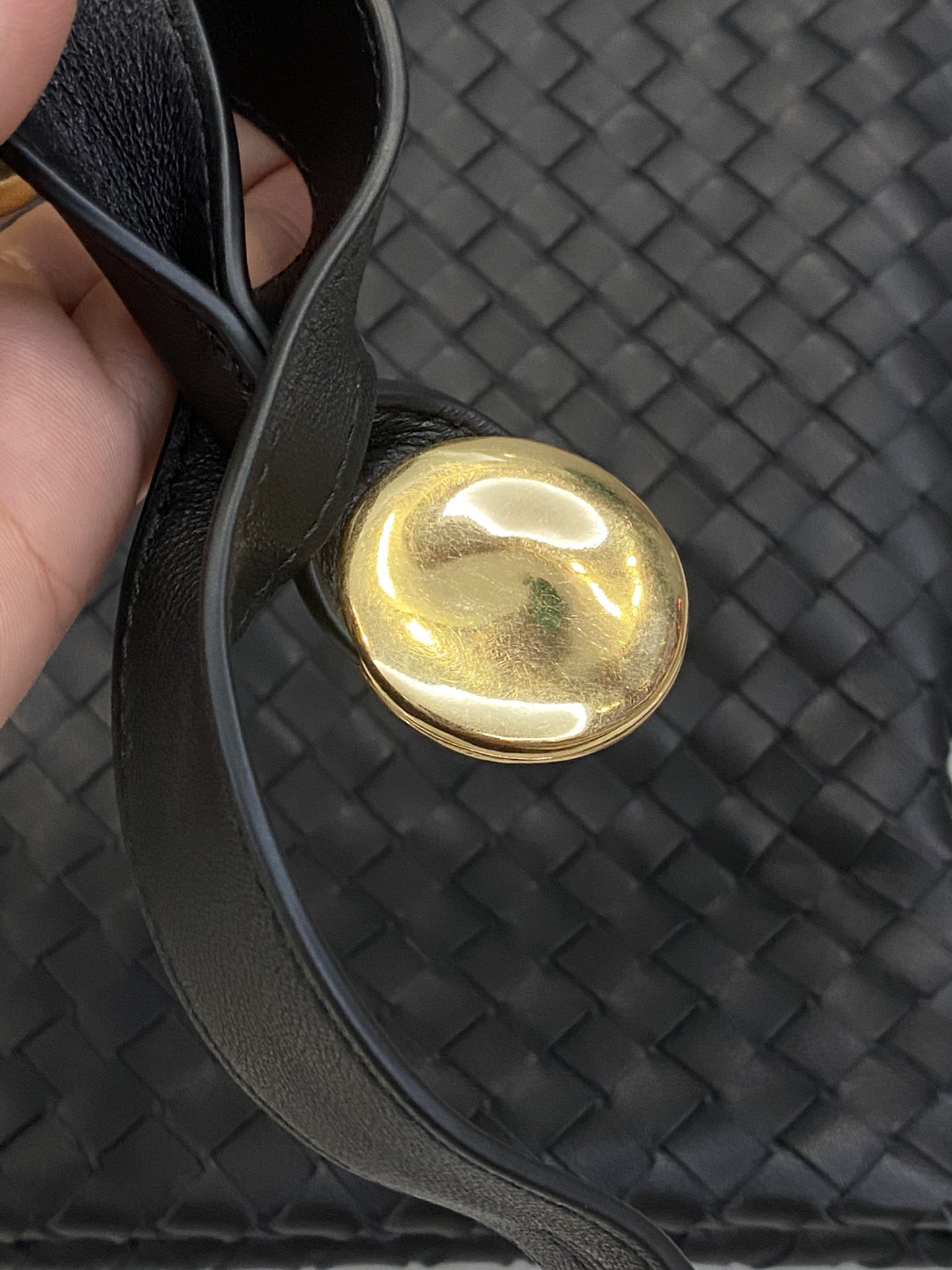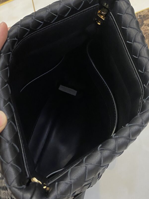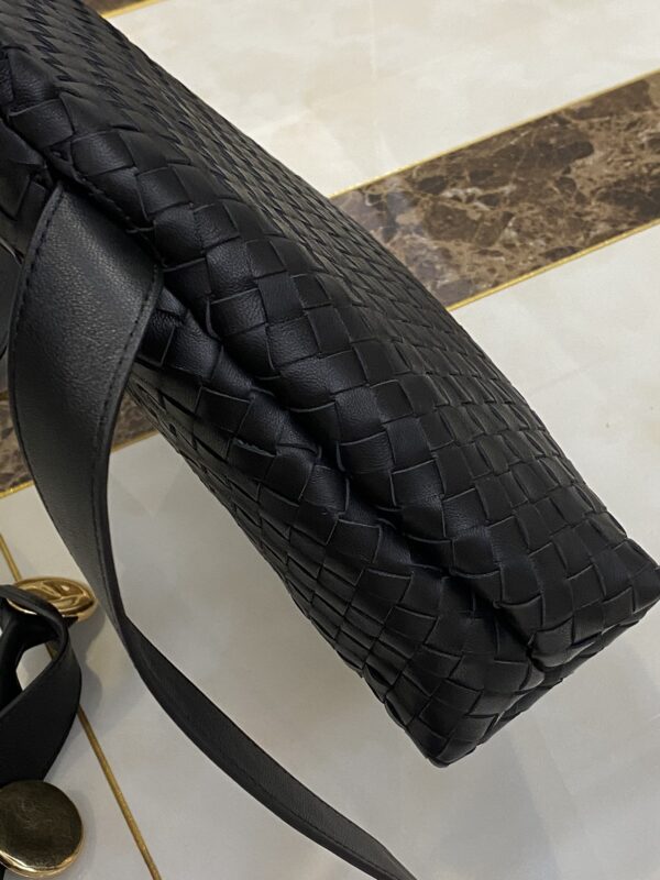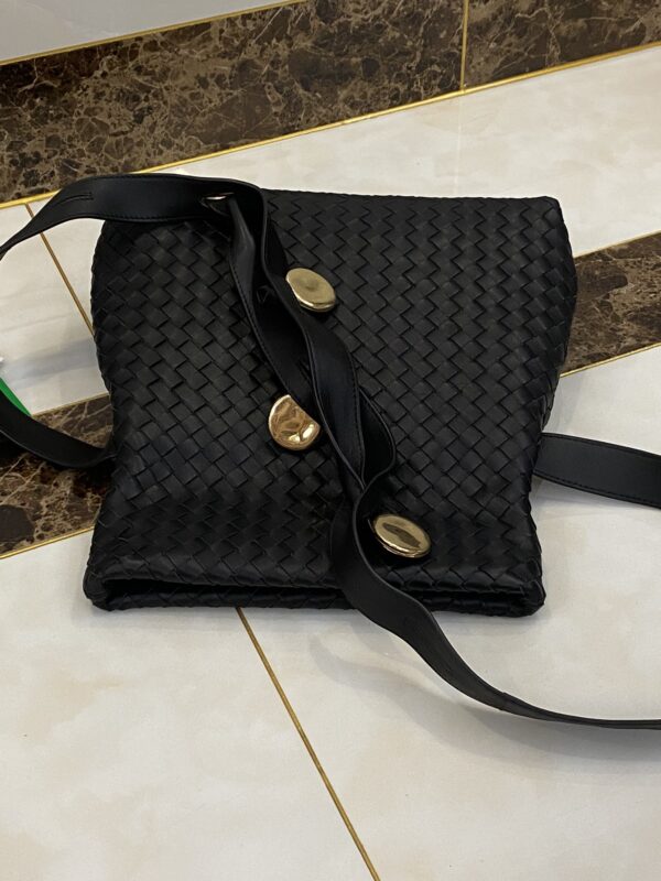 고급스러운 위빙 디자인과 독특한 금속 버튼이 조화를 이루는 숄더백입니다.