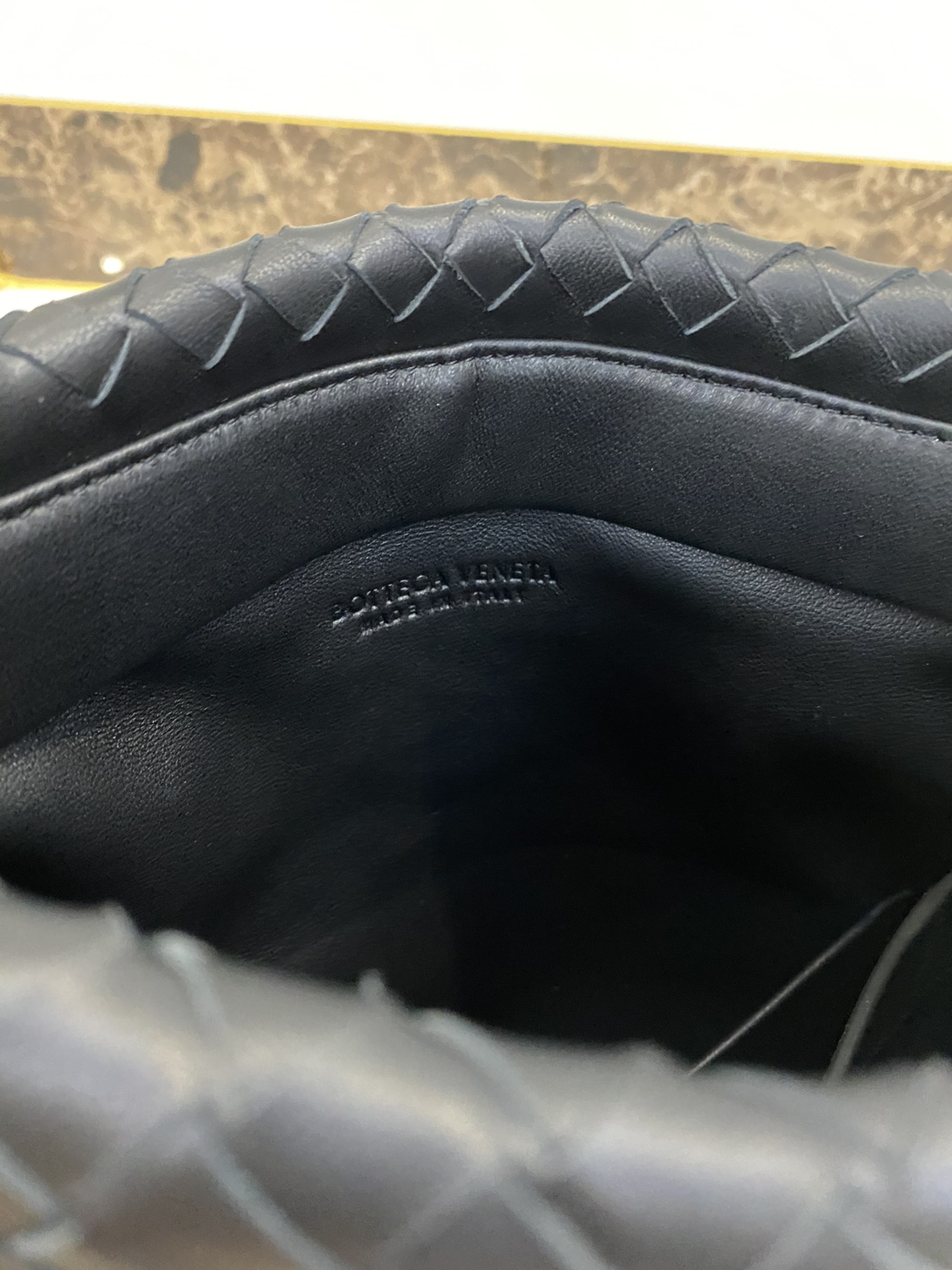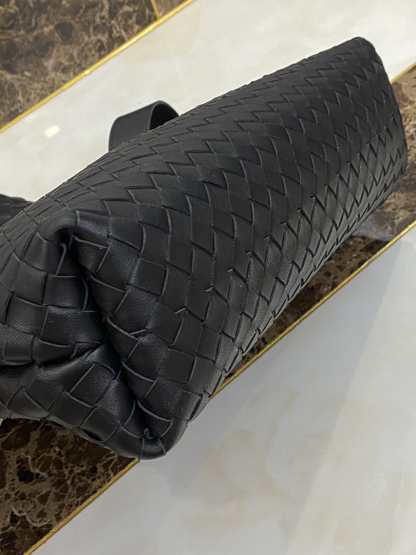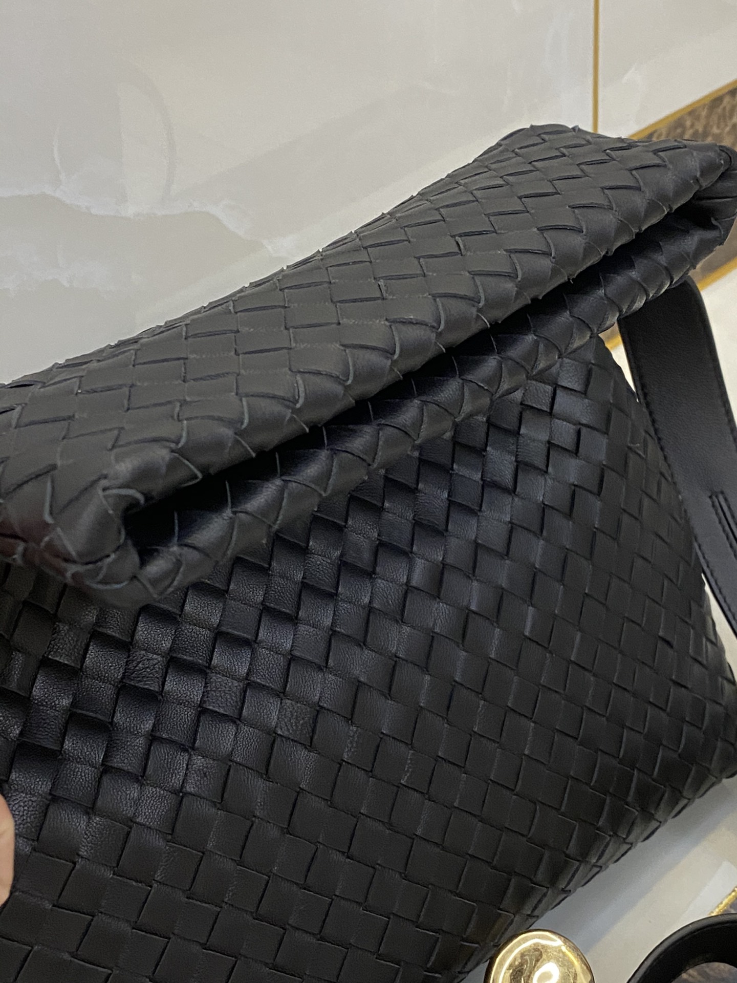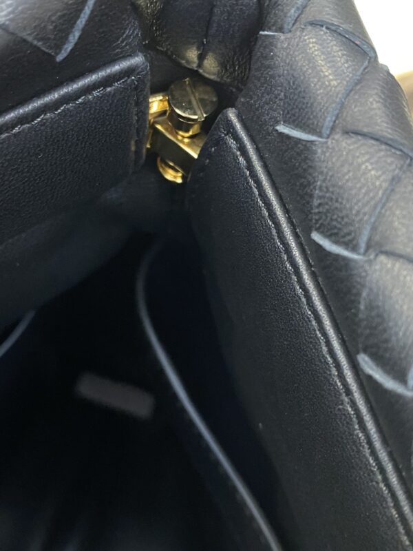 고급스러운 위빙 디자인과 독특한 금속 버튼이 조화를 이루는 숄더백입니다.