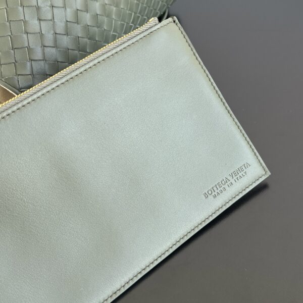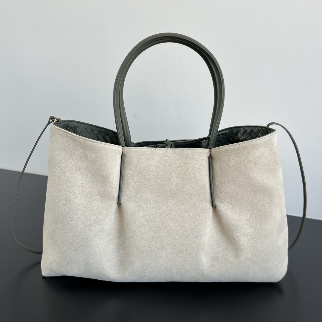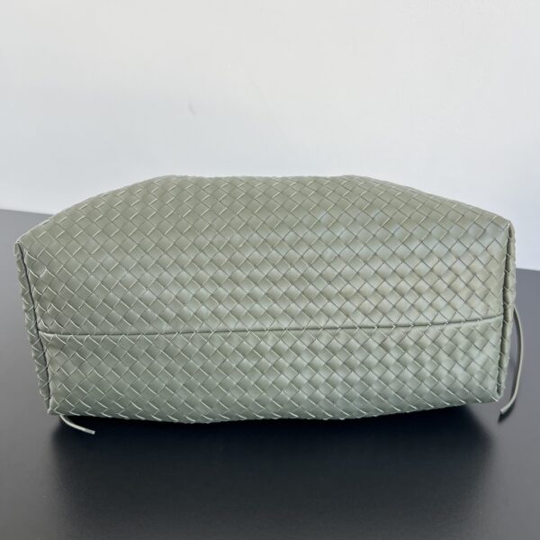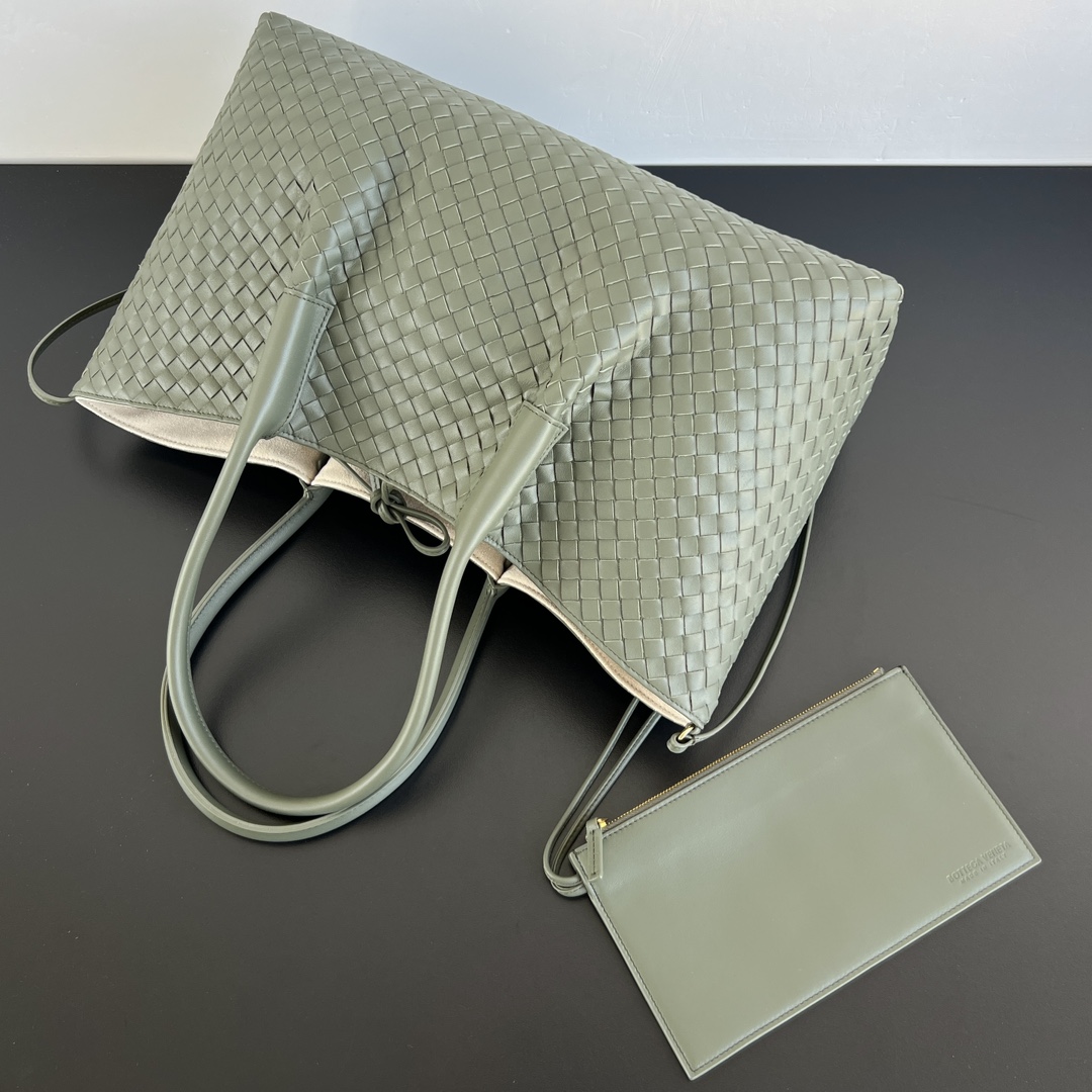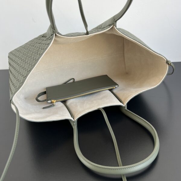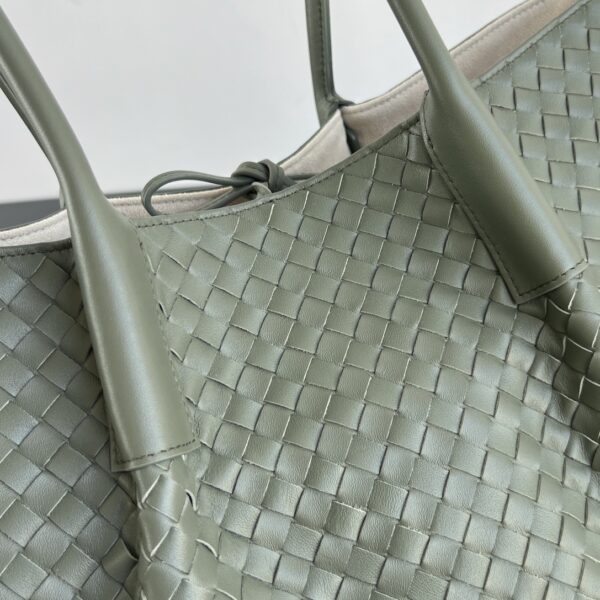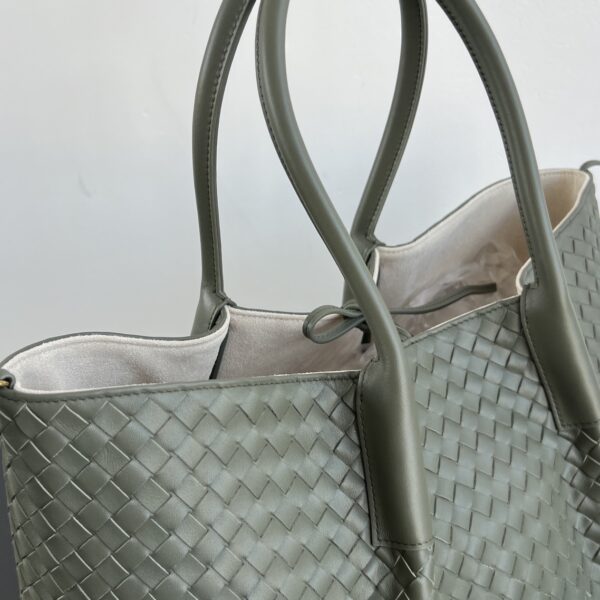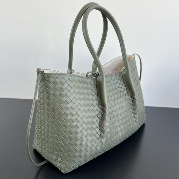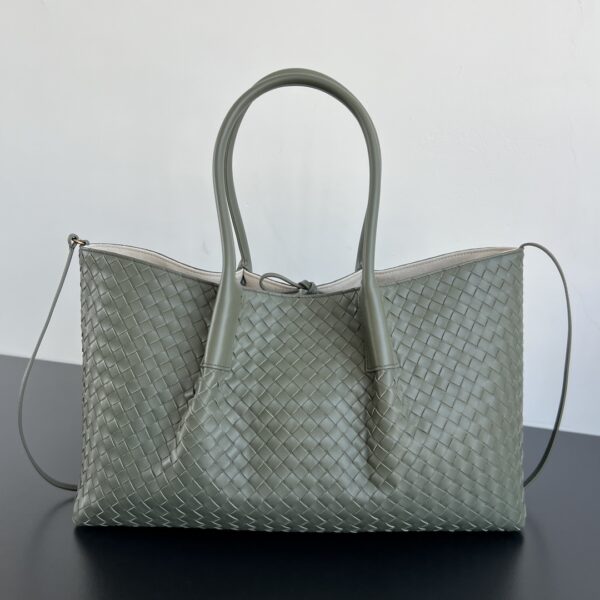 보테가의 핀아코테 중형 토트백은 클래식한 인트레치아토 패턴의 소가죽으로 제작되어 고급스러움을 더합니다.