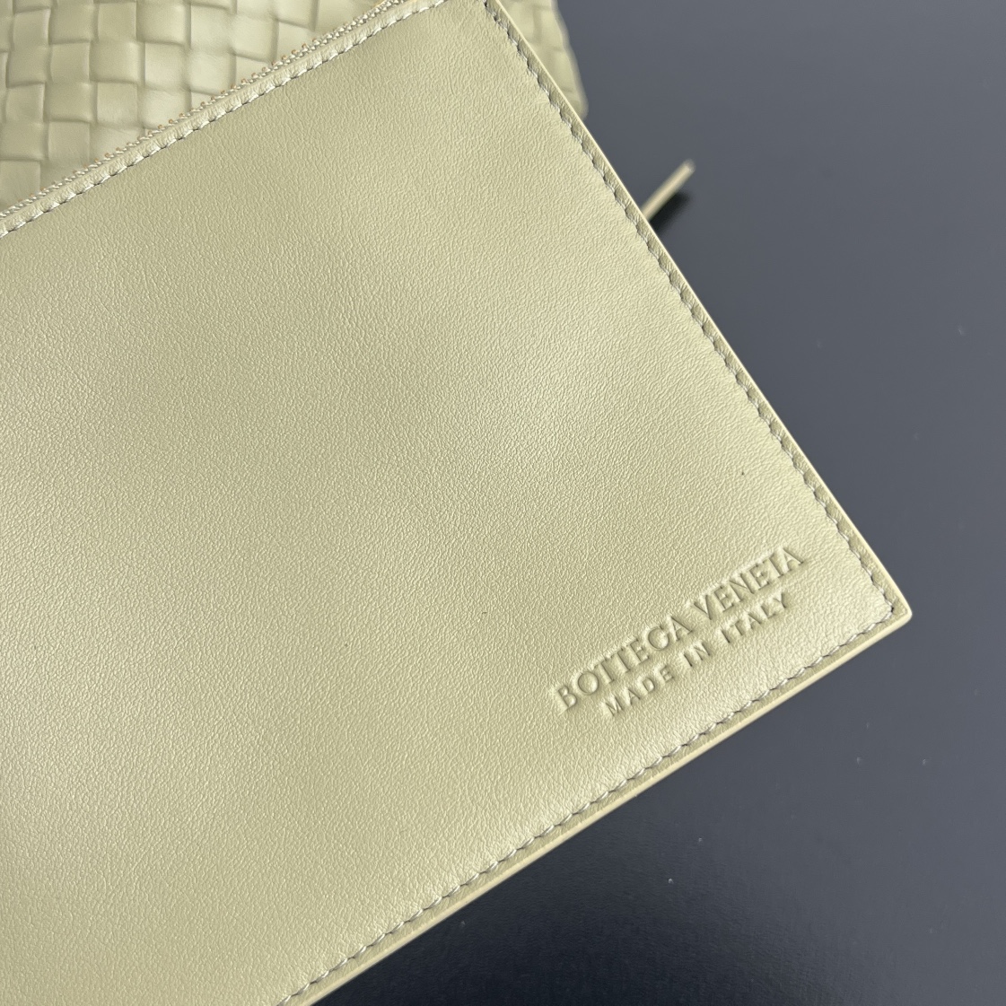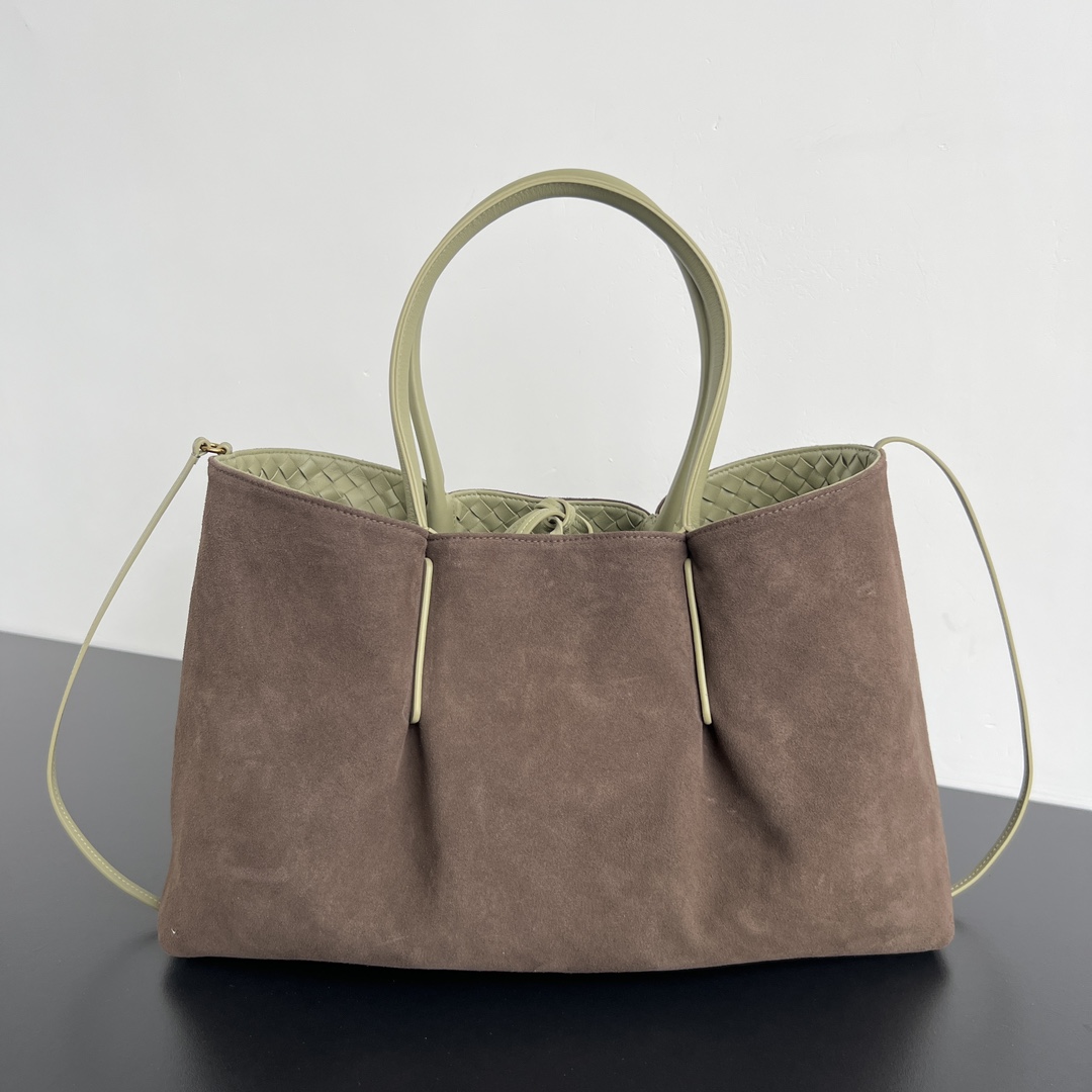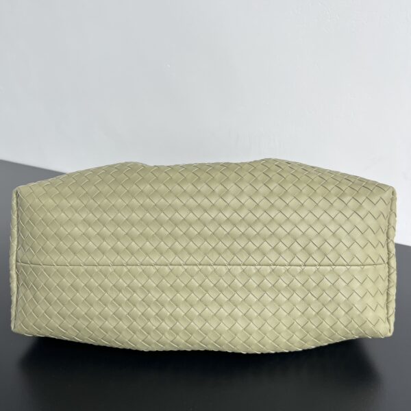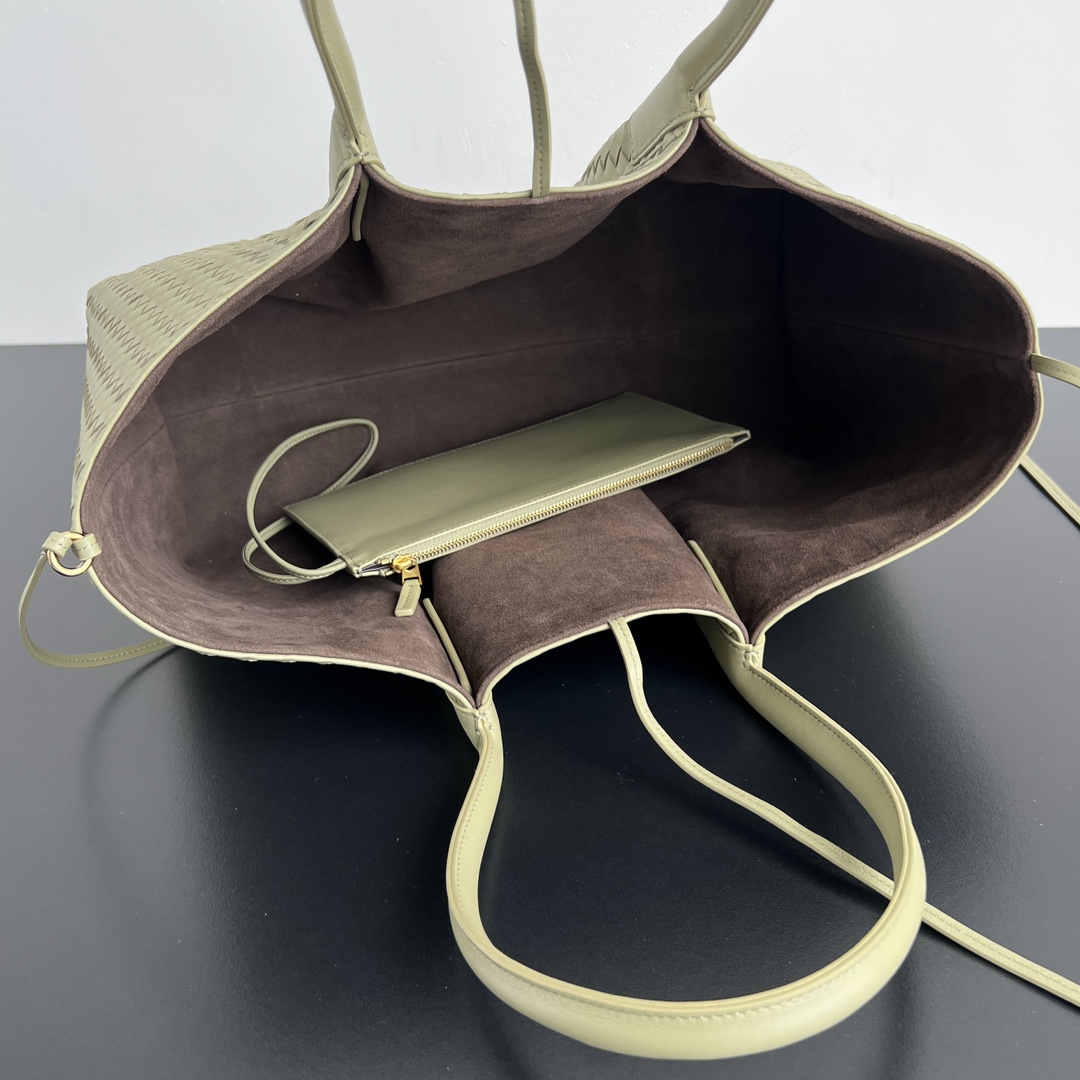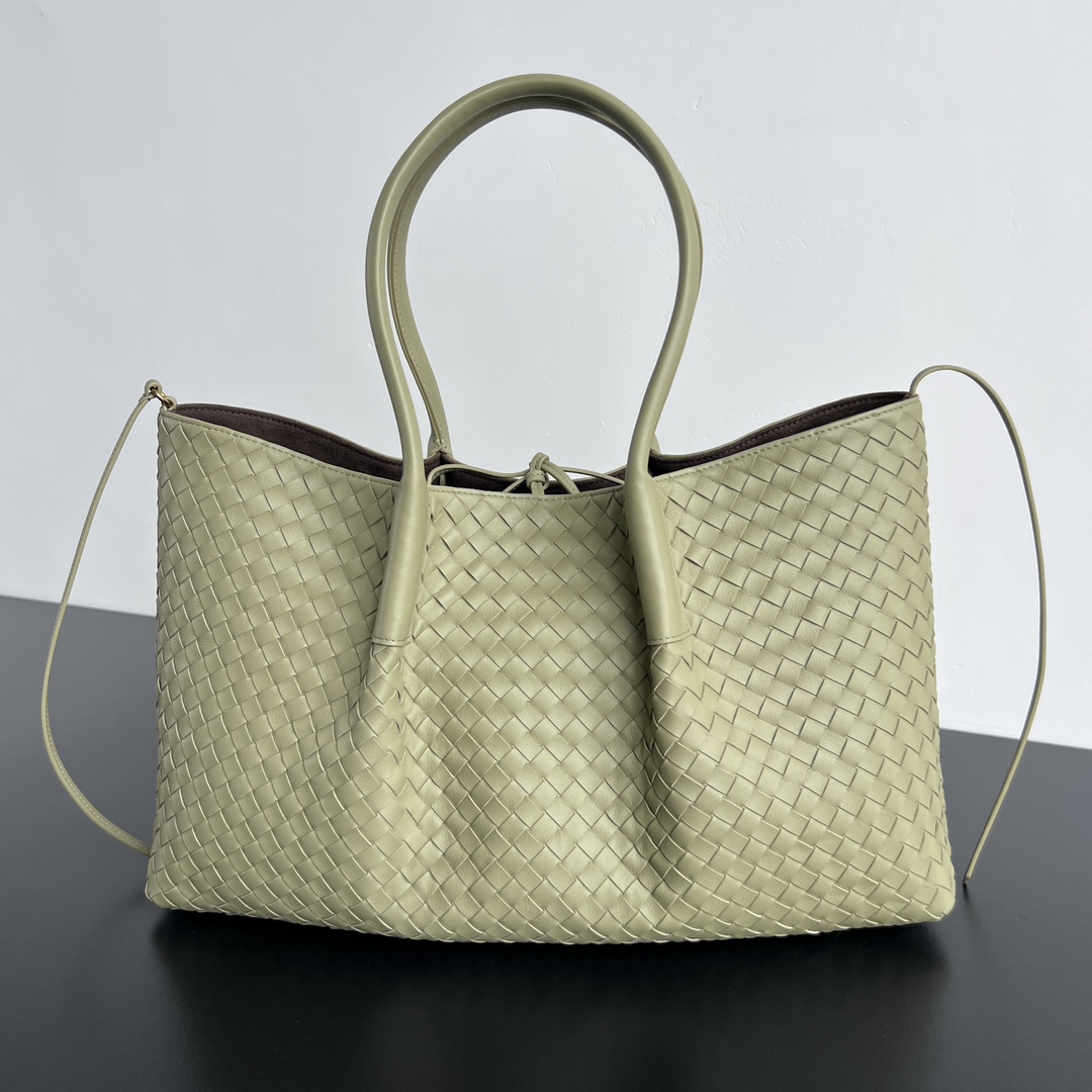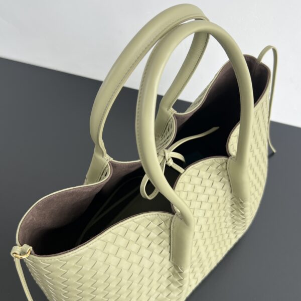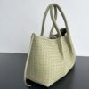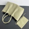 보테가의 핀아코테 중형 토트백은 클래식한 인트레치아토 패턴의 소가죽으로 제작되어 고급스러움을 더합니다.