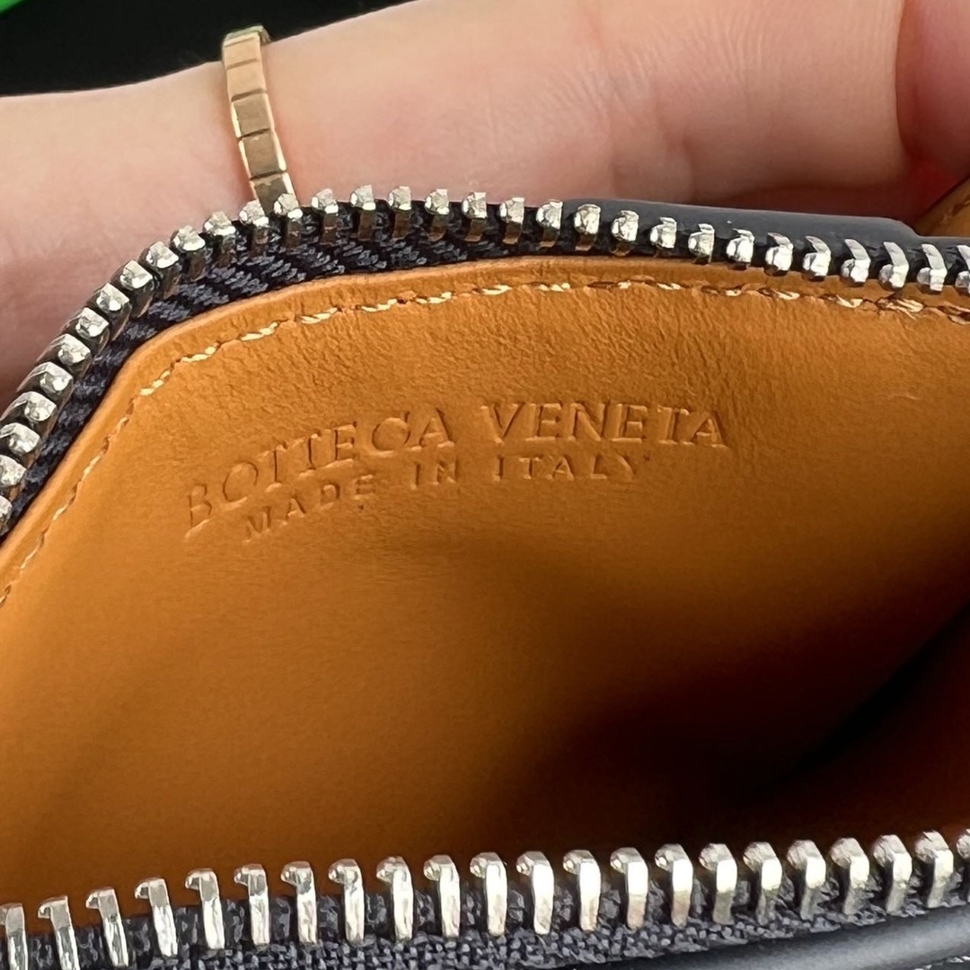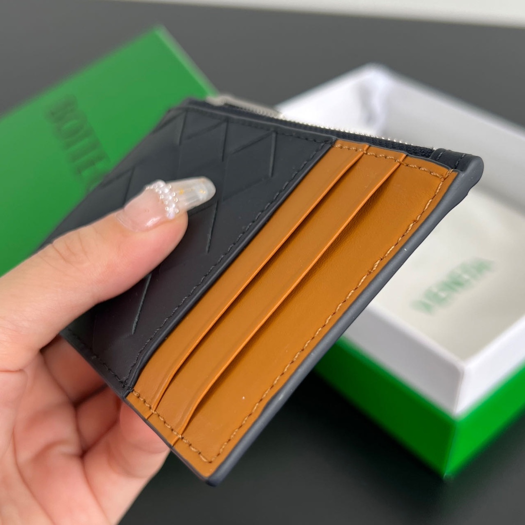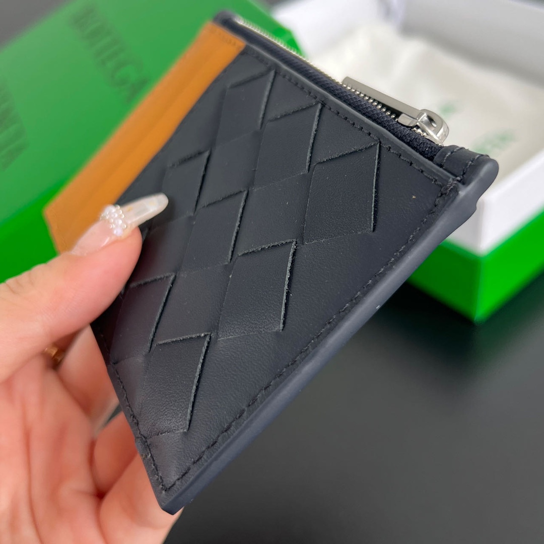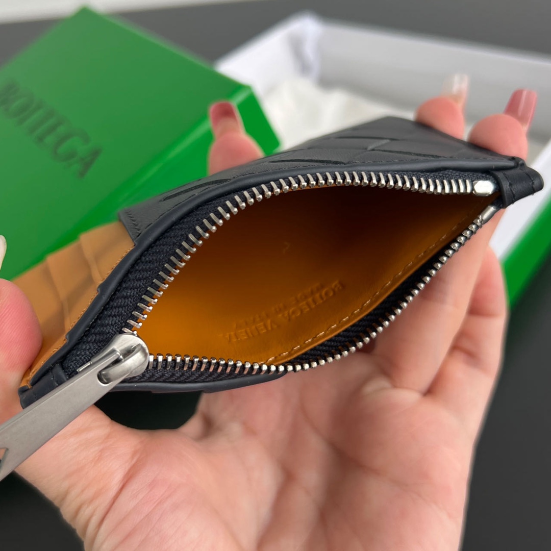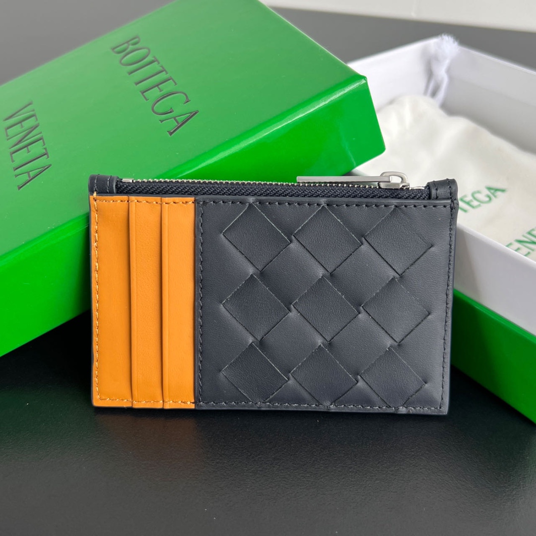 소가죽으로 제작된 BV 편직 지퍼 카드 지갑입니다. 블랙과 오렌지의 조화가 돋보이며, 화사하면서도 세련된 느낌을 줍니다.