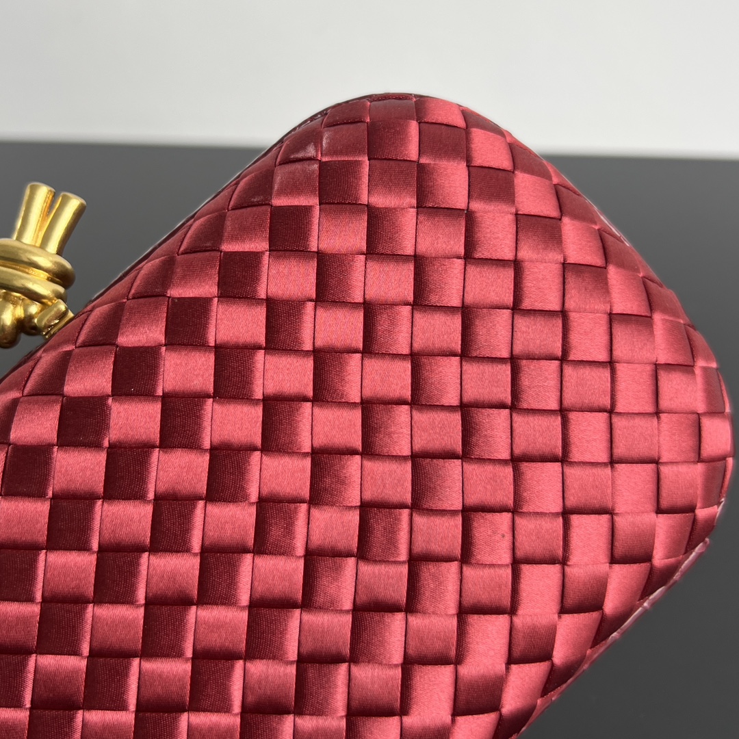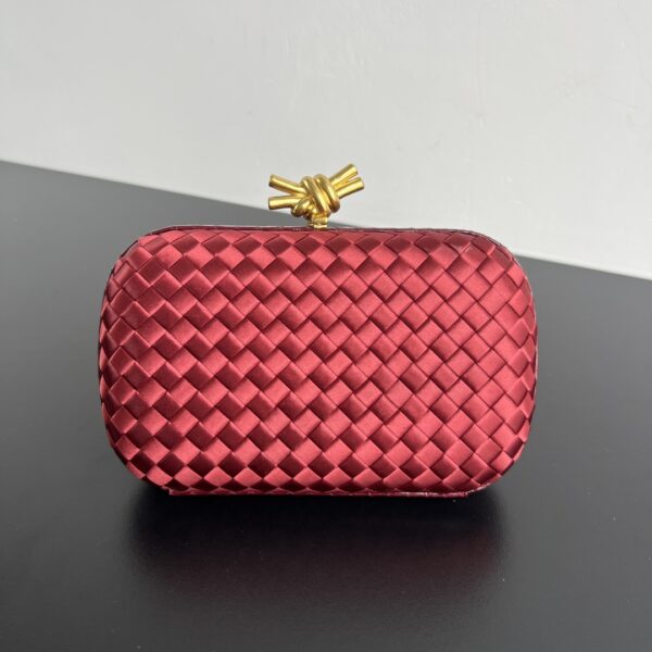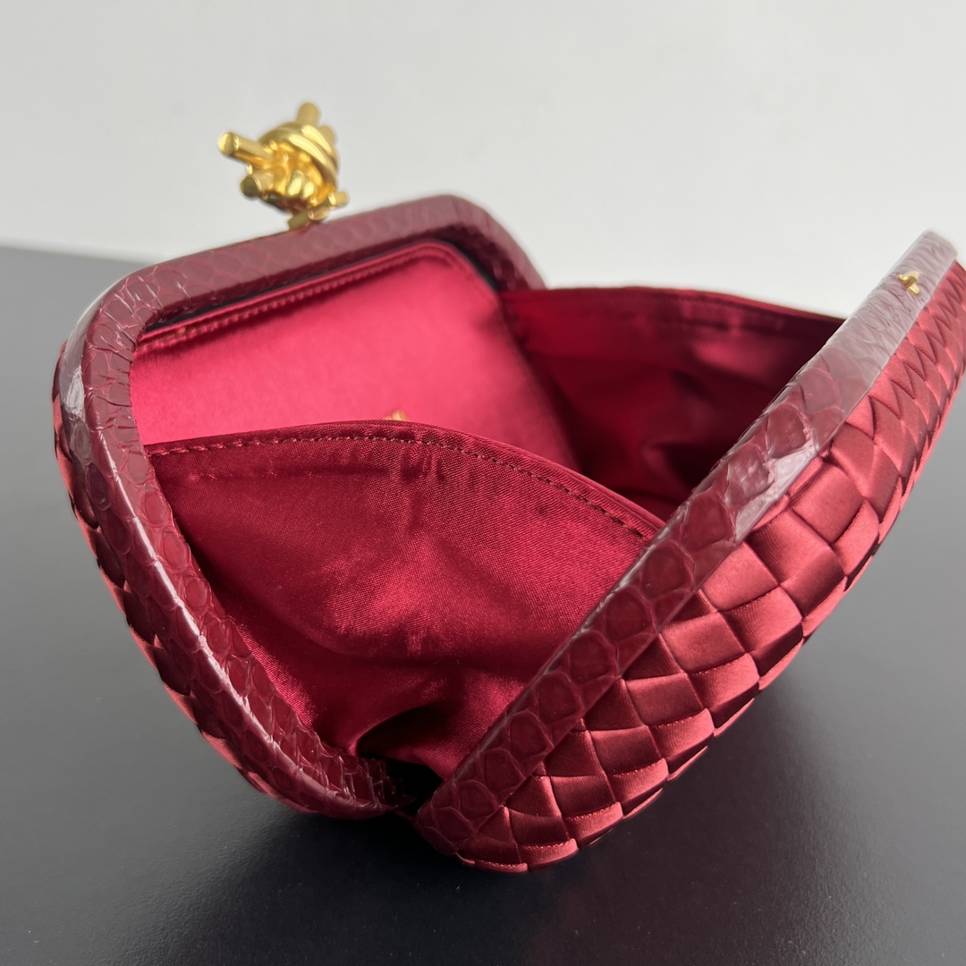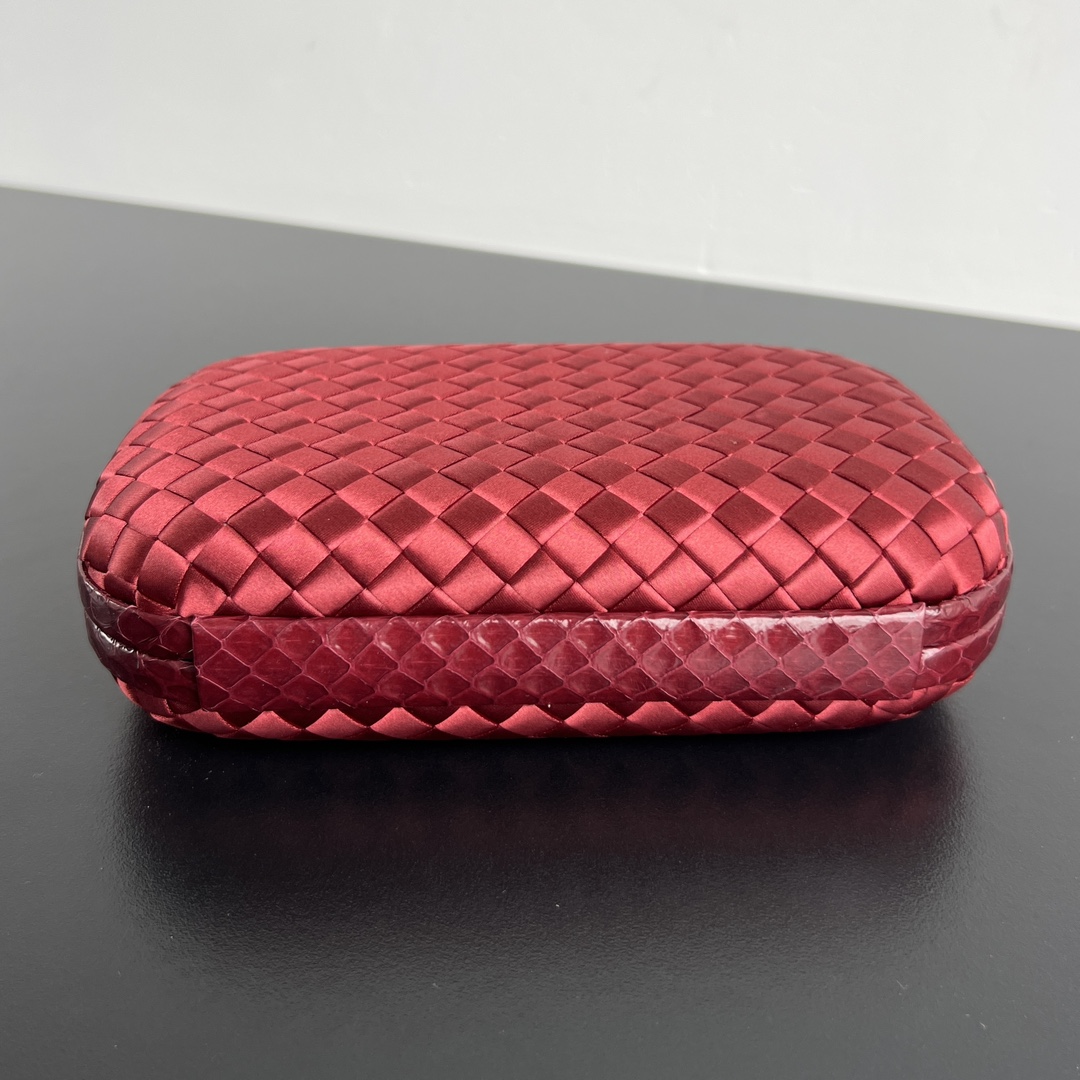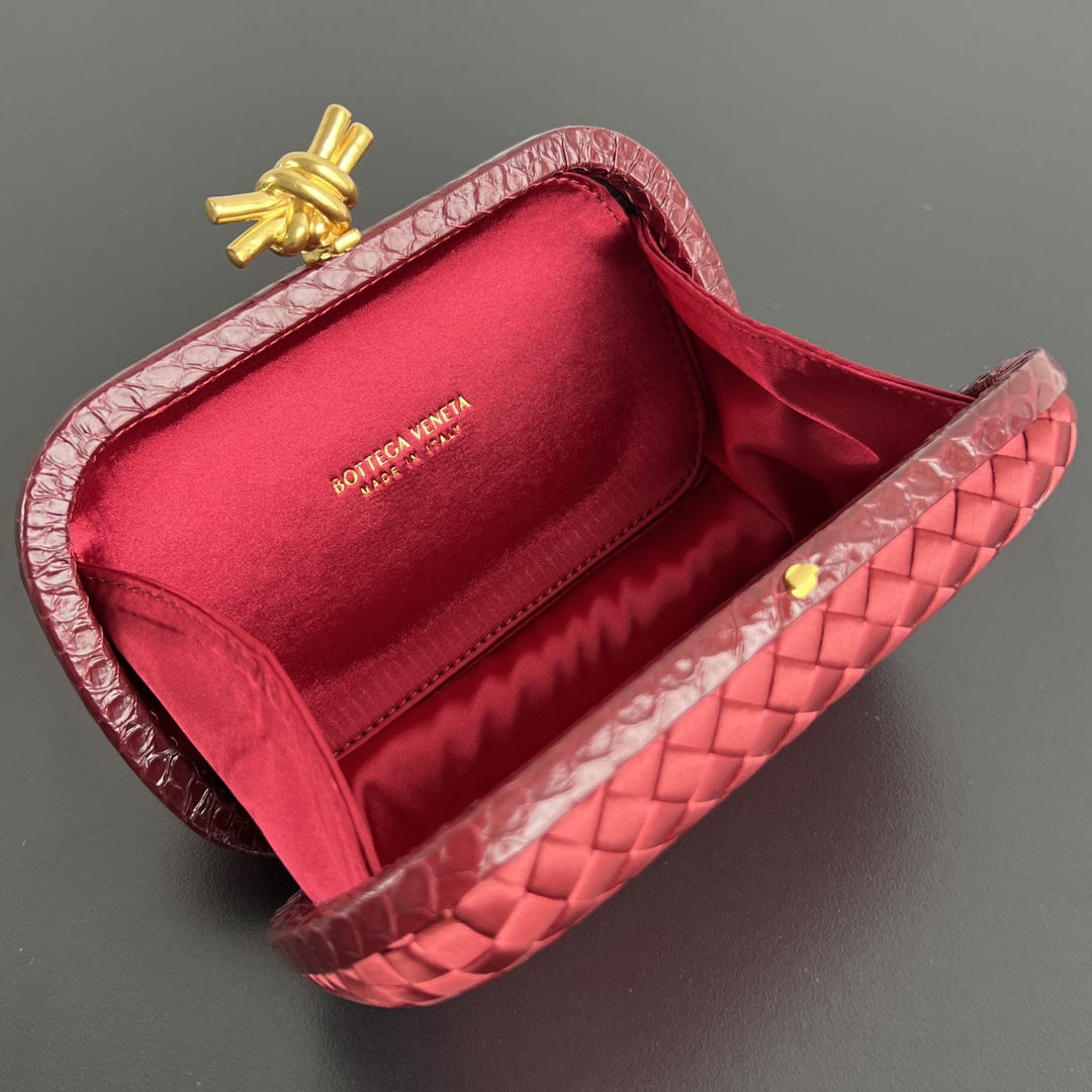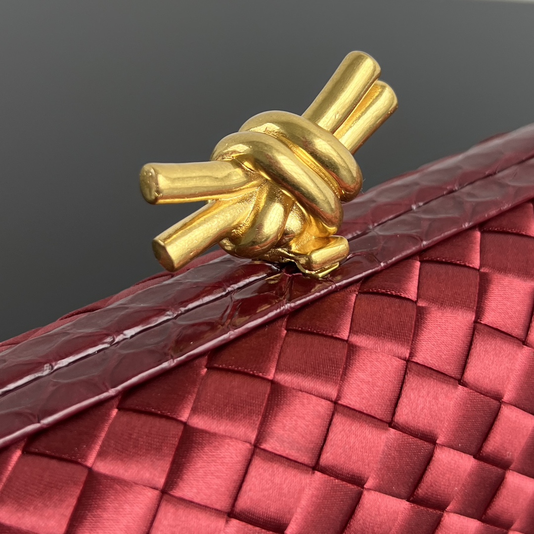BV Knot 미니 클러치는 정교한 실크 위빙과 뱀피 장식이 조화를 이루는 제품입니다.