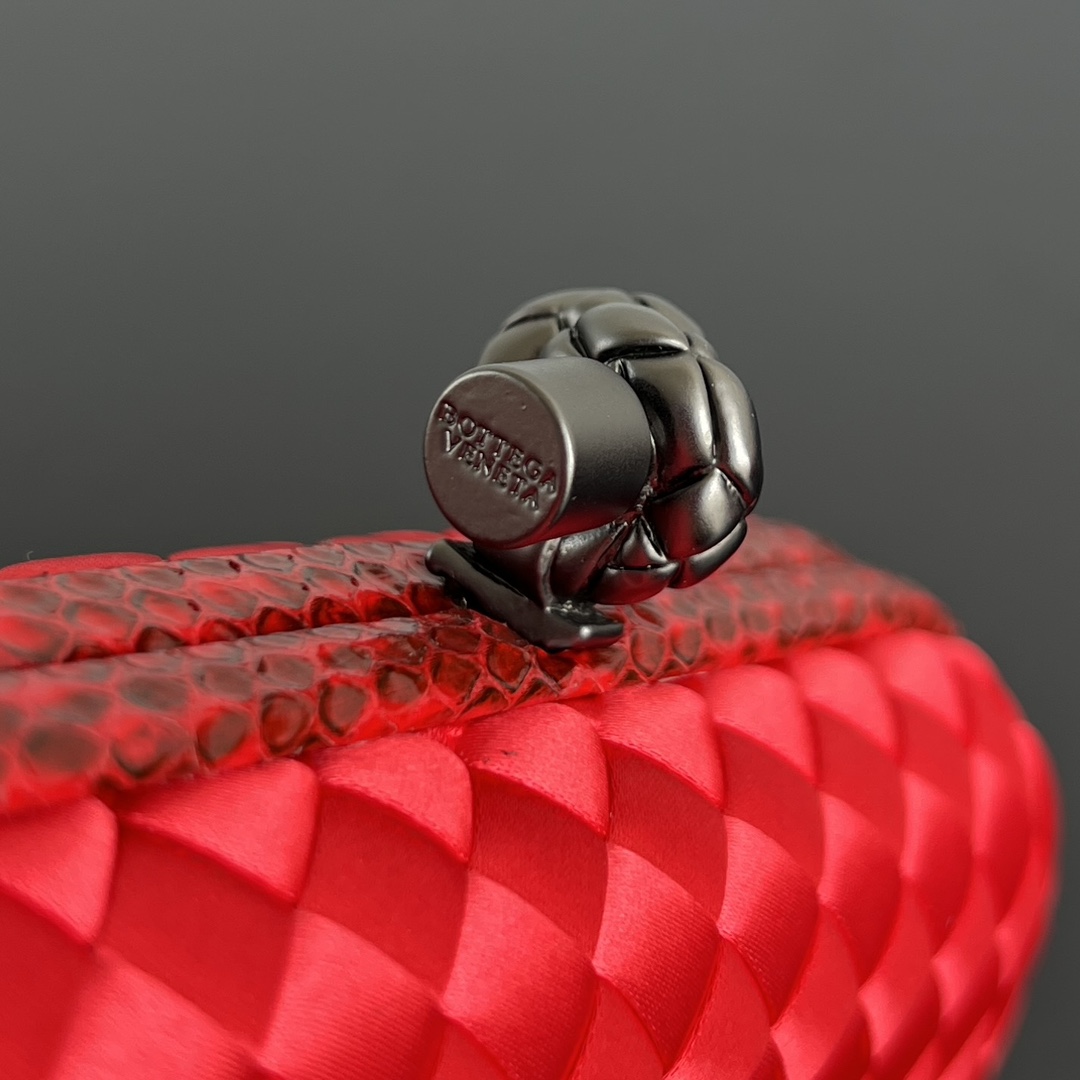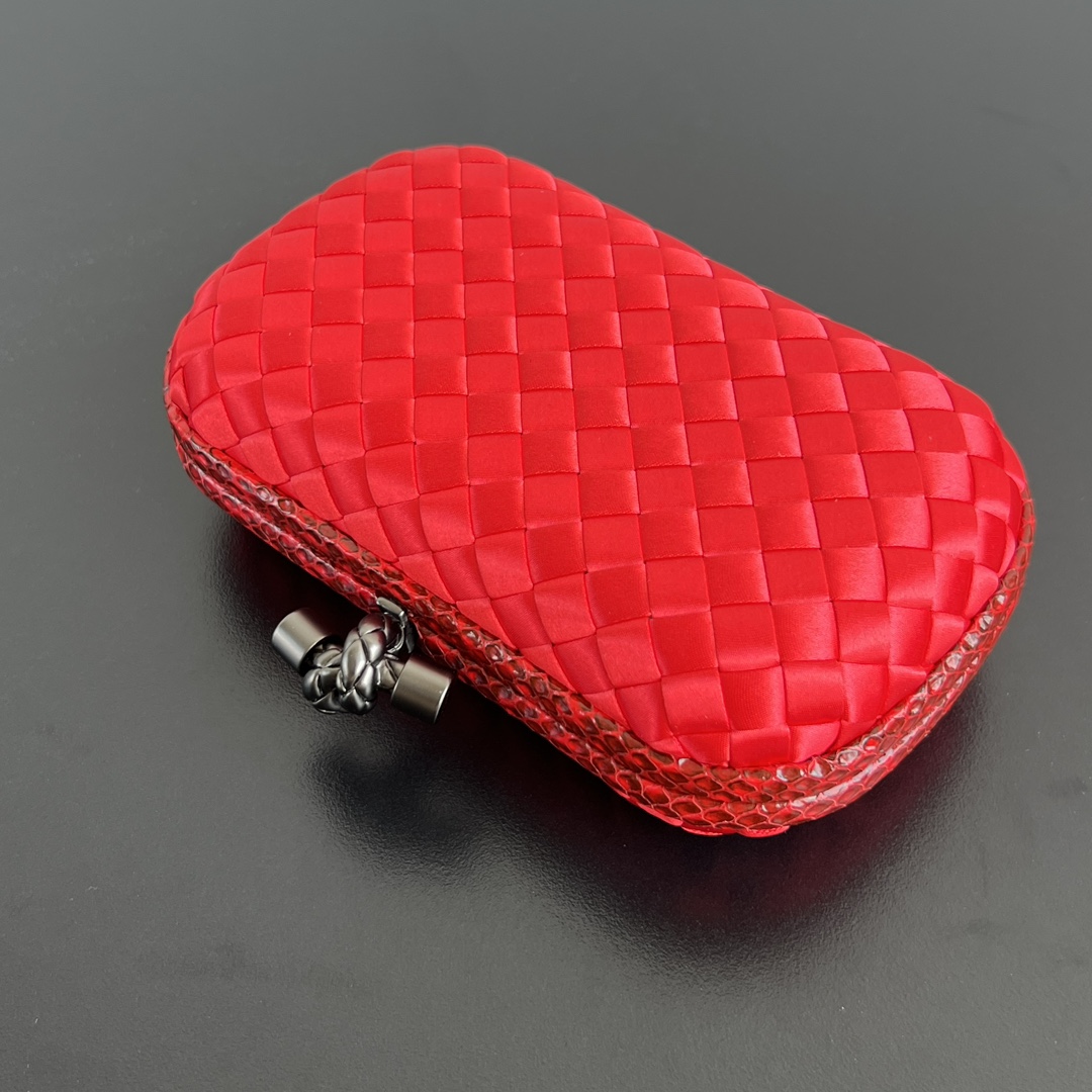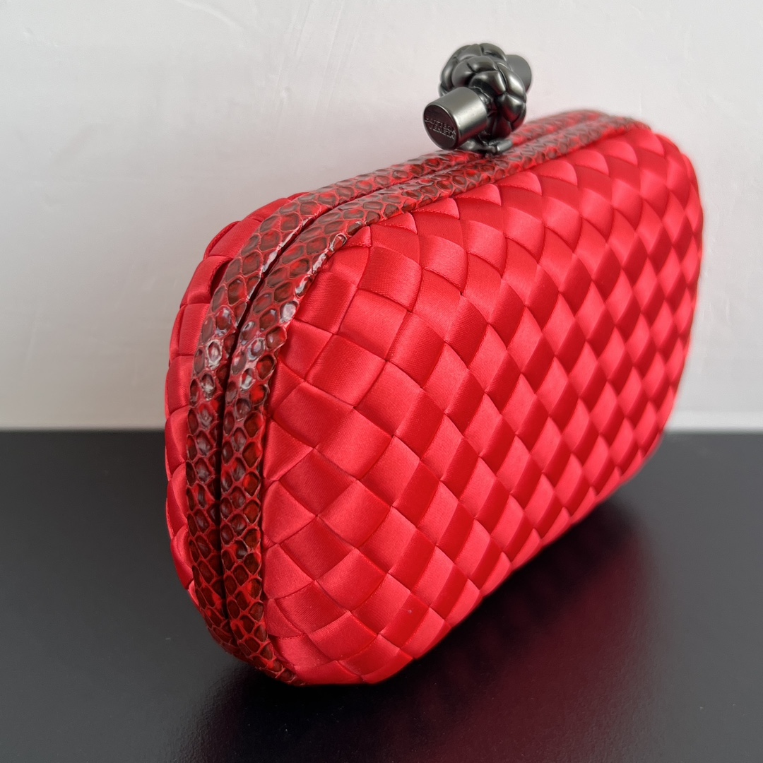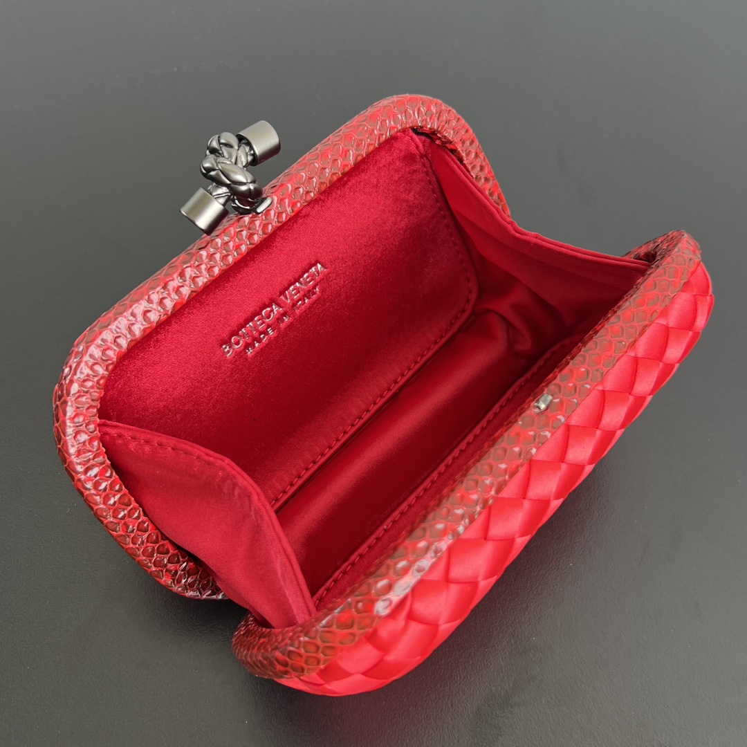 BV Knot 미니 클러치는 정교한 실크 위빙과 뱀피 장식이 조화를 이루는 제품입니다.