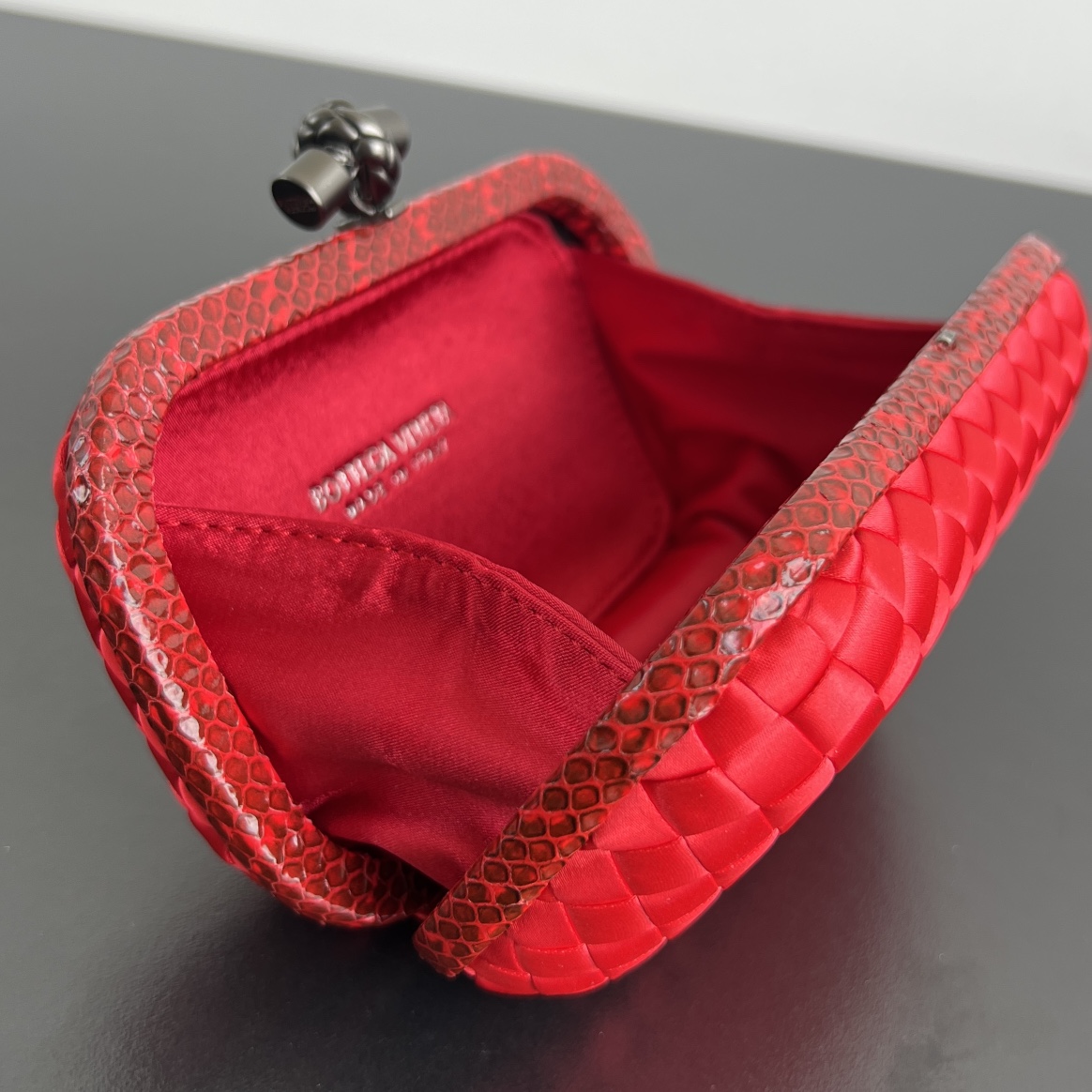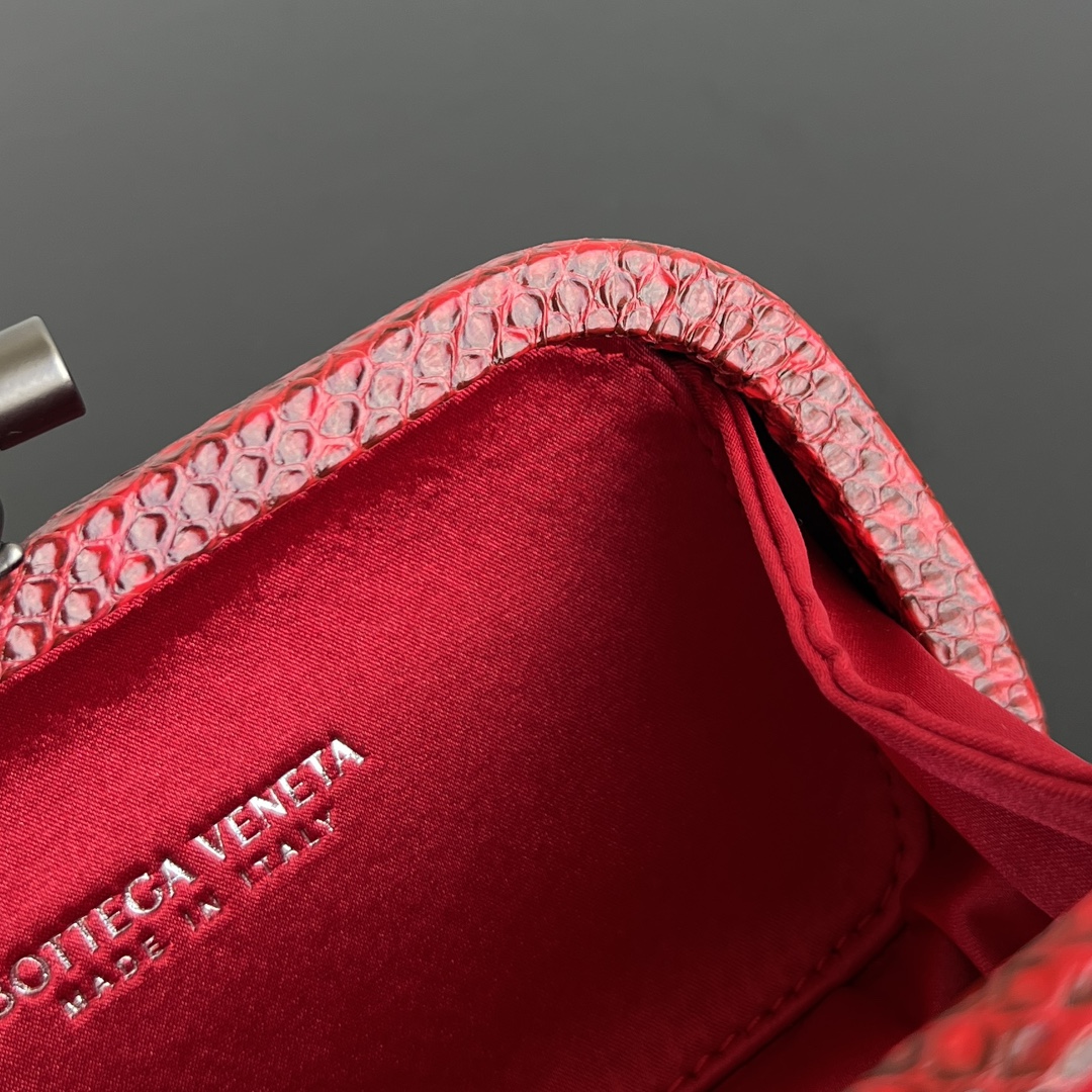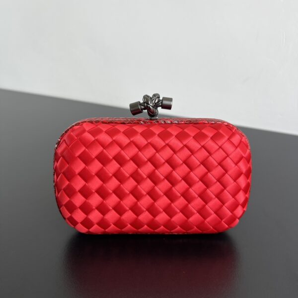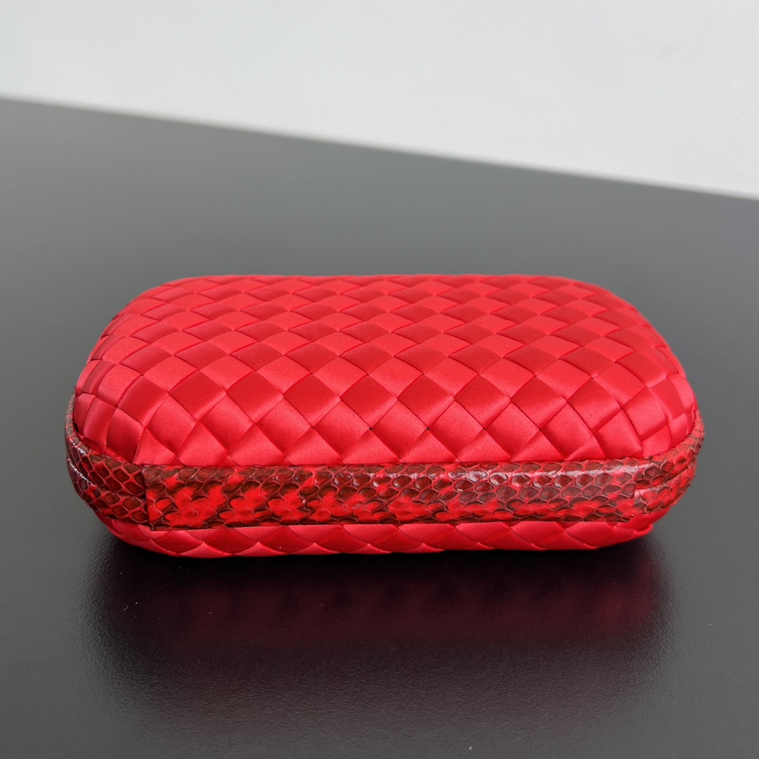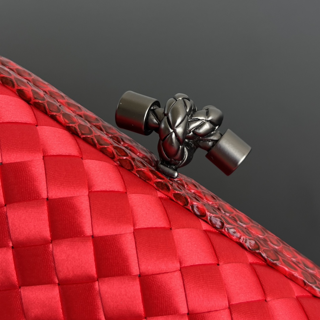 BV Knot 미니 클러치는 정교한 실크 위빙과 뱀피 장식이 조화를 이루는 제품입니다.