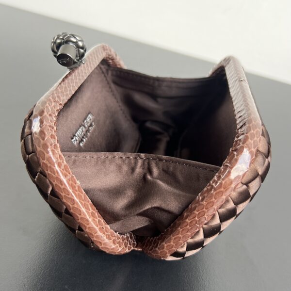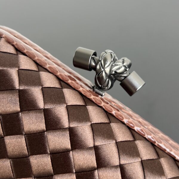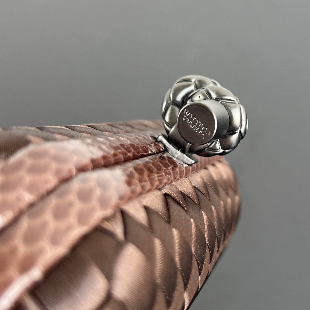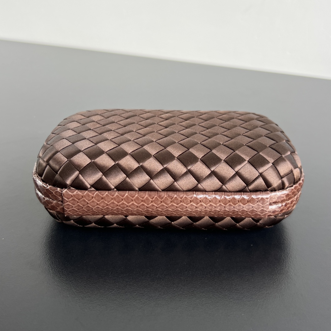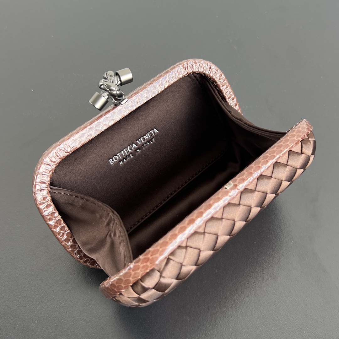 BV Knot 시리즈의 미니 클러치입니다. 고급스러운 실크 위빙과 뱀피 장식이 조화를 이루며, 부드럽고 섬세한 손길을 느낄 수 있습니다.