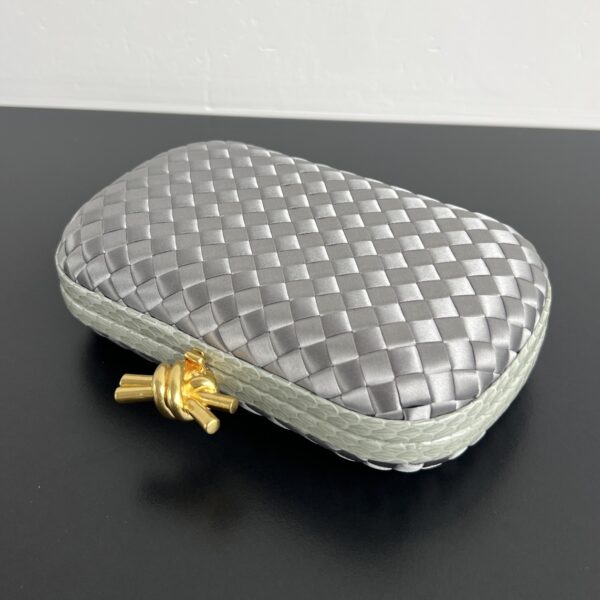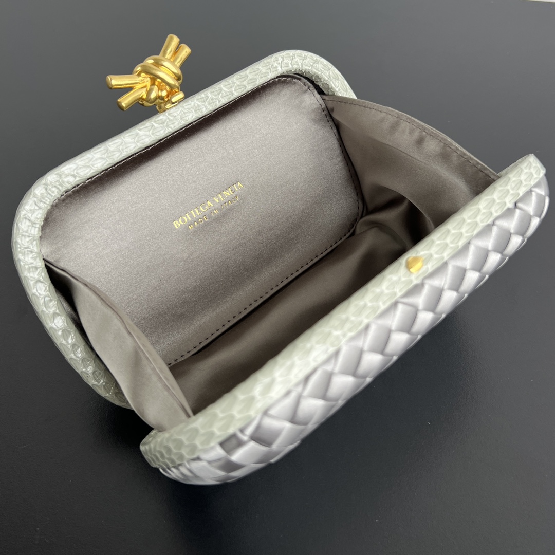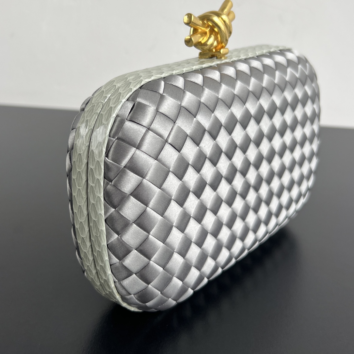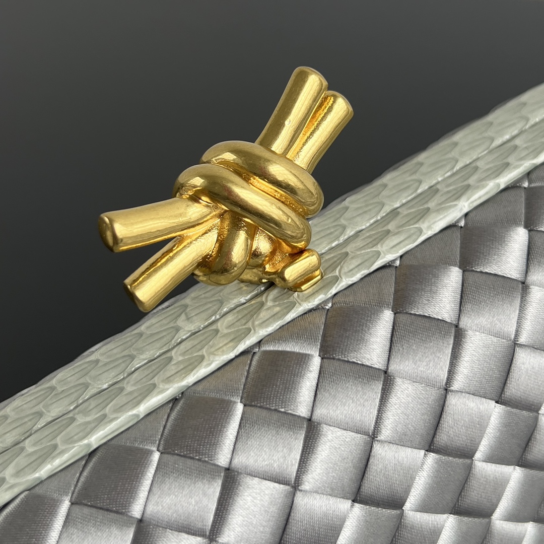 BV Knot 클러치백은 정교한 실크 위빙과 뱀피 장식이 조화를 이루는 제품입니다.