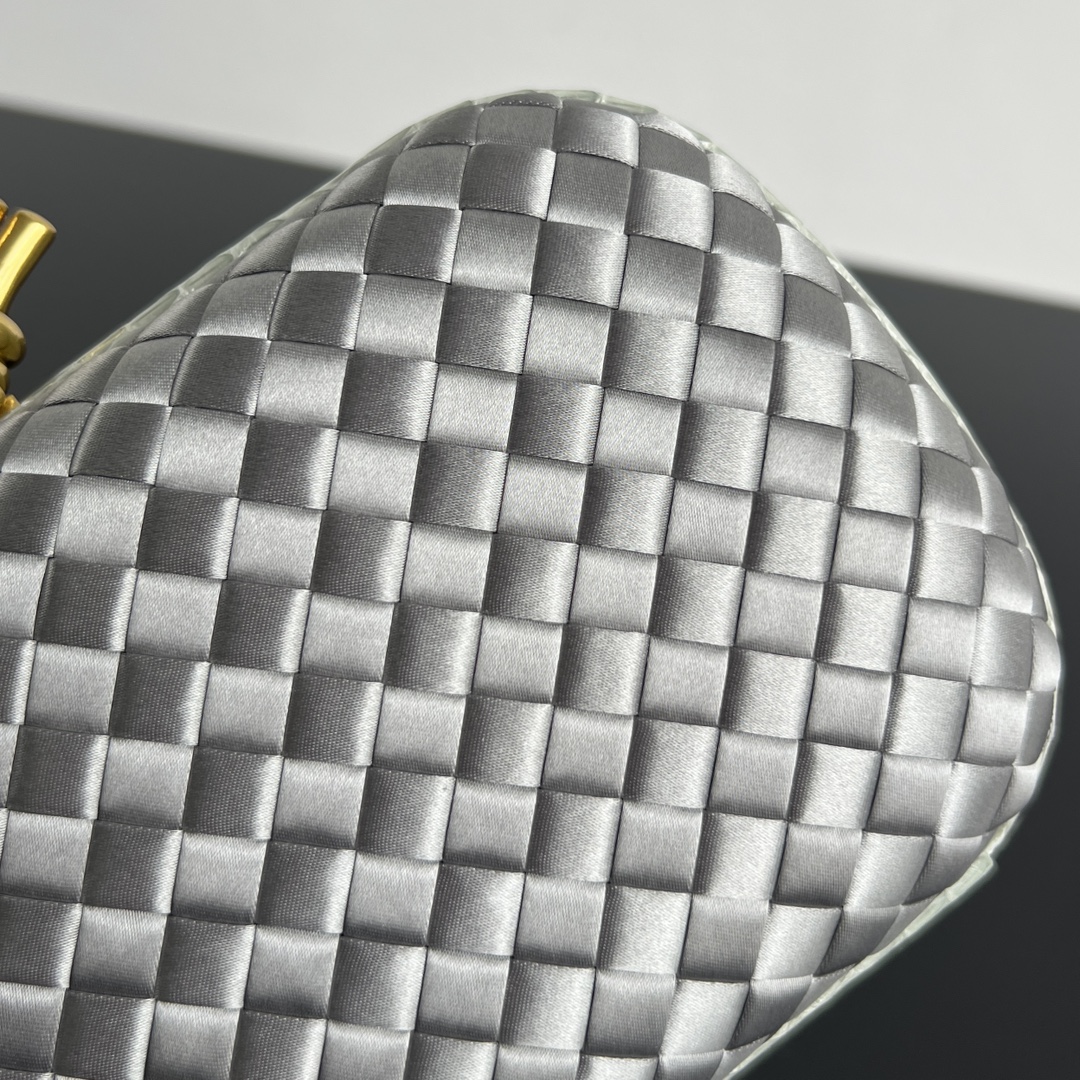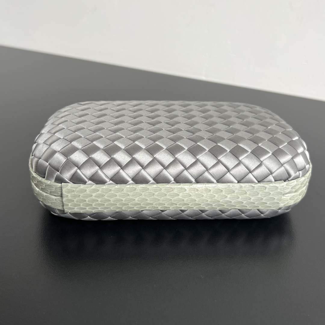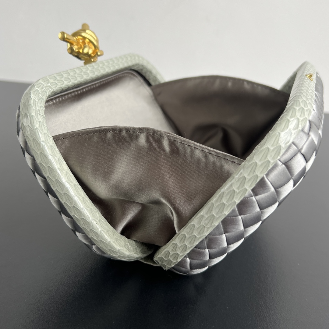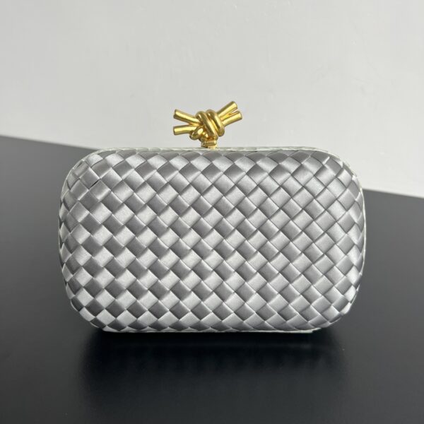 BV Knot 클러치백은 정교한 실크 위빙과 뱀피 장식이 조화를 이루는 제품입니다.