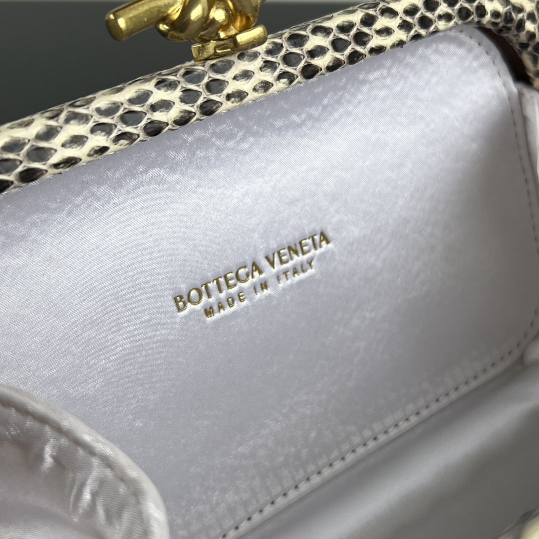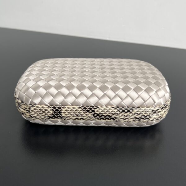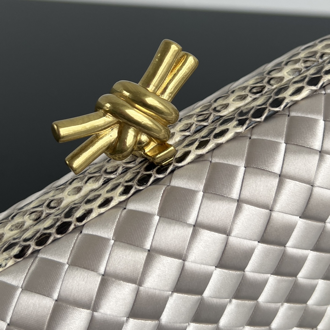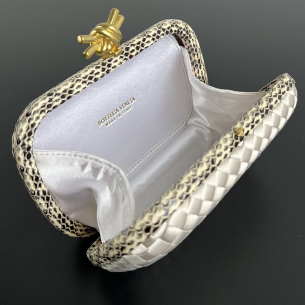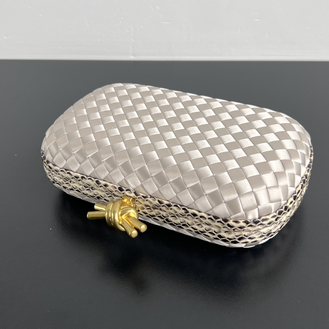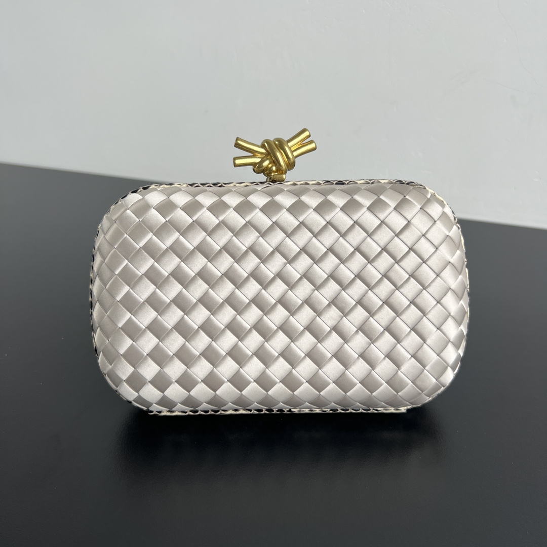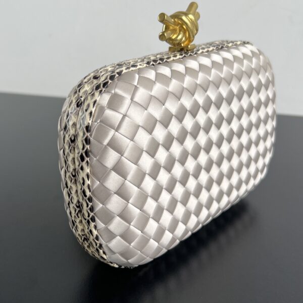 BV Knot 미니 클러치는 고급스러운 실버 색상으로, 세련된 디자인이 돋보입니다.