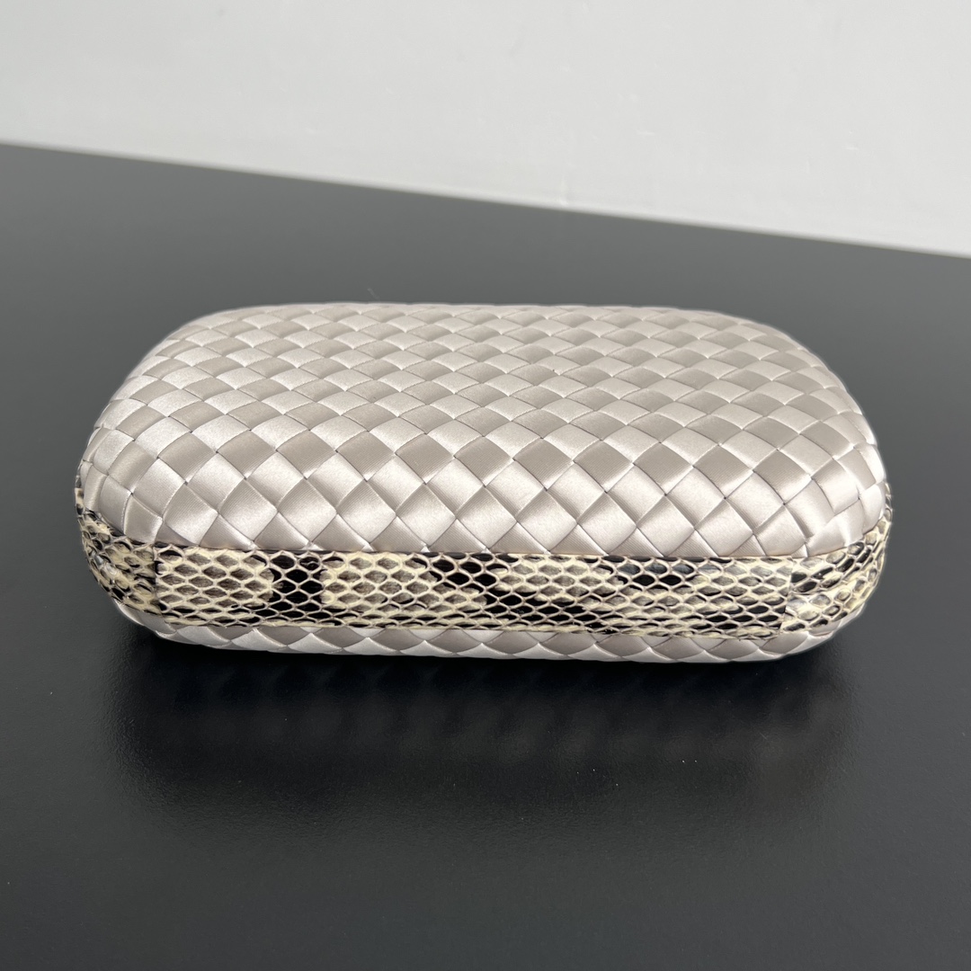 부드러운 실크 위빙과 뱀피 장식이 조화를 이루어 우아한 느낌을 더해줍니다. 손에 쥐었을 때의 촉감이 부드럽고 섬세하여, 특별한 날에 잘 어울립니다.