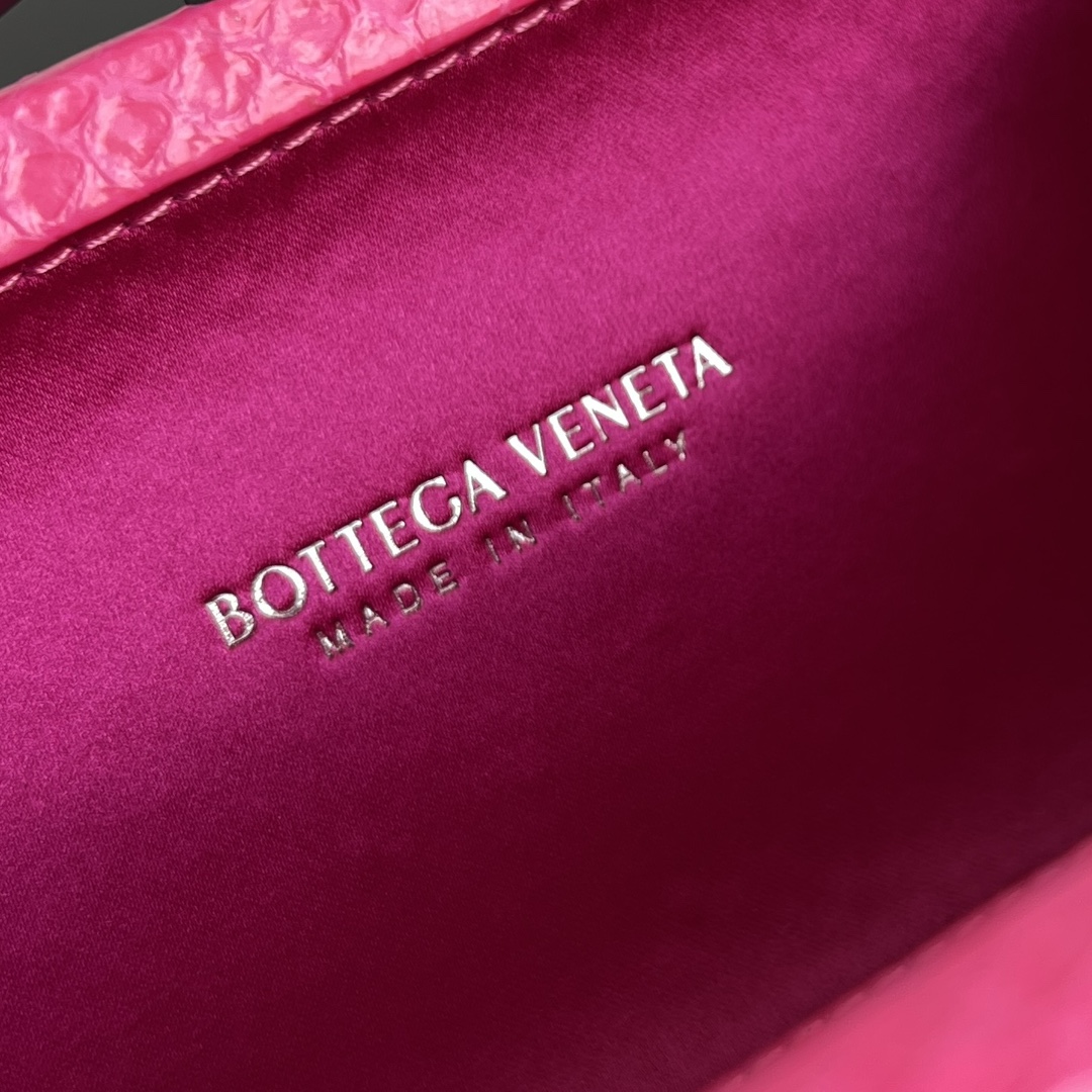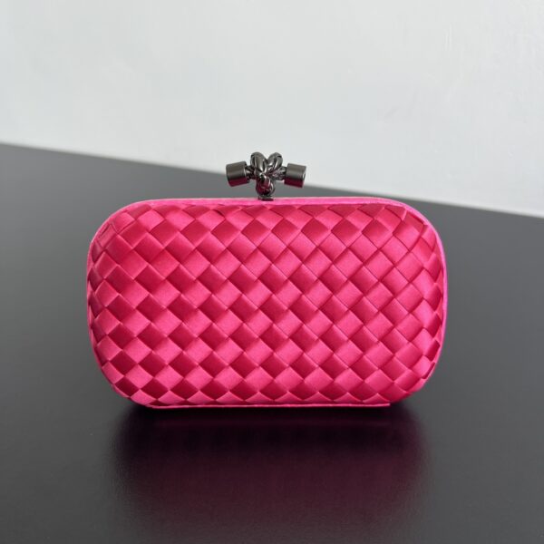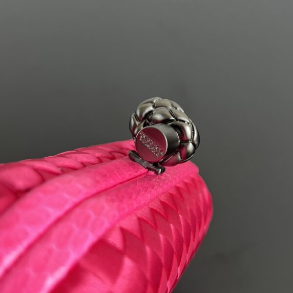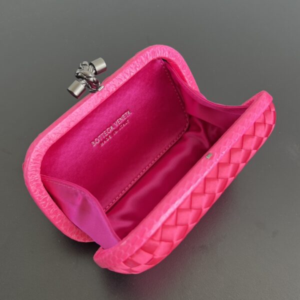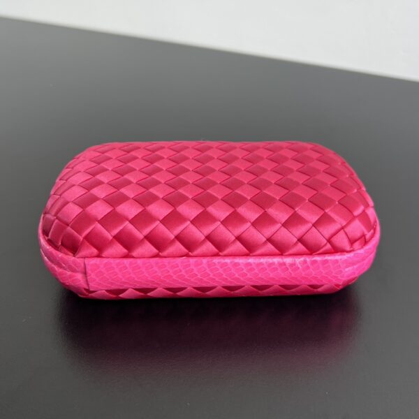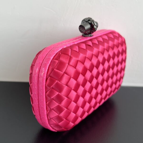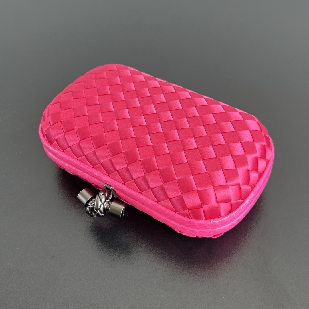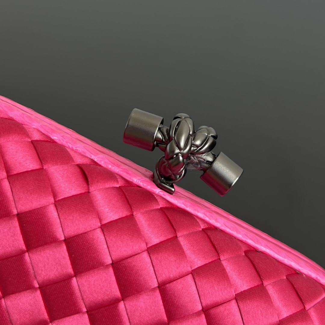 BV Knot 미니 클러치는 정교한 실크 위빙과 뱀피 장식이 조화를 이루는 제품입니다.