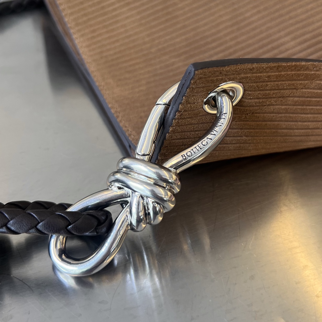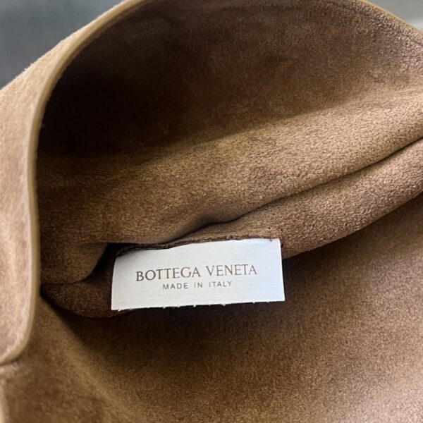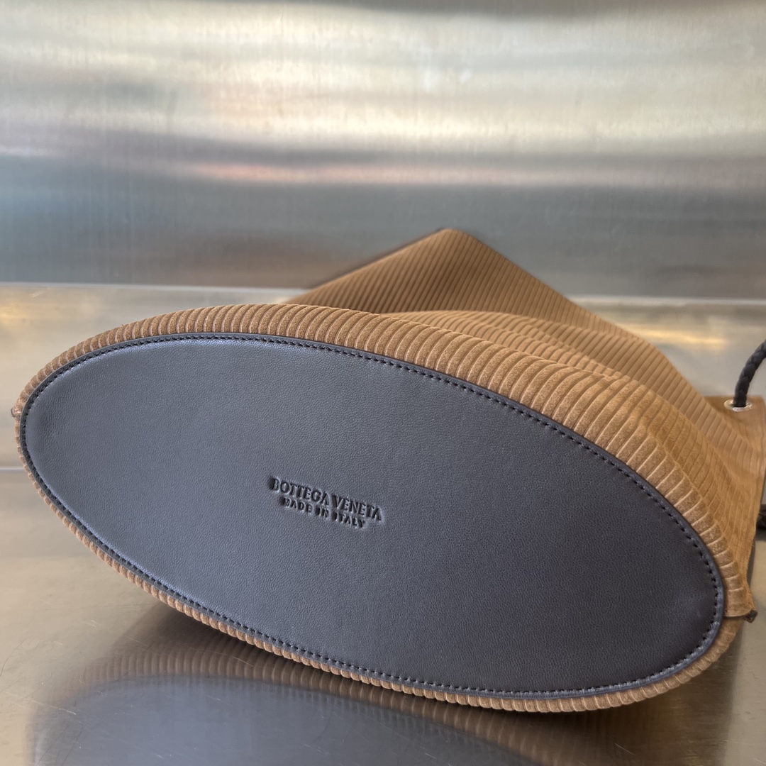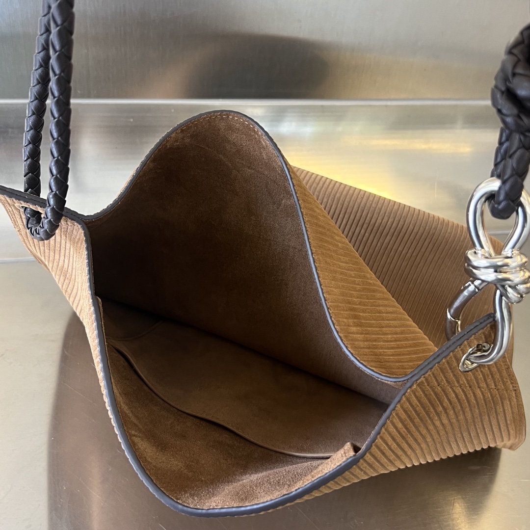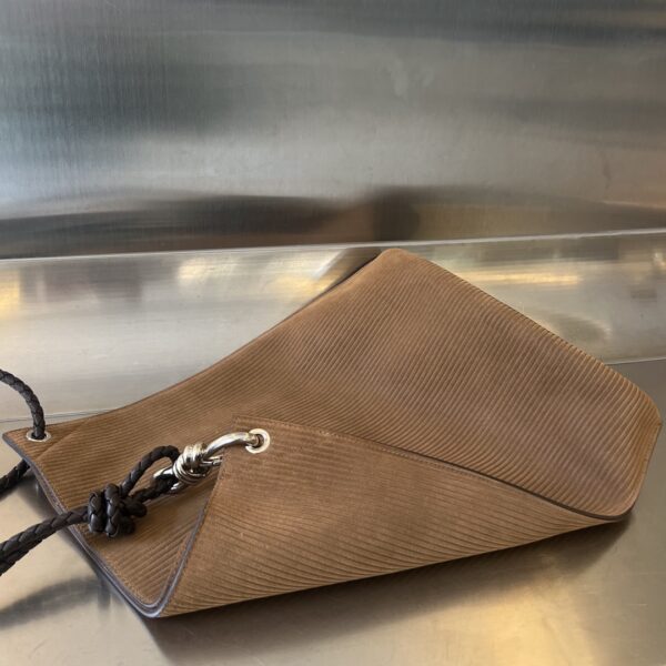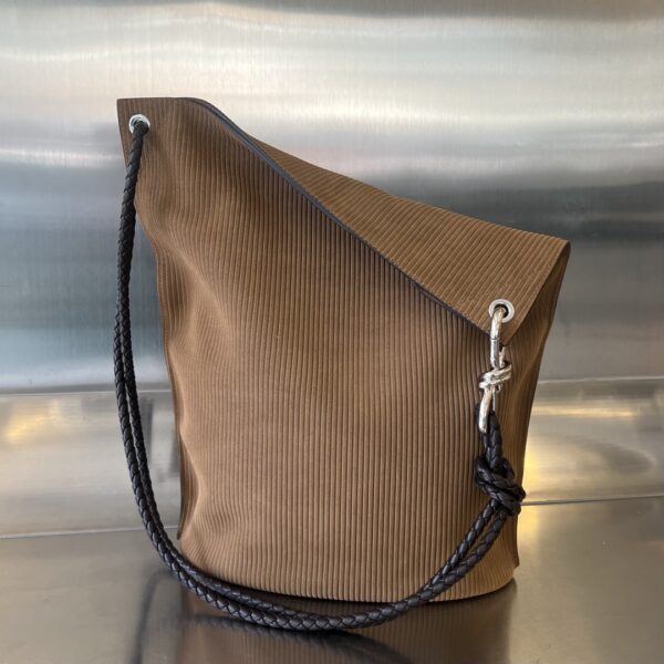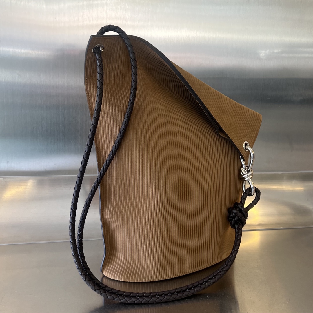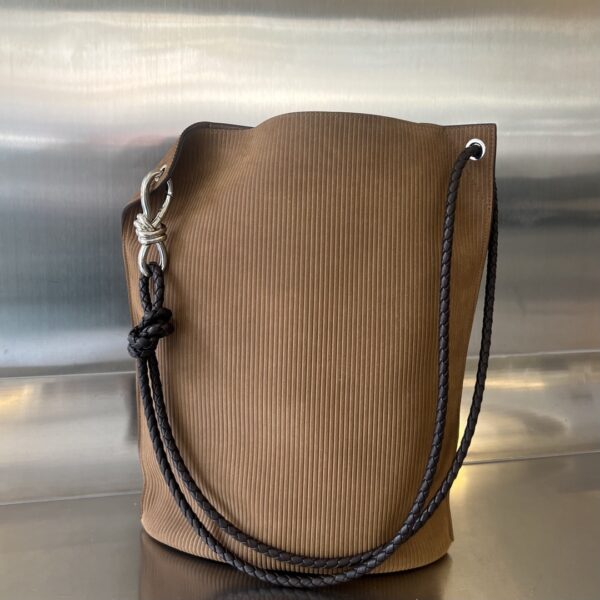 부드러운 벨벳 소재로 제작된 Bv Knot 버킷백입니다. 따뜻한 브라운 색상이 겨울철에 잘 어울리며, 고급스러운 질감이 특징입니다.
