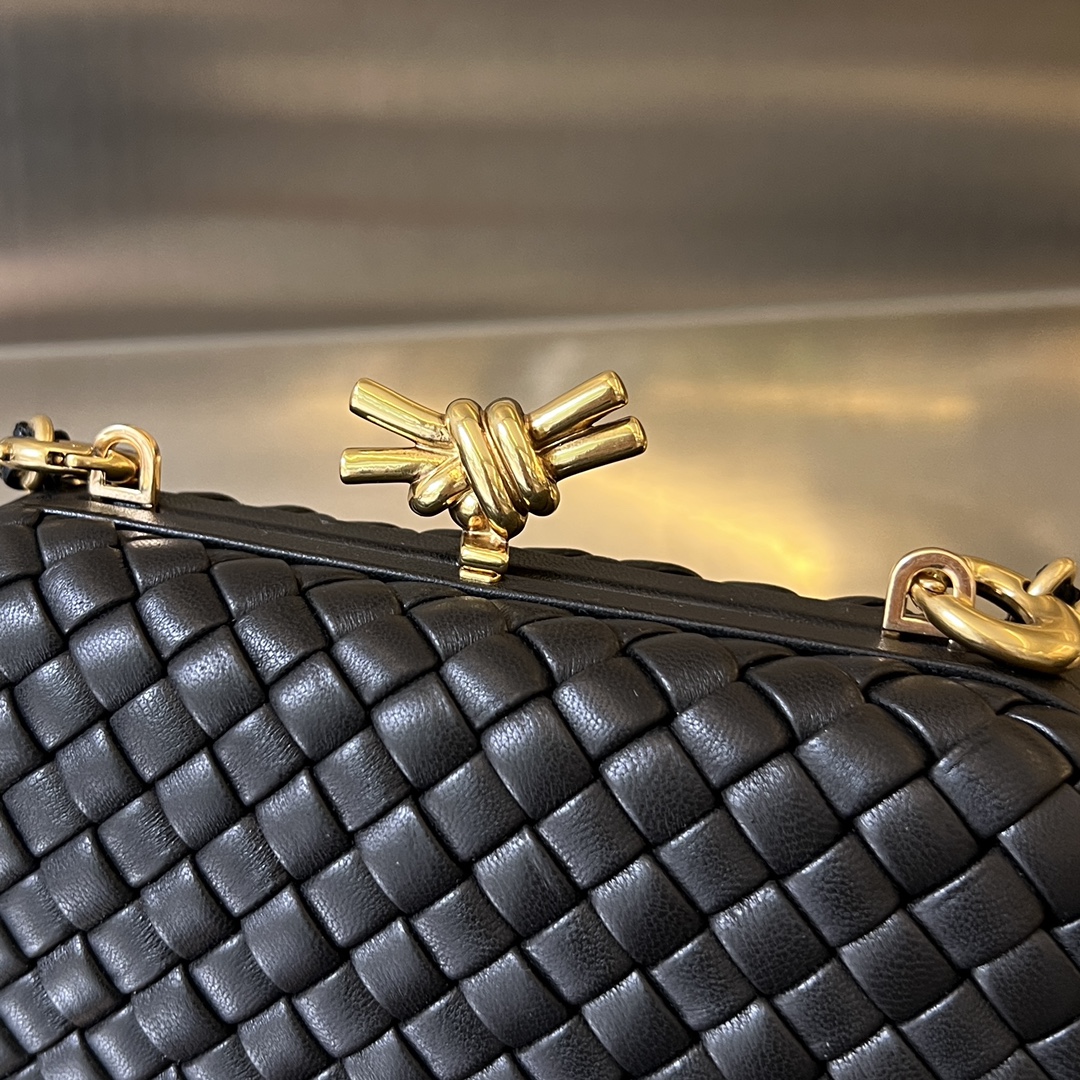 BV Knot 체인 클러치는 보테가의 상징적인 편직 텍스처와 금속 결합이 돋보이는 제품입니다.