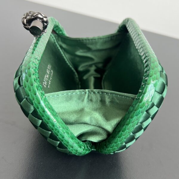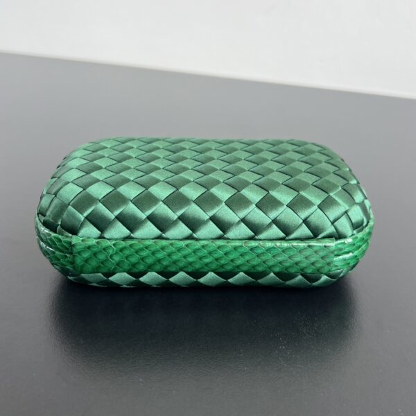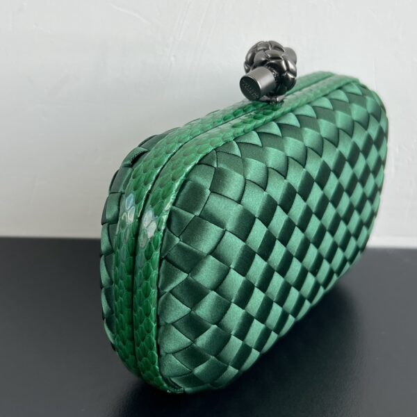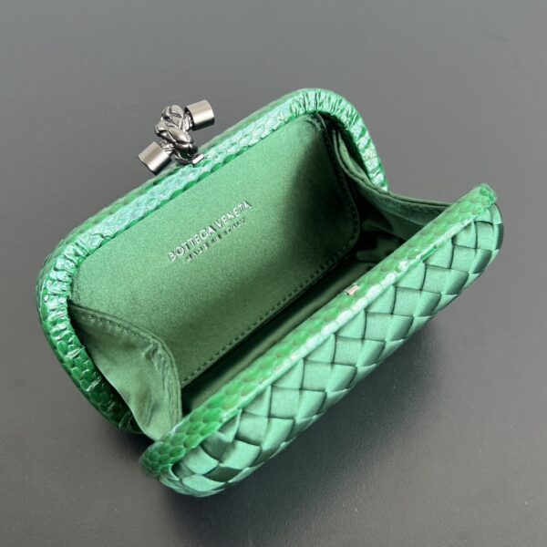 BV Knot 편직 클러치 백은 정교한 실크 편직과 뱀피 장식이 조화를 이루어 우아한 매력을 발산합니다.