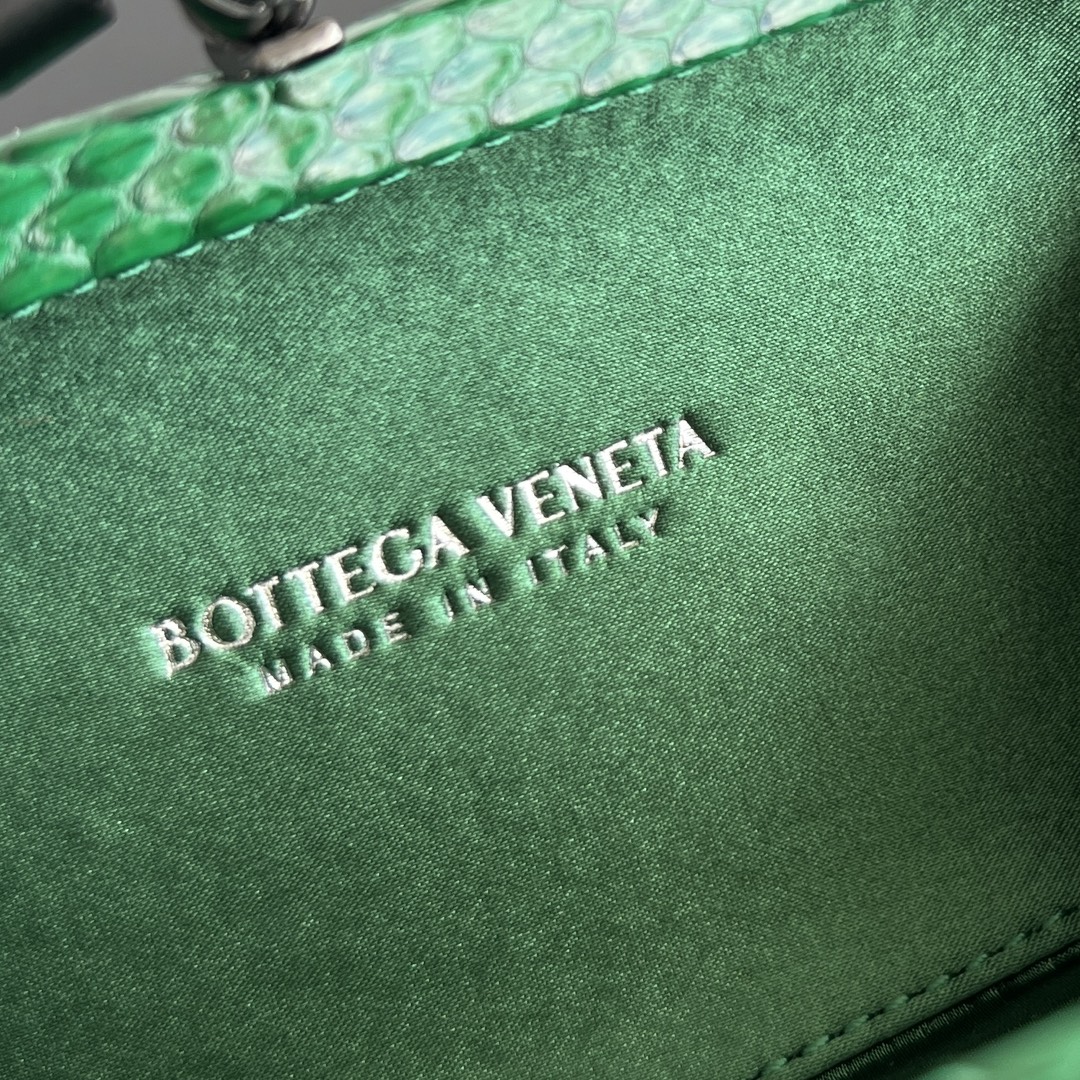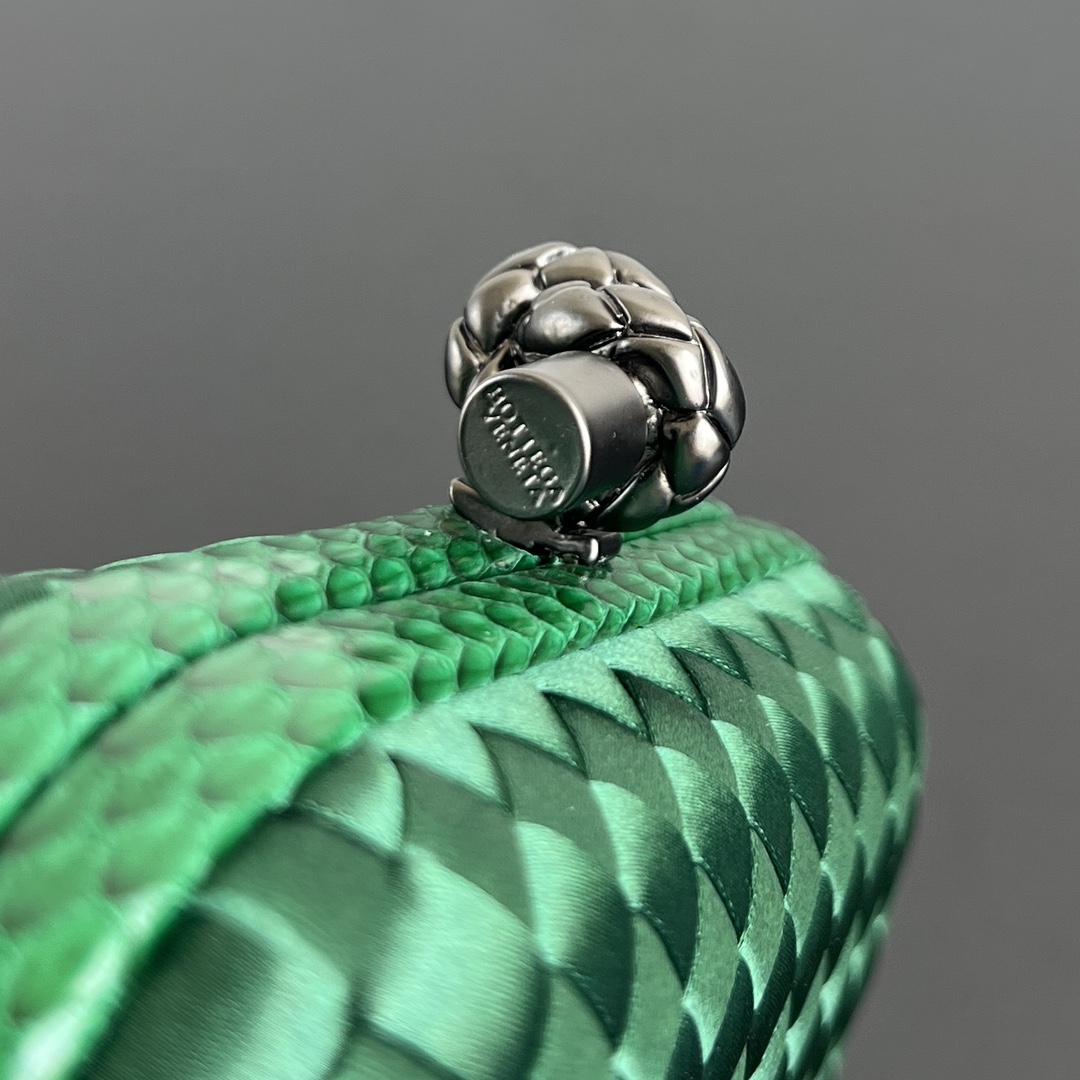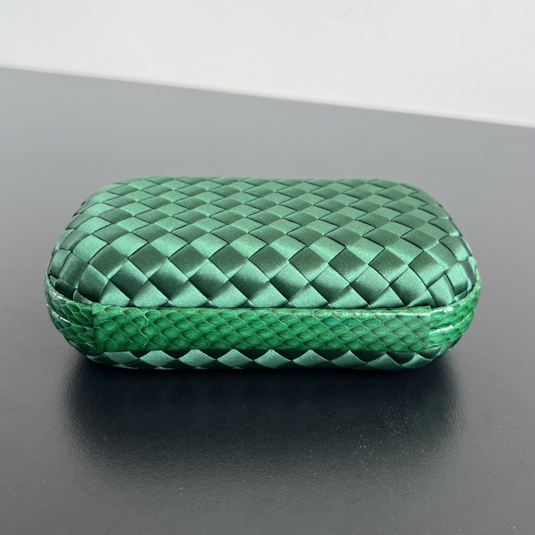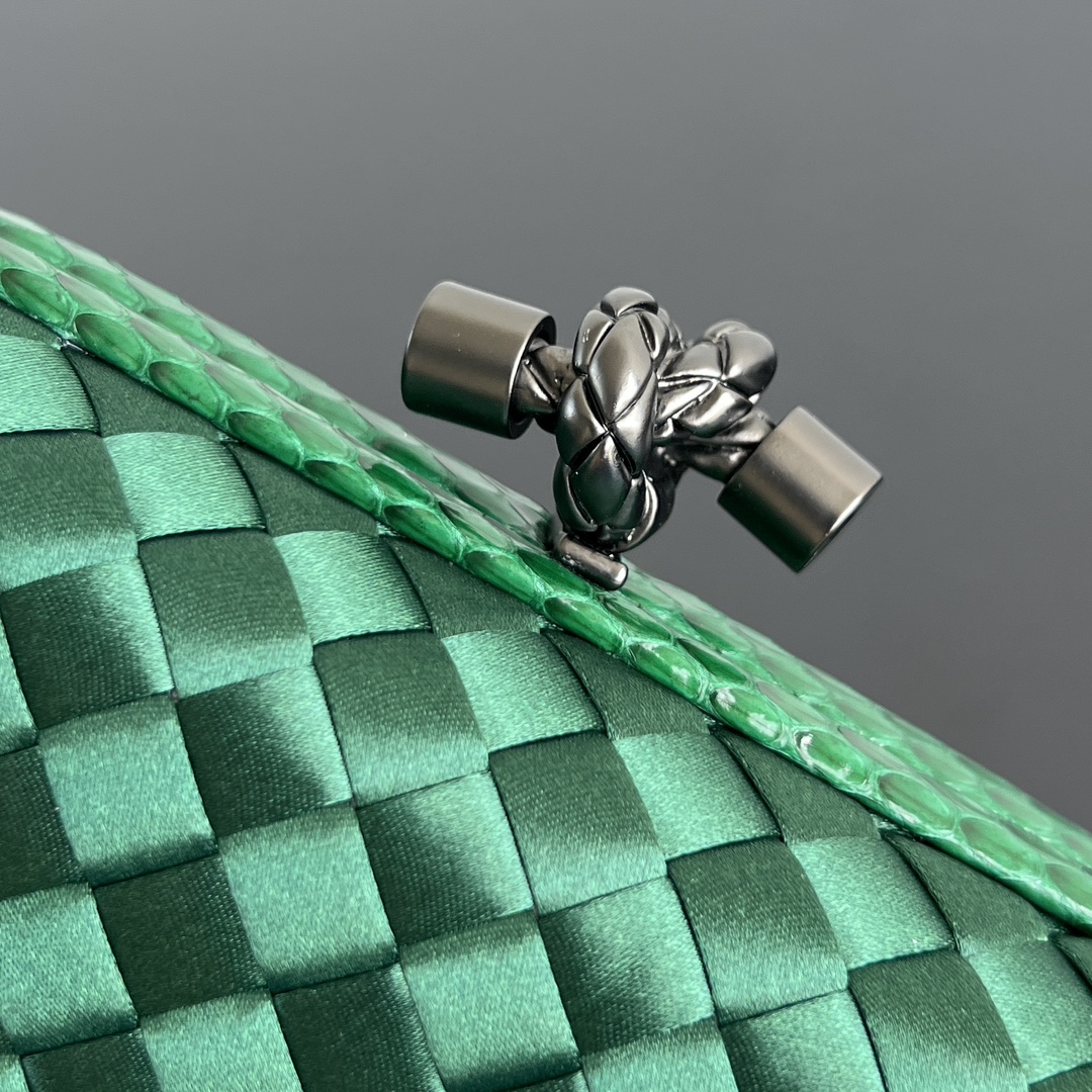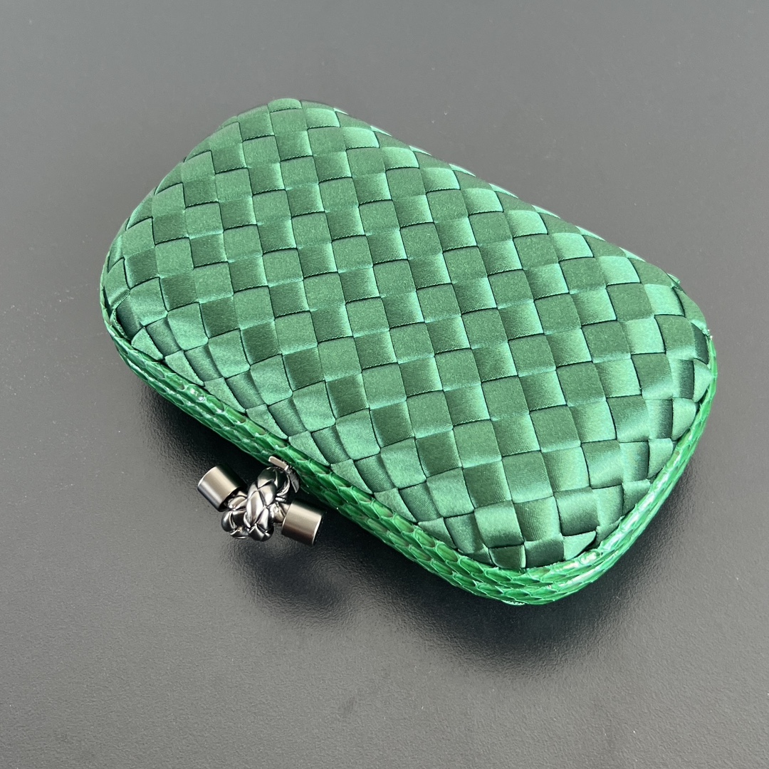 BV Knot 편직 클러치 백은 정교한 실크 편직과 뱀피 장식이 조화를 이루어 우아한 매력을 발산합니다.