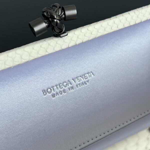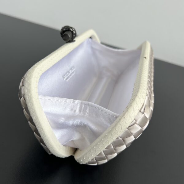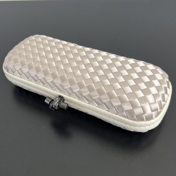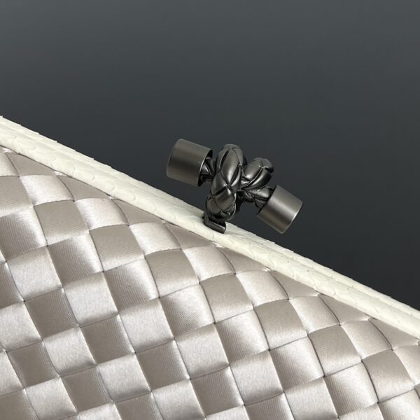 고급스러운 실크 편직으로 제작된 이 손가방은 화려한 파티 분위기를 연출합니다.
